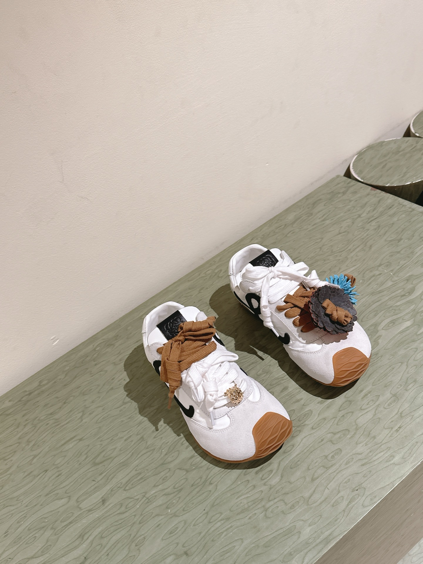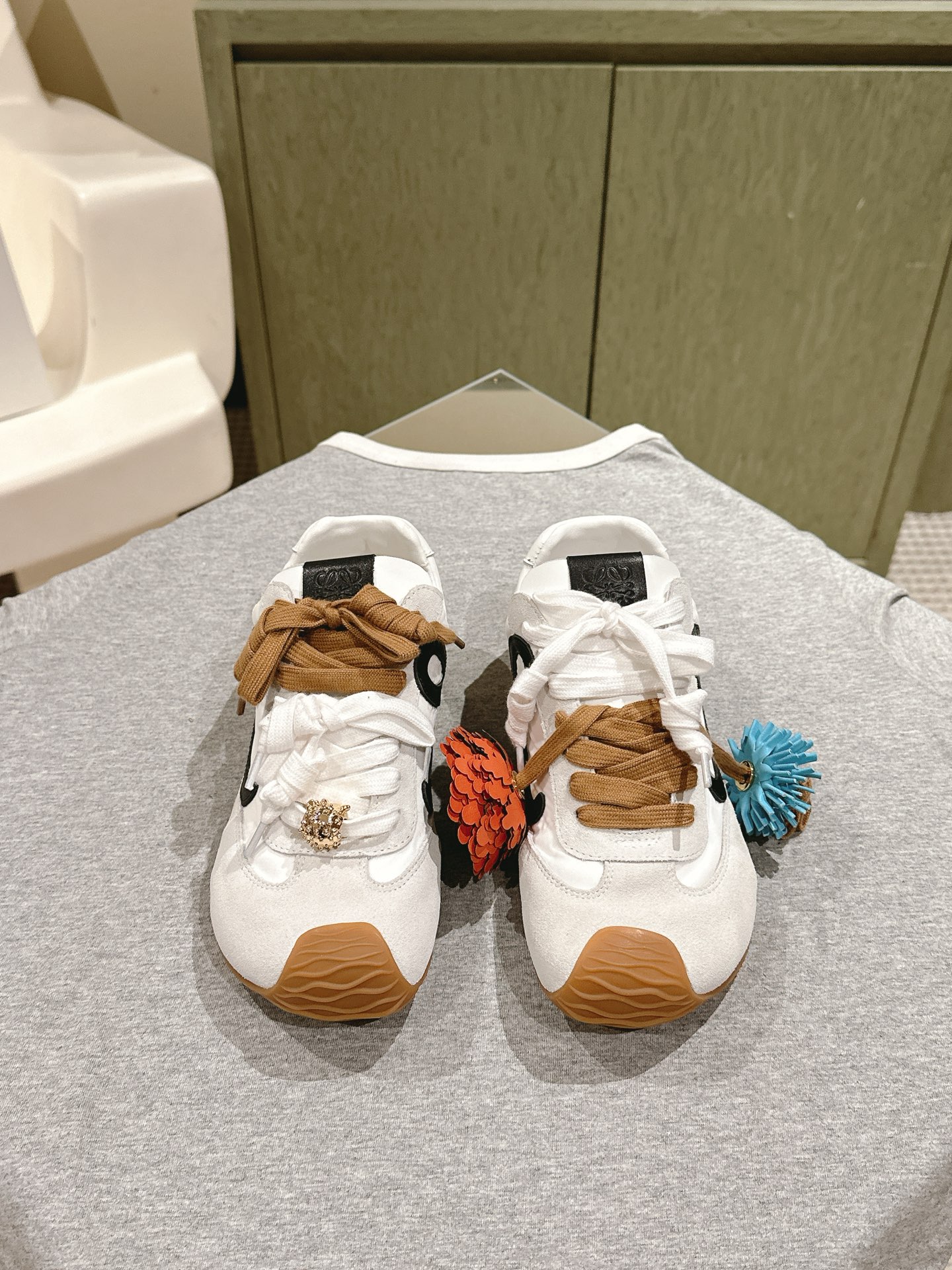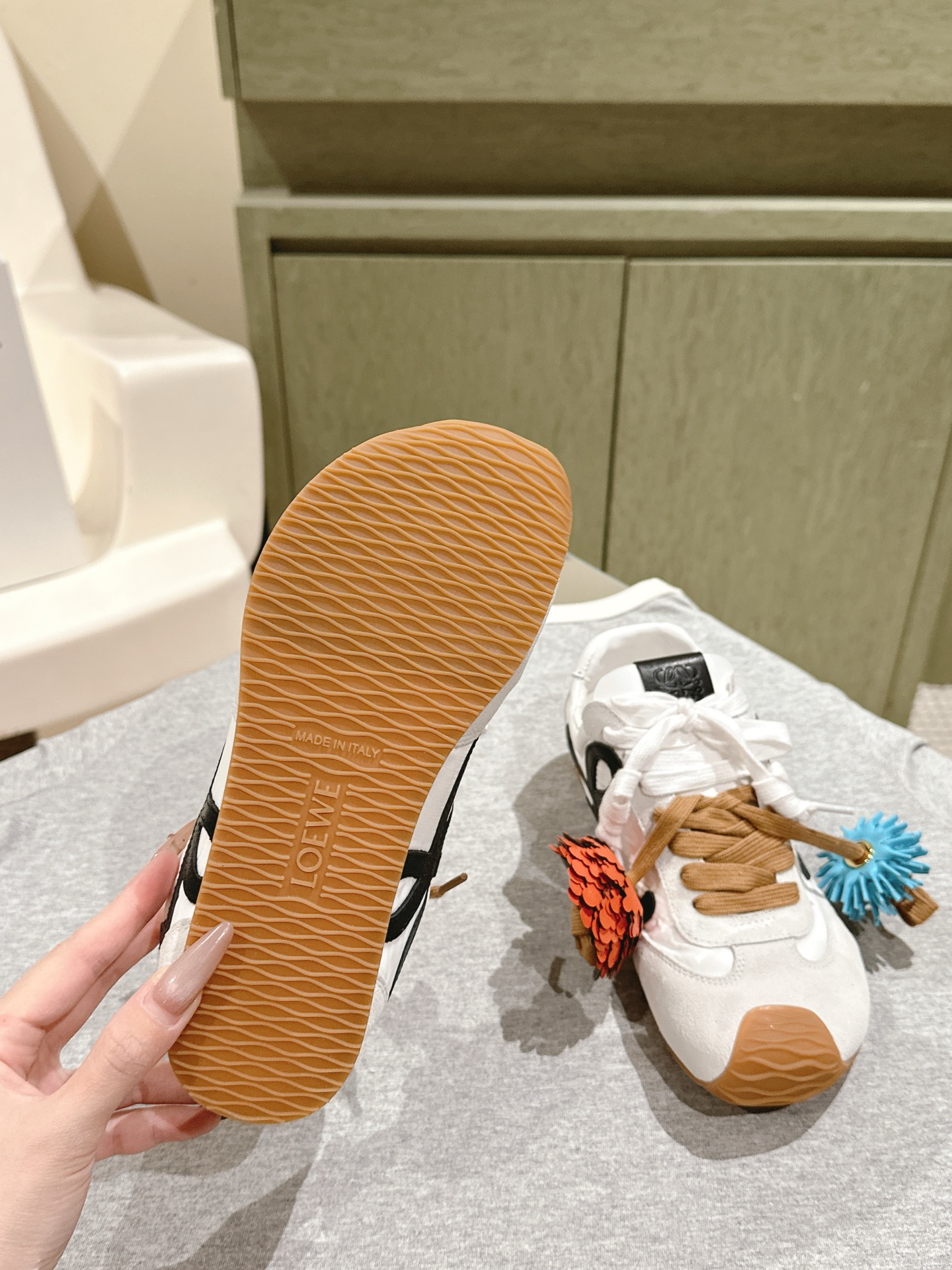 这款鞋子是AAAAA 1:1 质量 (非常棒). 使用了和原版一模一样的材料. 商标部分也保持了和罗意威/Loewe一样. 图片拍摄是实物鞋子拍摄, 您所收到的实物保证和我们图片一模一样.