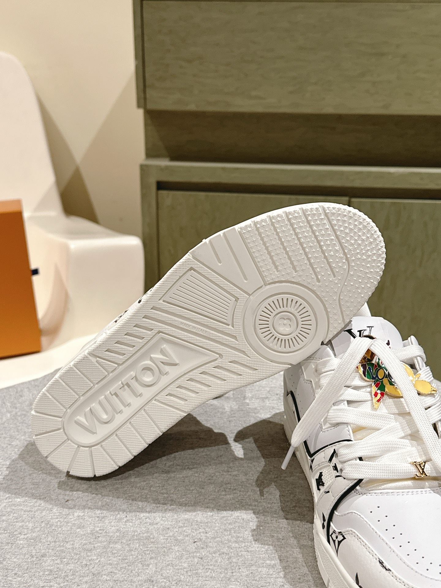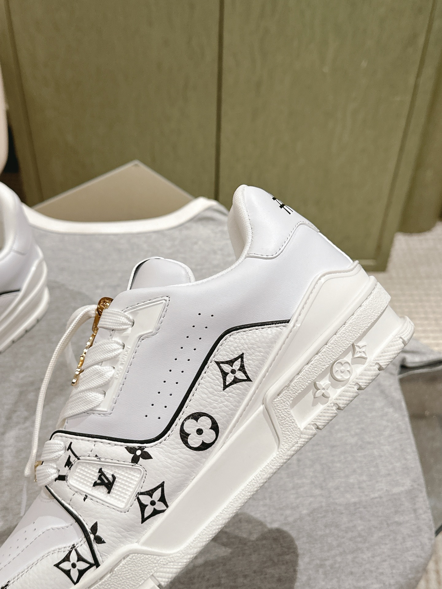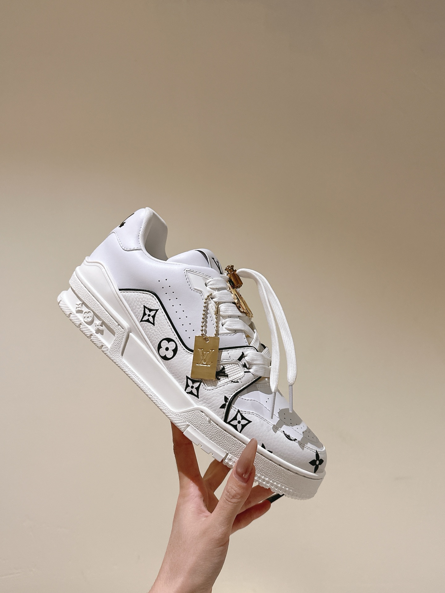 这款鞋子是AAAAA 1:1 质量 (非常棒). 使用了和原版一模一样的材料. 商标部分也保持了和路易威登/Louis Vuitton一样. 图片拍摄是实物鞋子拍摄, 您所收到的实物保证和我们图片一模一样.
