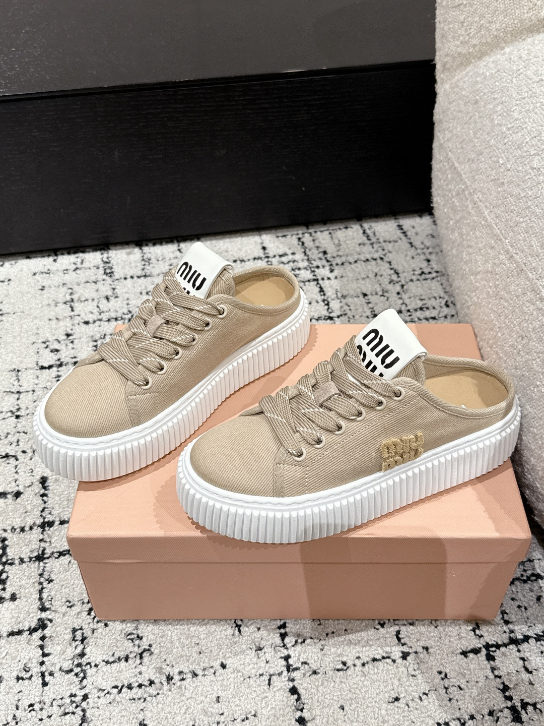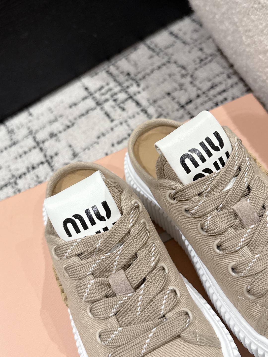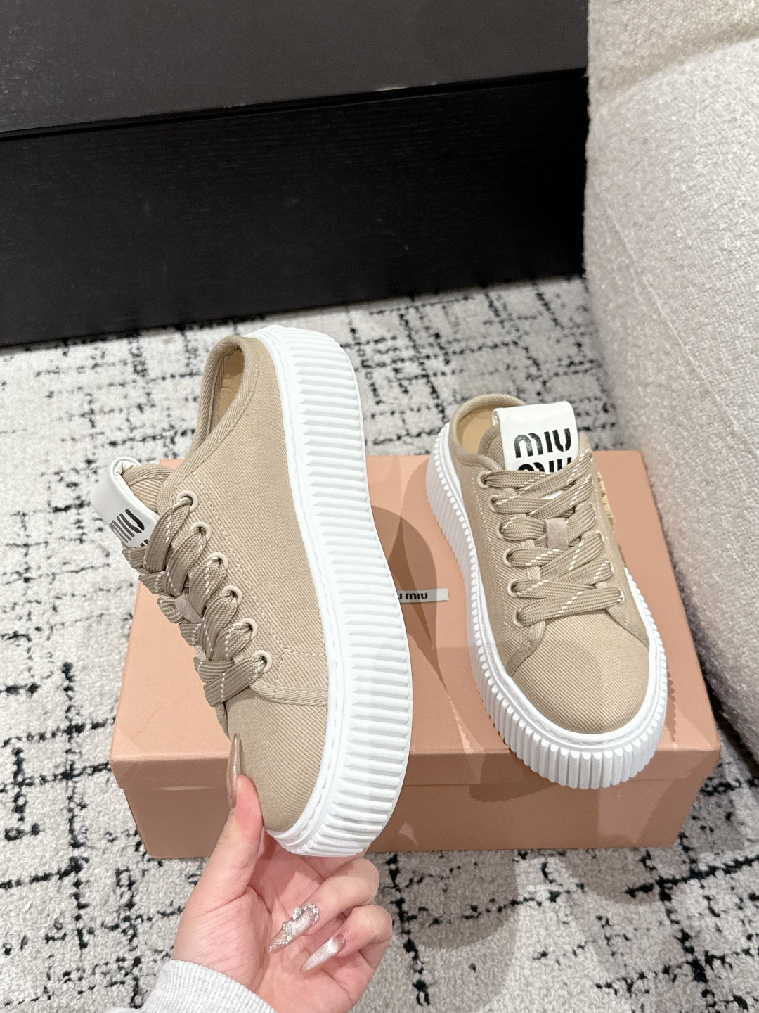 这款鞋子是AAAAA 1:1 质量 (非常棒). 使用了和原版一模一样的材料. 商标部分也保持了和缪缪/Miu Miu一样. 图片拍摄是实物鞋子拍摄, 您所收到的实物保证和我们图片一模一样.