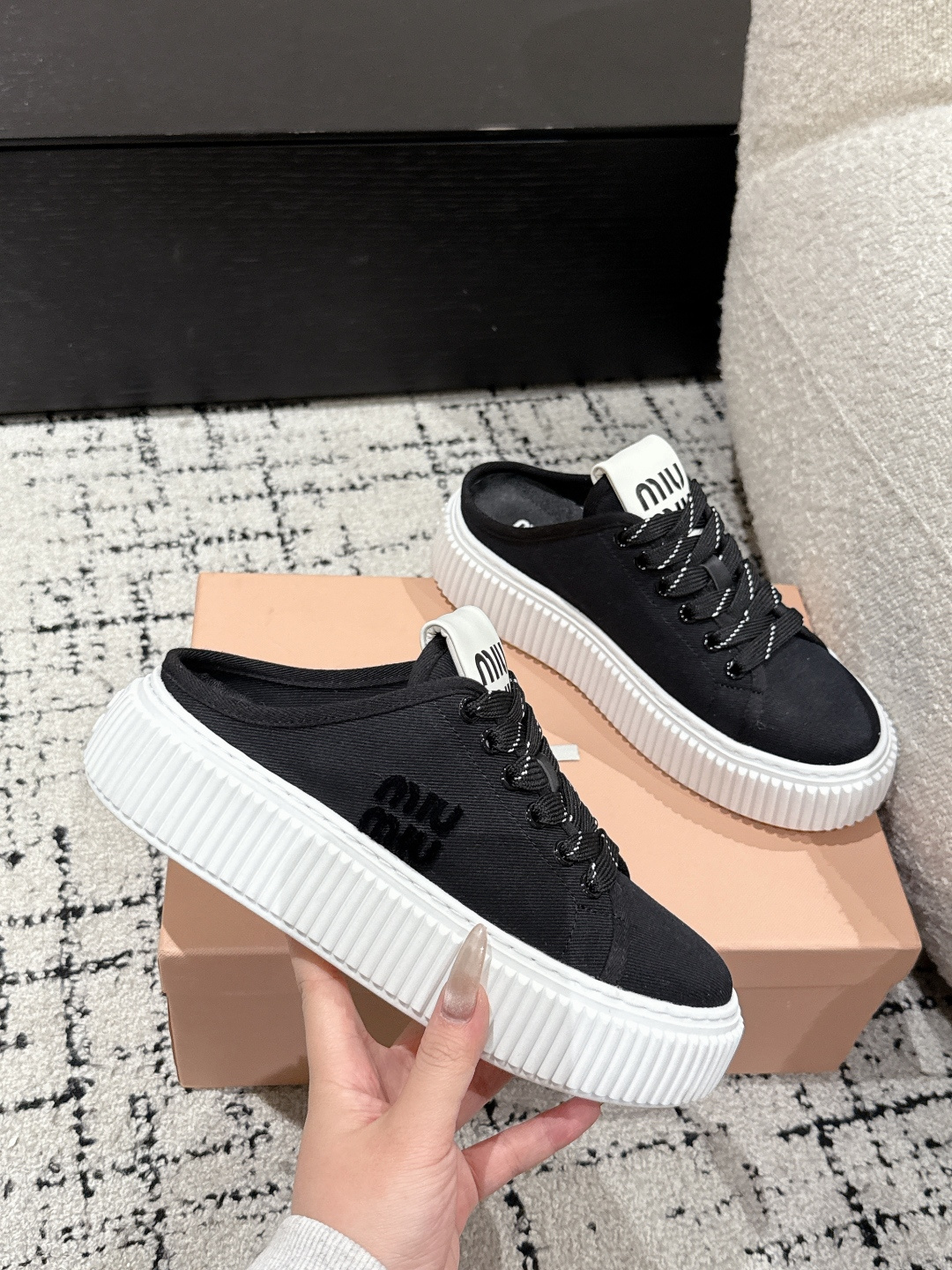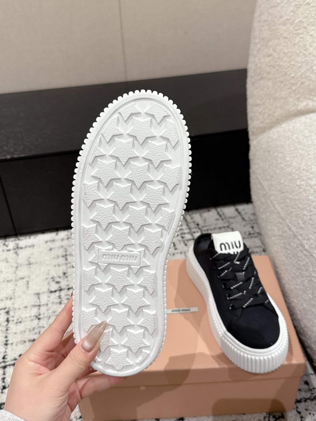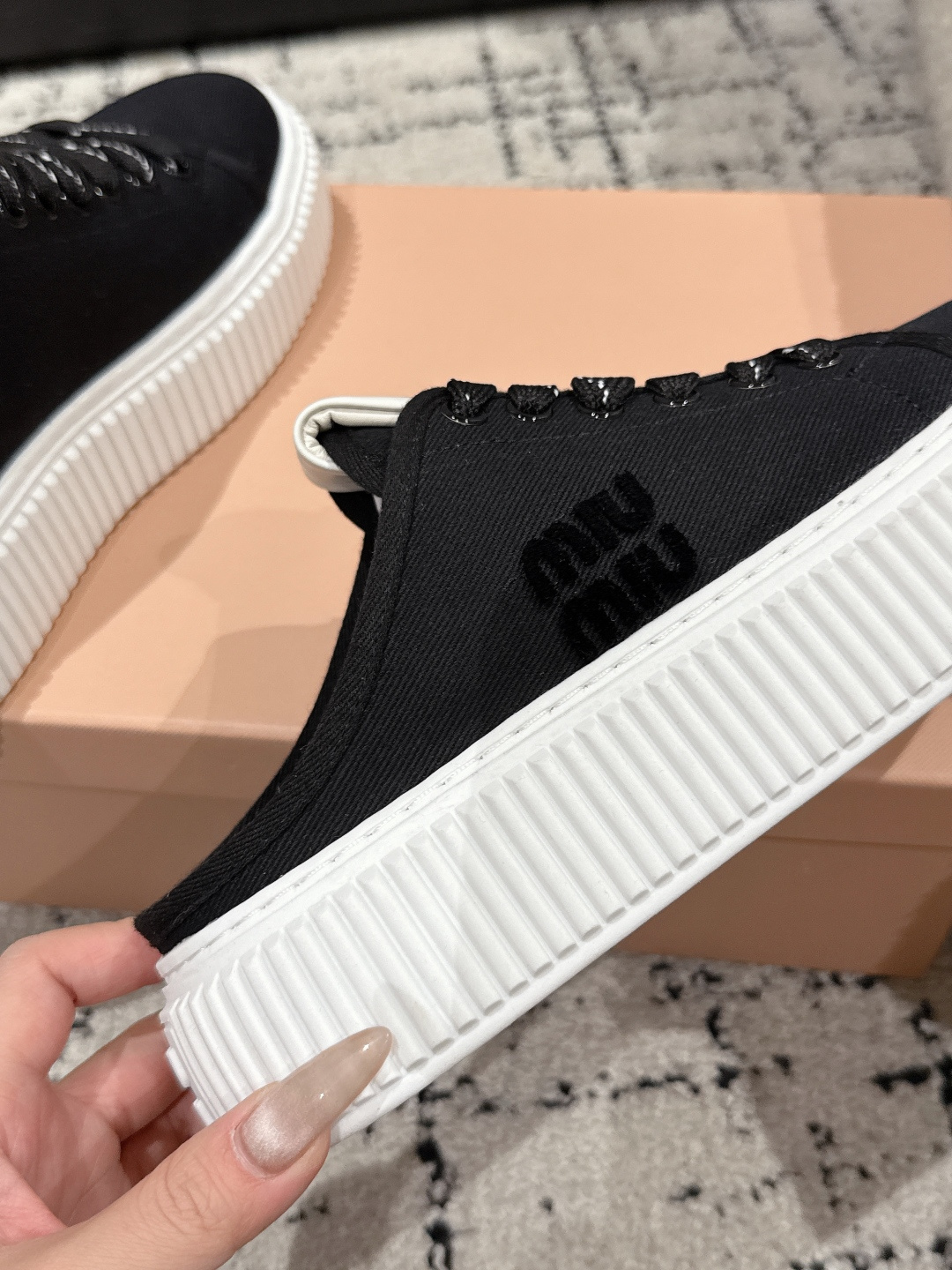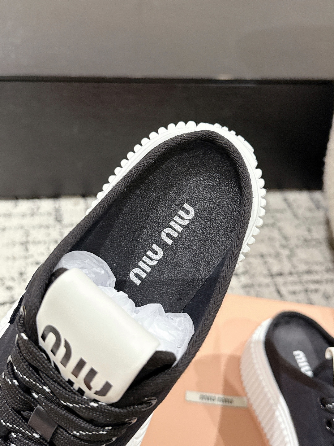 这款鞋子是AAAAA 1:1 质量 (非常棒). 使用了和原版一模一样的材料. 商标部分也保持了和缪缪/Miu Miu一样. 图片拍摄是实物鞋子拍摄, 您所收到的实物保证和我们图片一模一样.