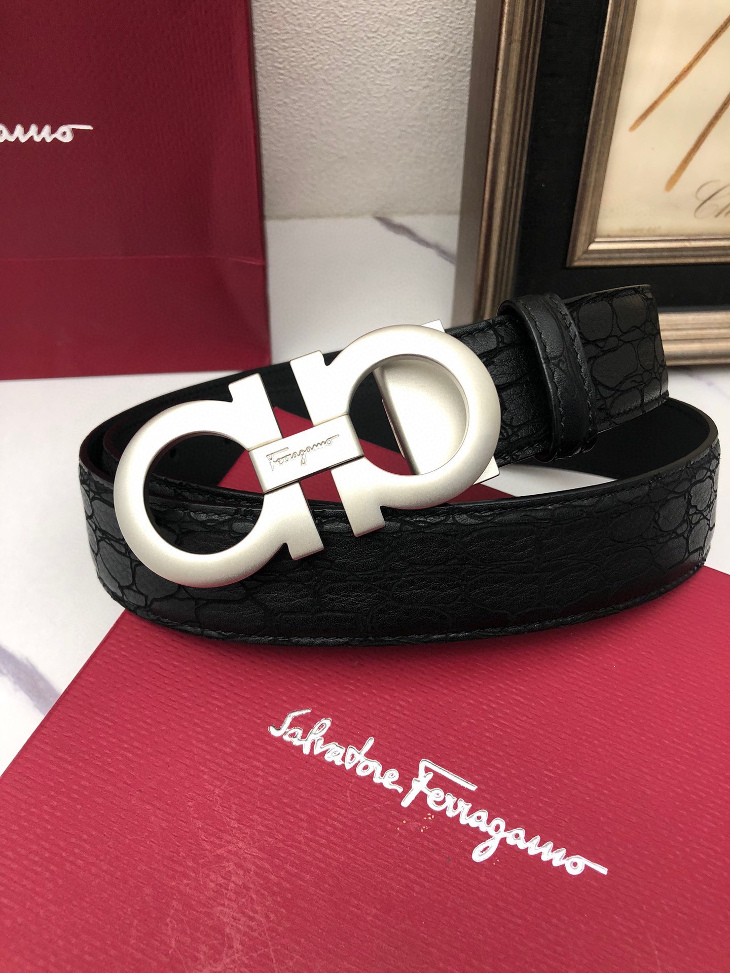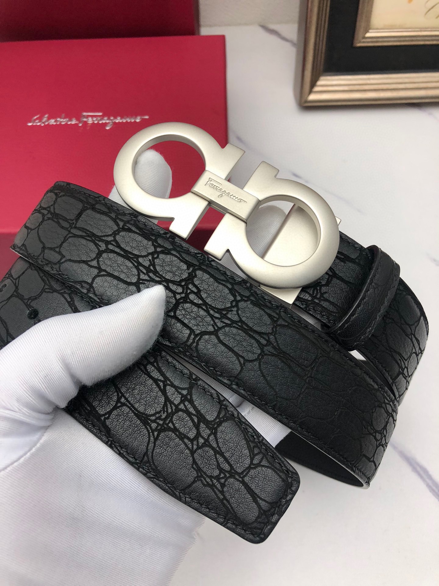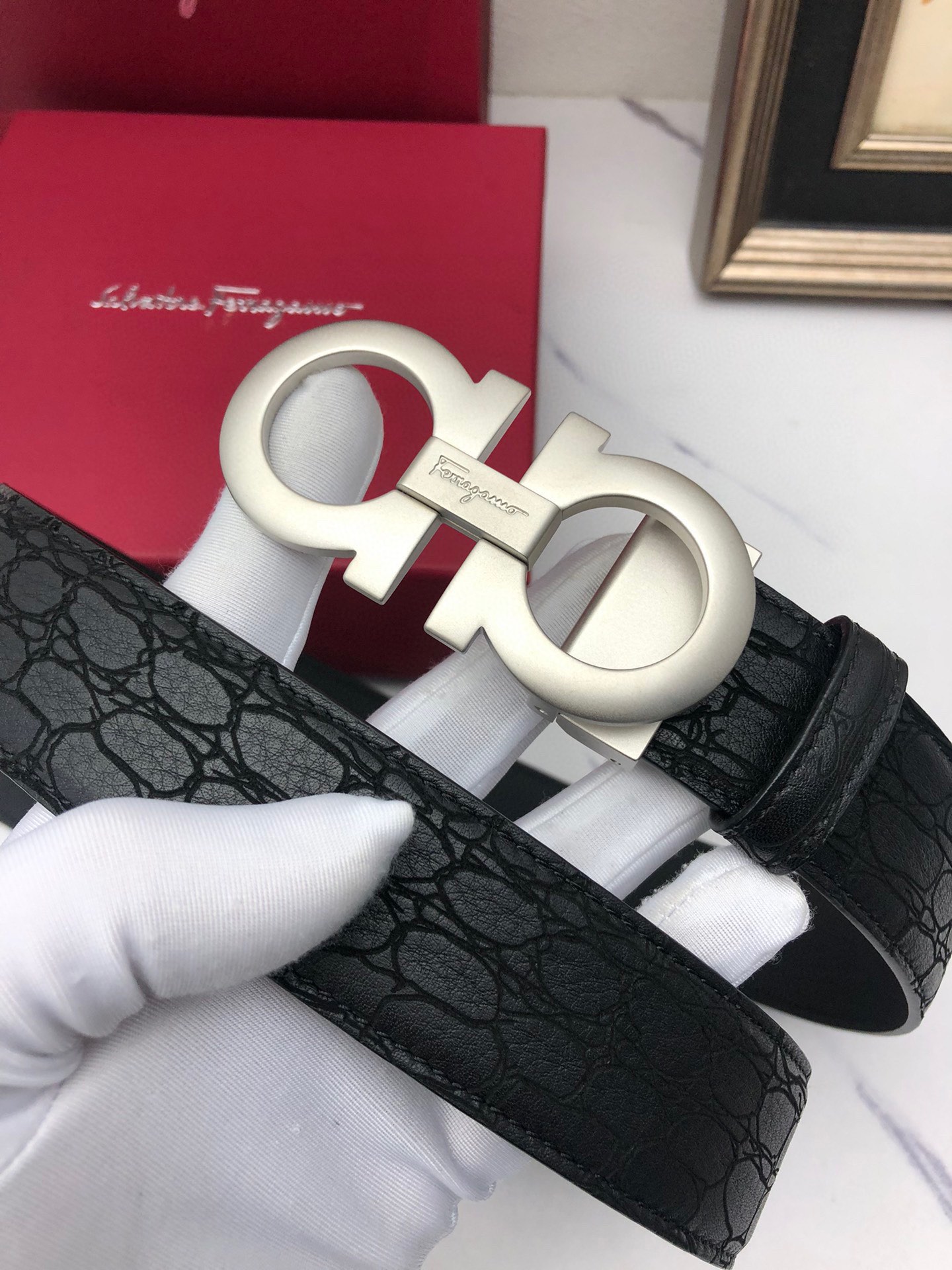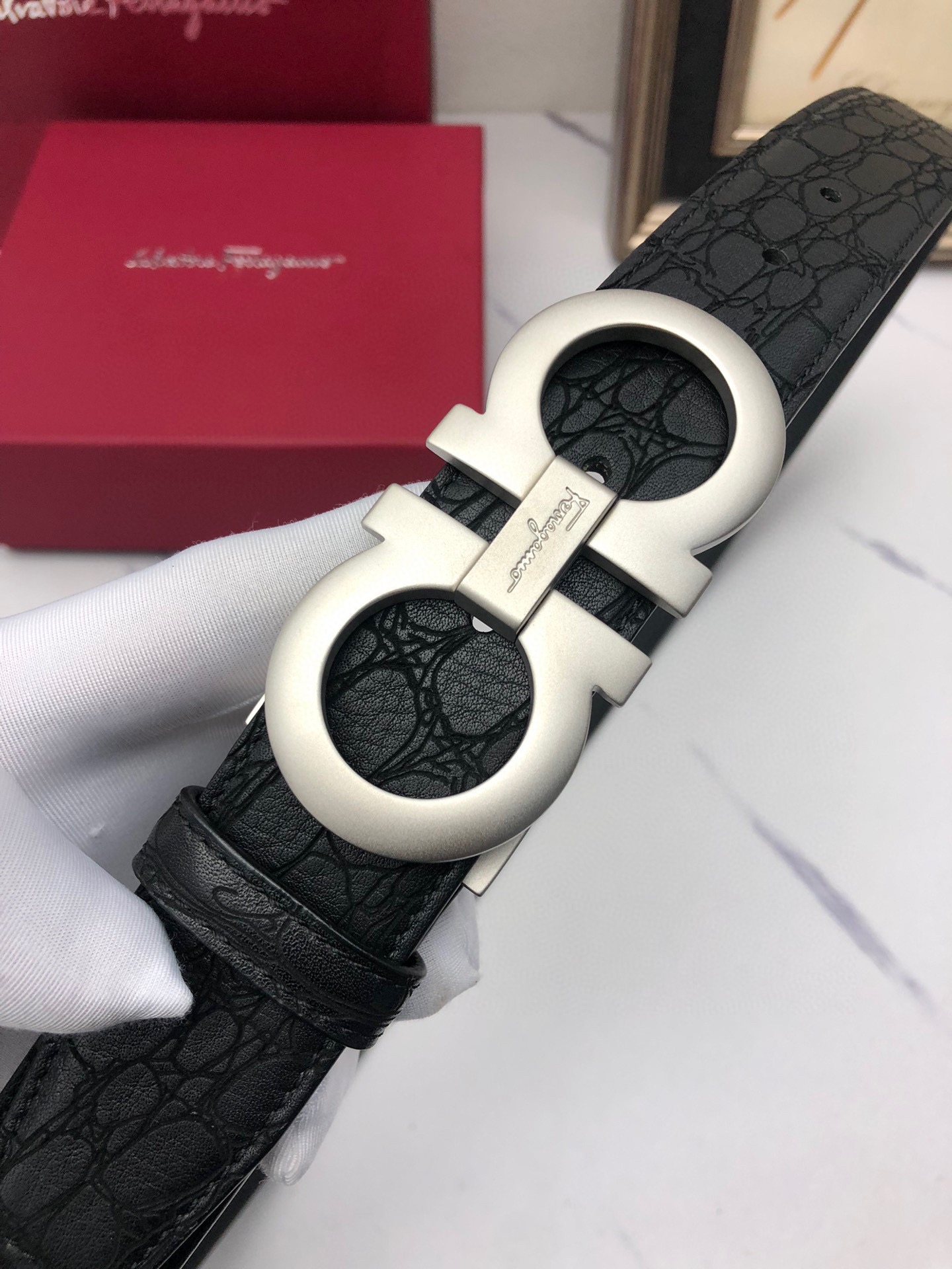 这款皮带是AAAAA 1:1 质量 (非常棒). 使用了和原版一模一样的材料. 商标部分也保持了和菲拉格慕/Salvatore Ferragamo一样. 图片拍摄是实物皮带拍摄, 您所收到的实物保证和我们图片一模一样.