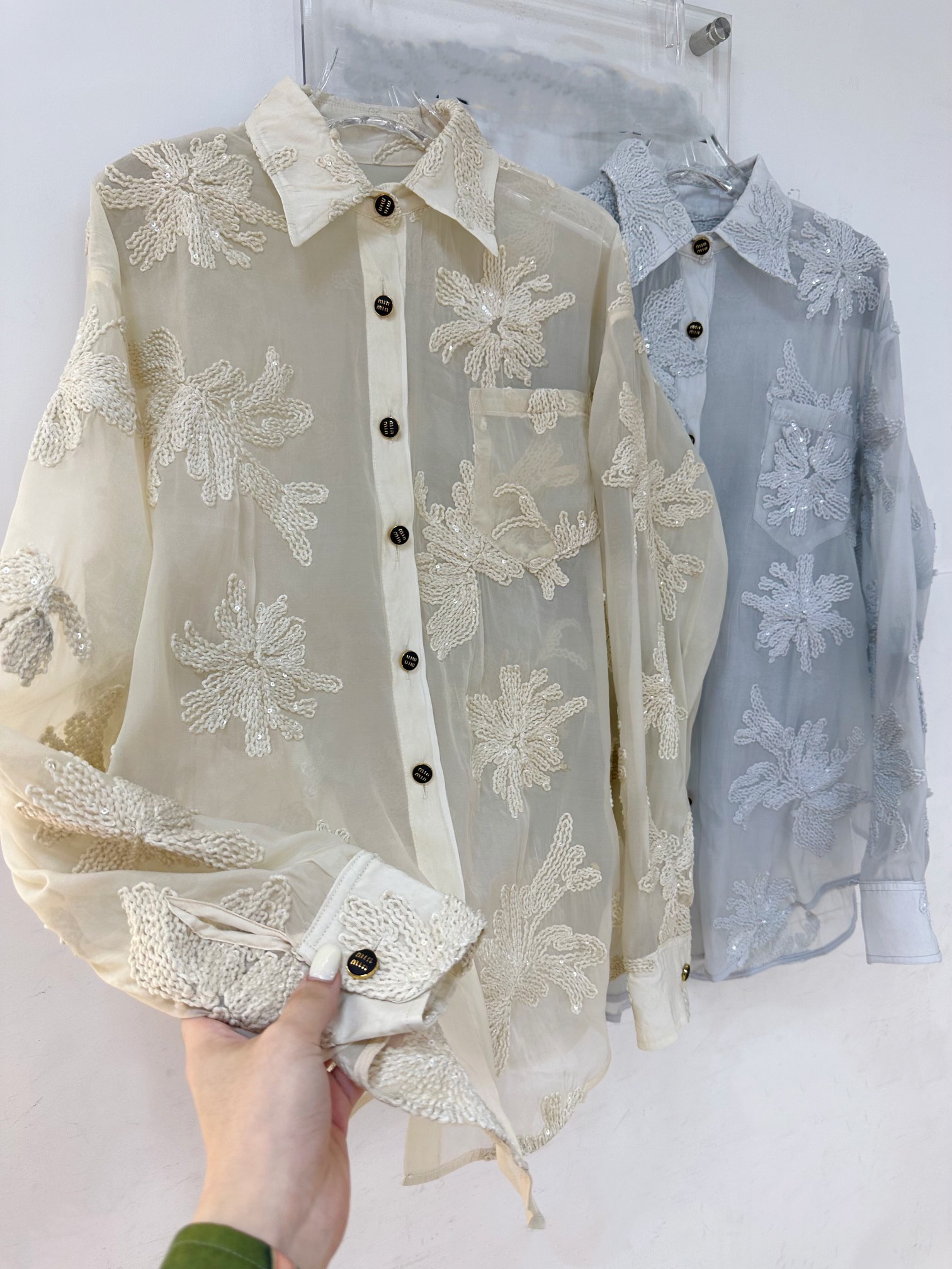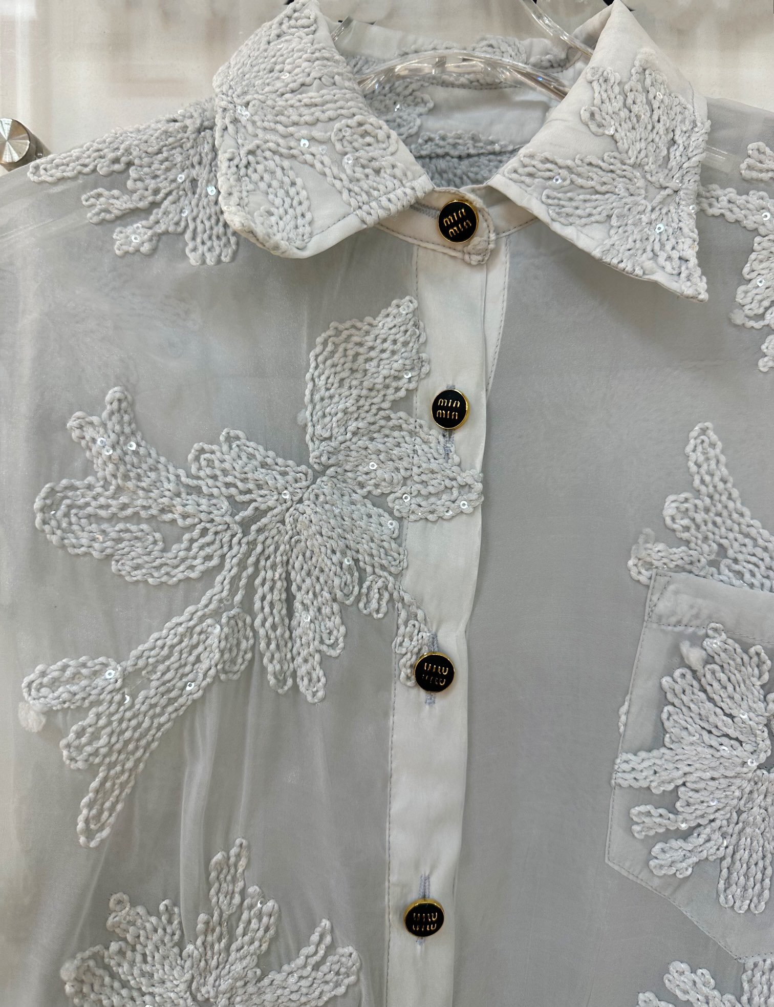 这款衣服是AAAAA 1:1 质量 (非常棒). 使用了和原版一模一样的材料. 商标部分也保持了和缪缪/Miu Miu一样. 图片拍摄是实物衣服拍摄, 您所收到的实物保证和我们图片一模一样.