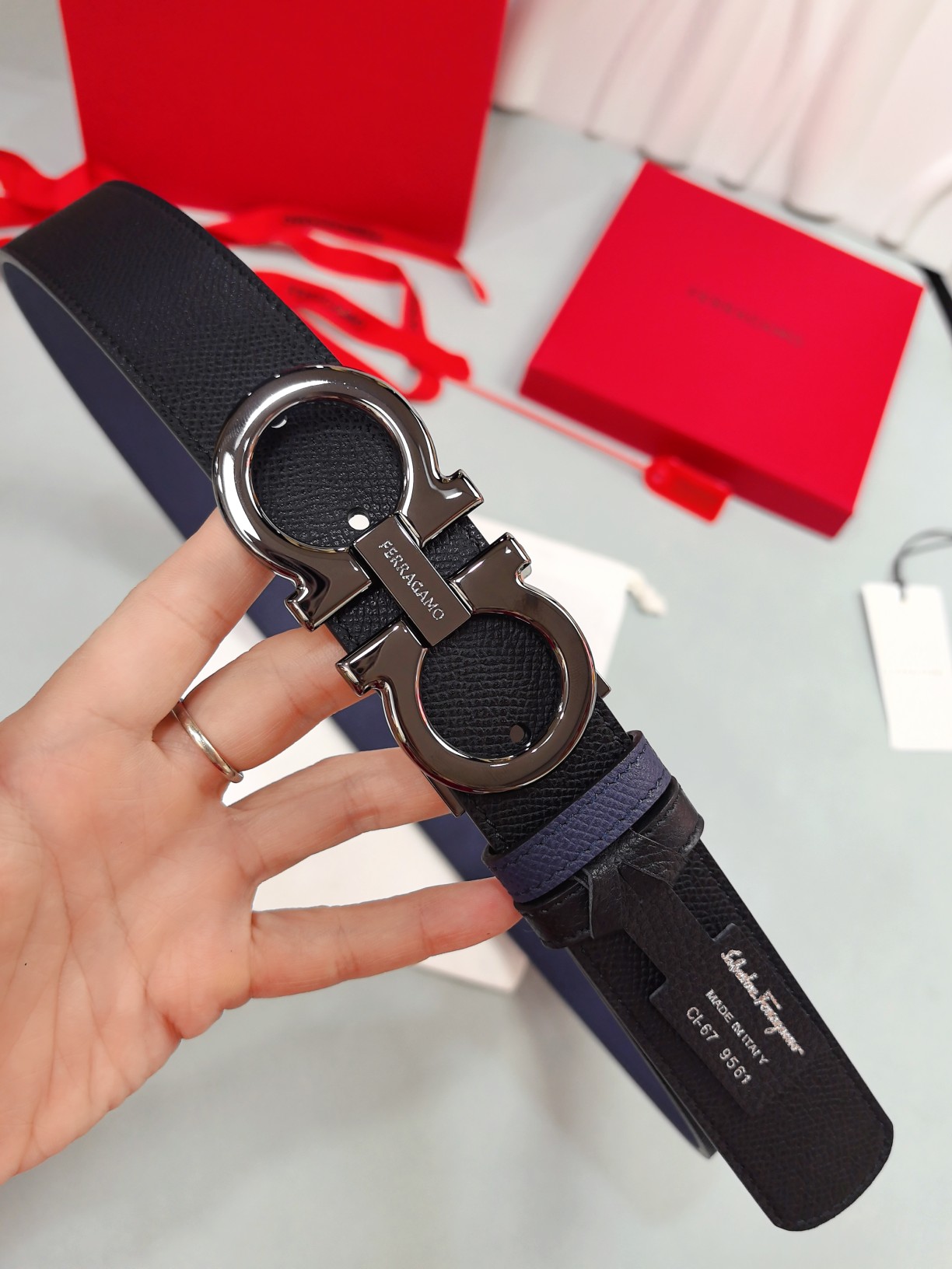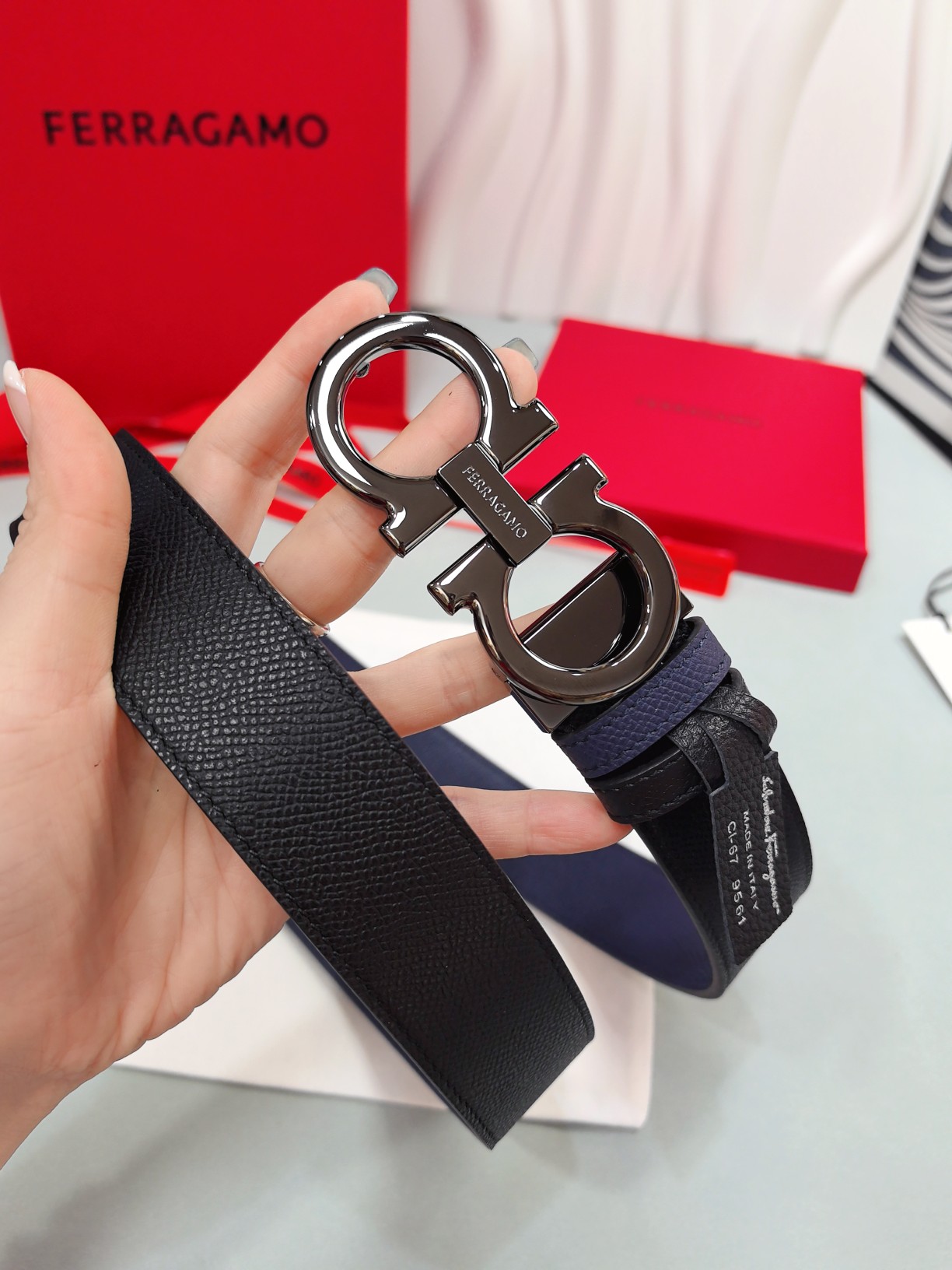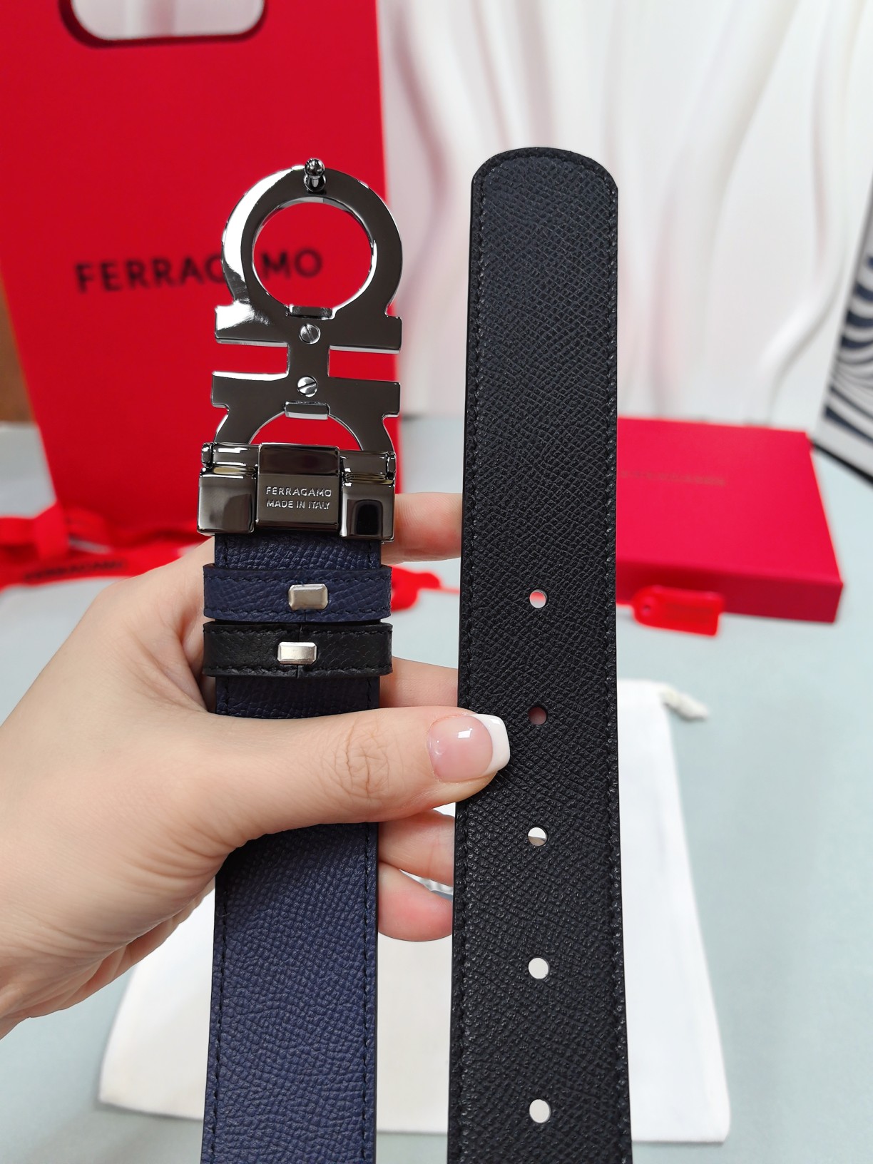 这款皮带是AAAAA 1:1 质量 (非常棒). 使用了和原版一模一样的材料. 商标部分也保持了和菲拉格慕/Salvatore Ferragamo一样. 图片拍摄是实物皮带拍摄, 您所收到的实物保证和我们图片一模一样.