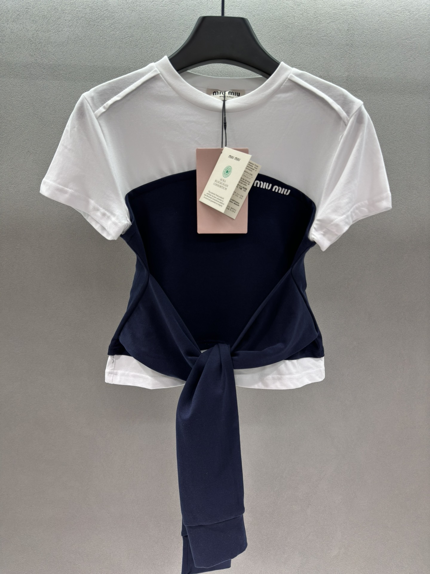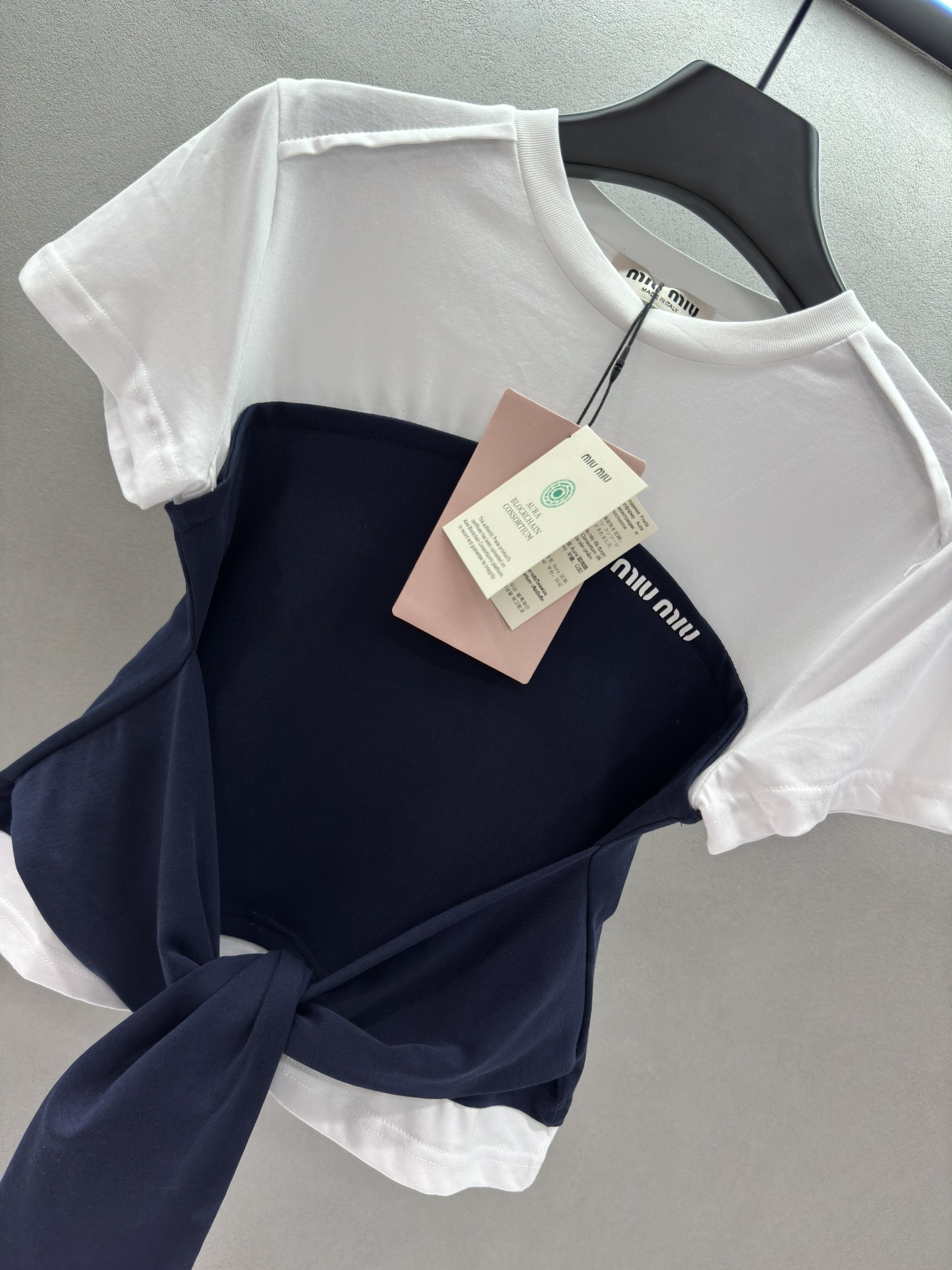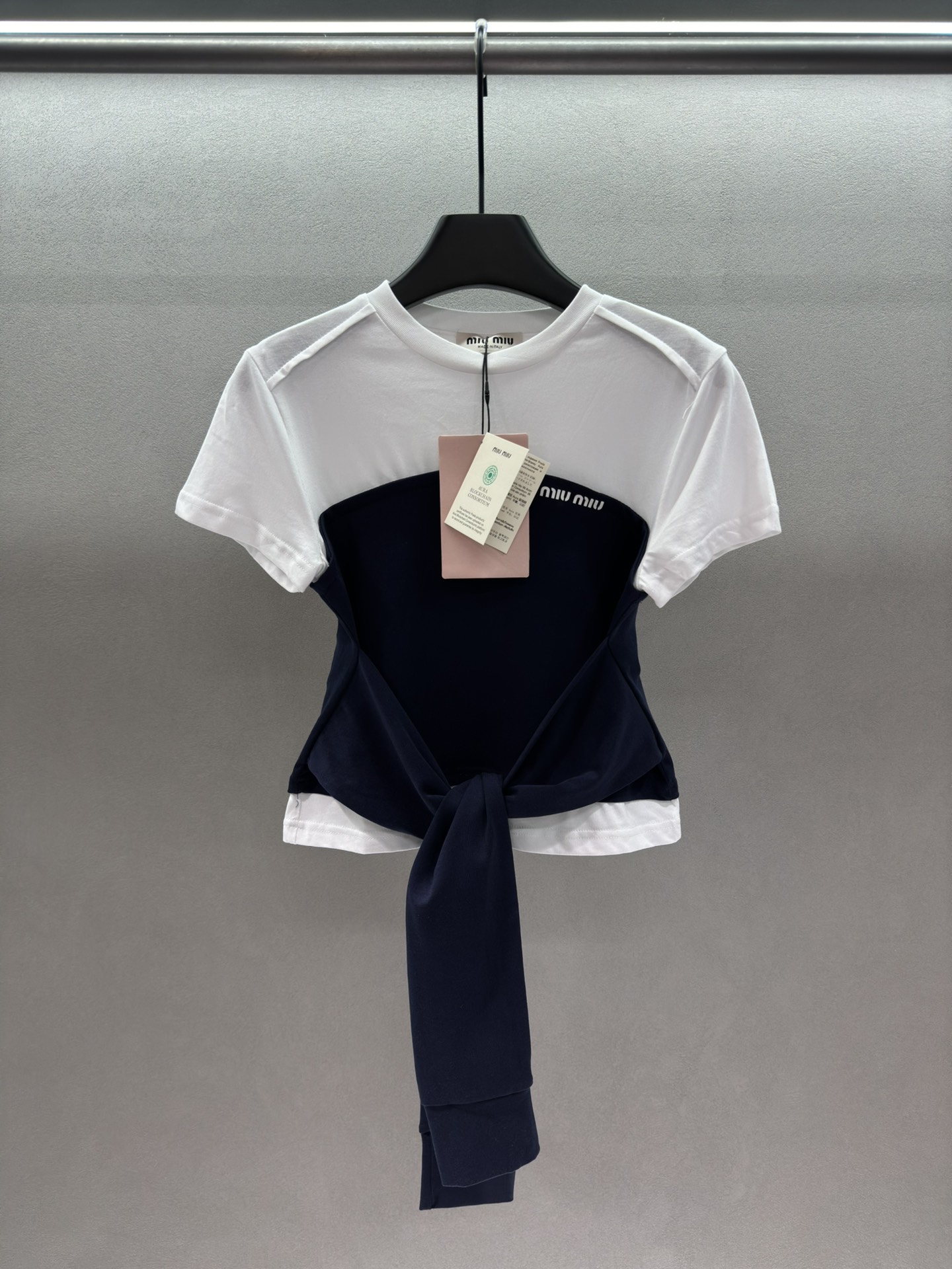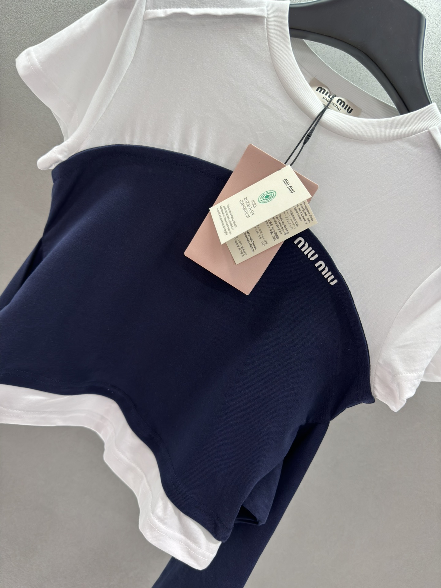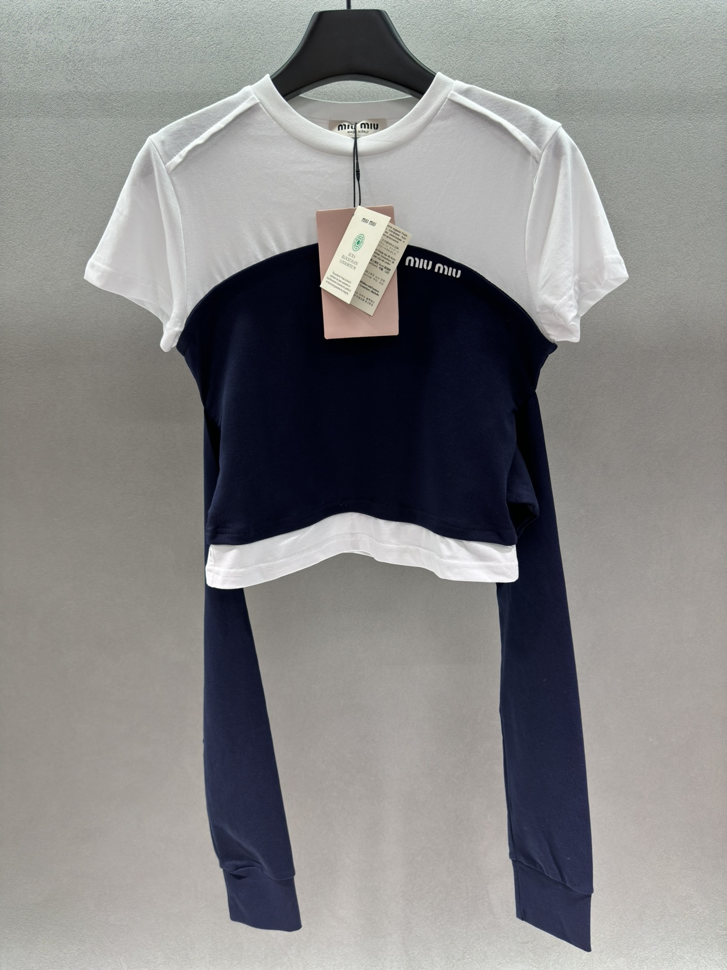 这款衣服是AAAAA 1:1 质量 (非常棒). 使用了和原版一模一样的材料. 商标部分也保持了和缪缪/Miu Miu一样. 图片拍摄是实物衣服拍摄, 您所收到的实物保证和我们图片一模一样.