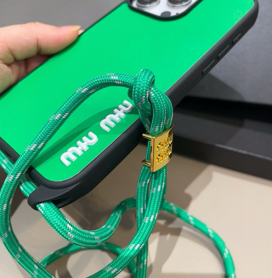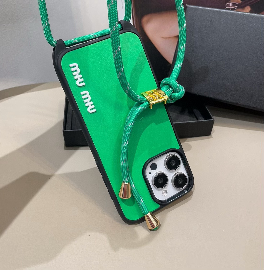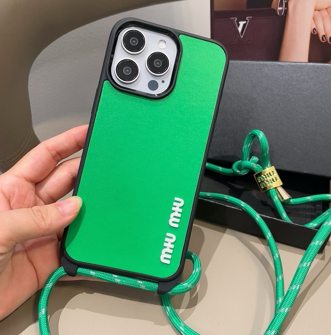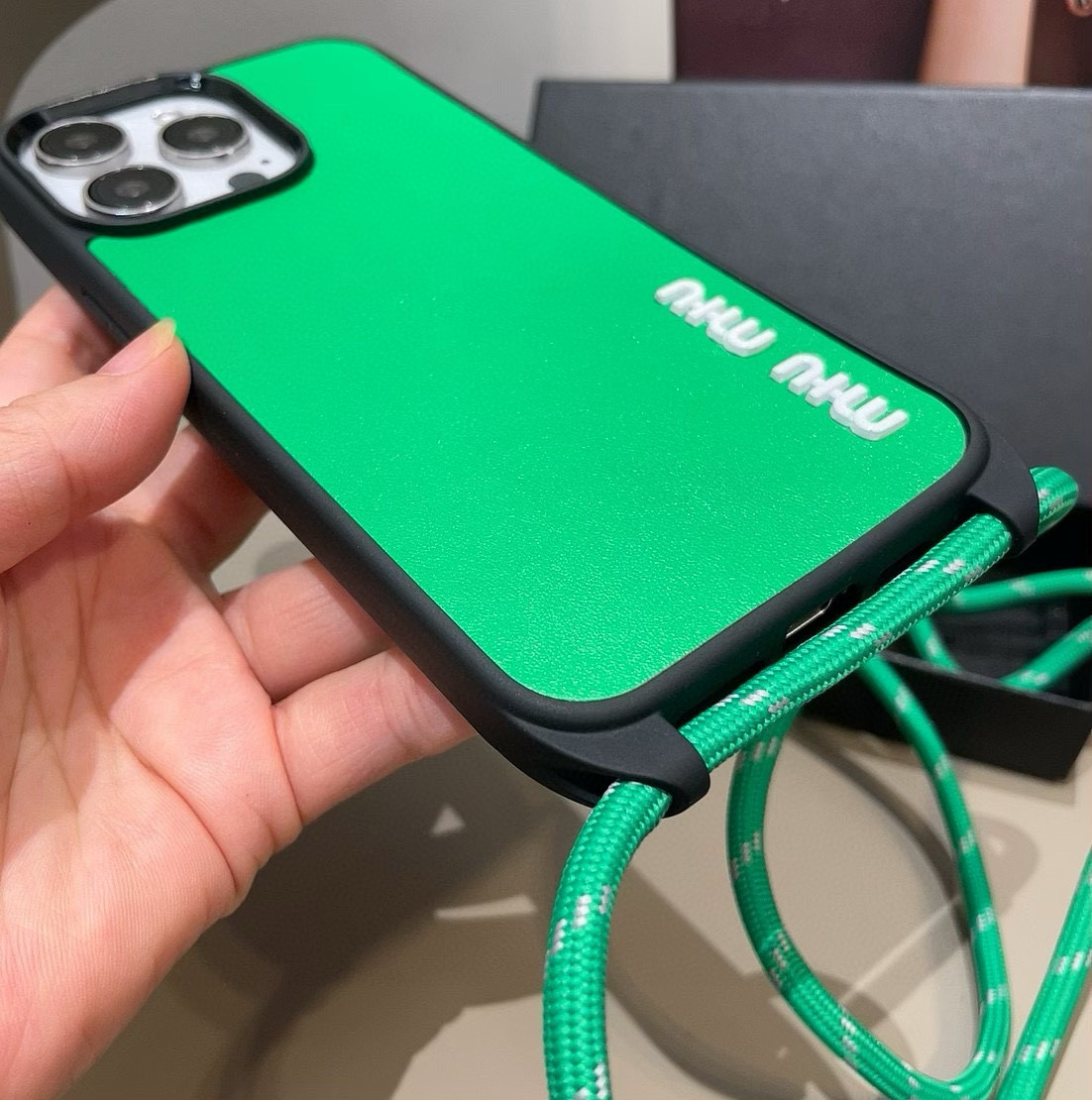 这款手机外壳是AAAAA 1:1 质量 (非常棒). 使用了和原版一模一样的材料. 商标部分也保持了和缪缪/Miu Miu一样. 图片拍摄是实物手机外壳拍摄, 您所收到的实物保证和我们图片一模一样.