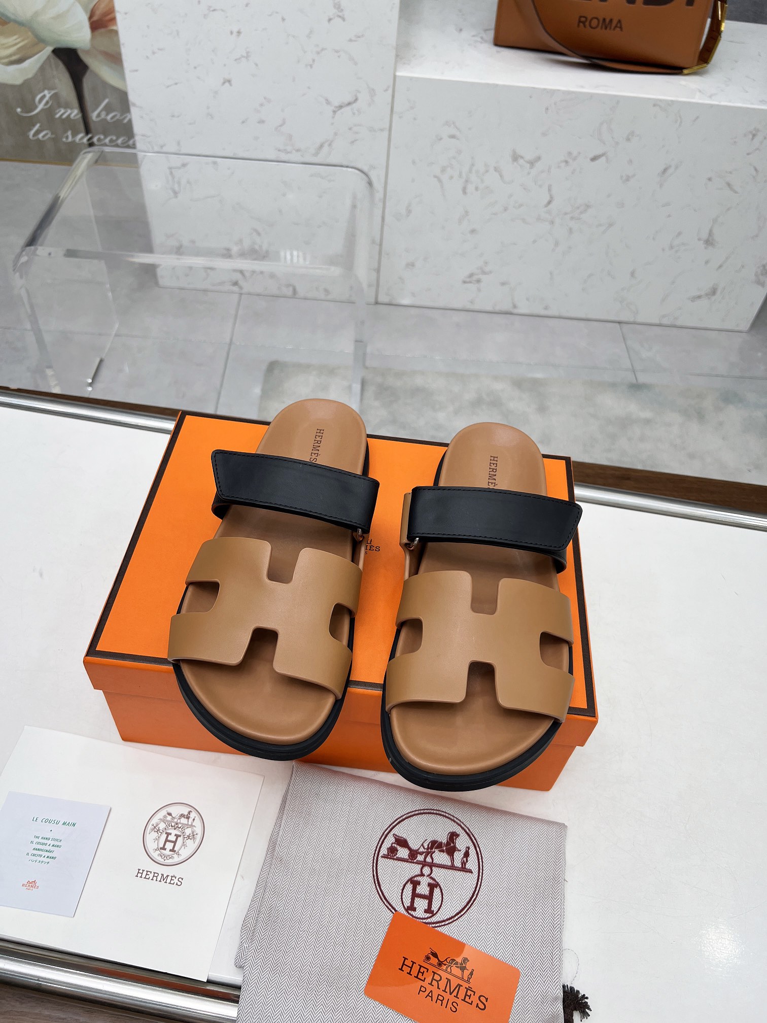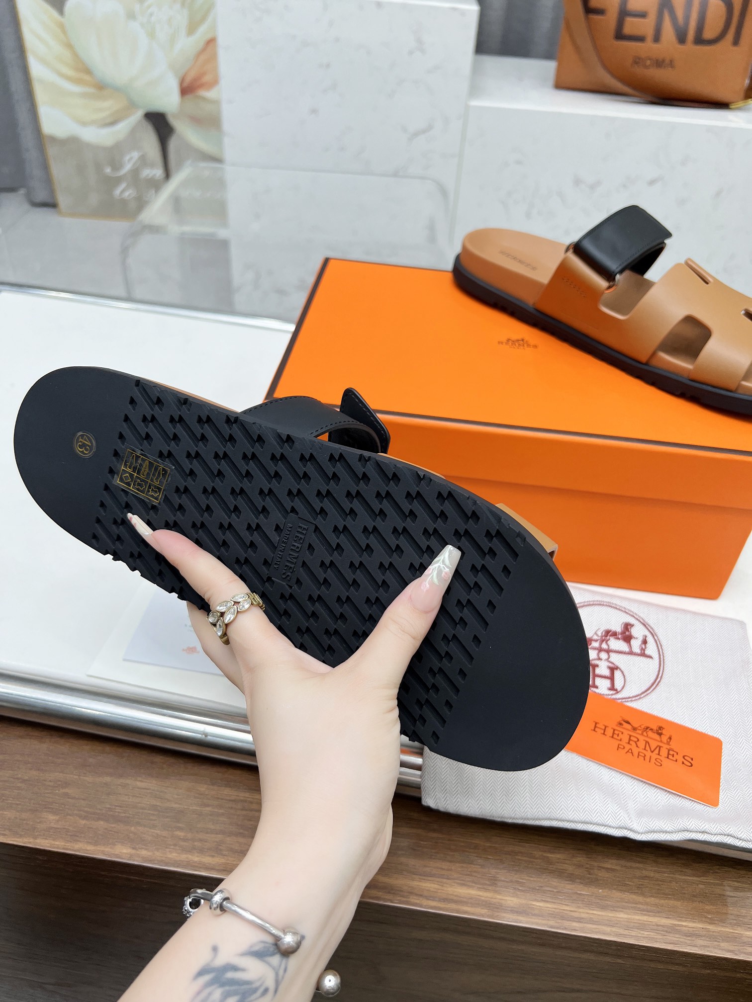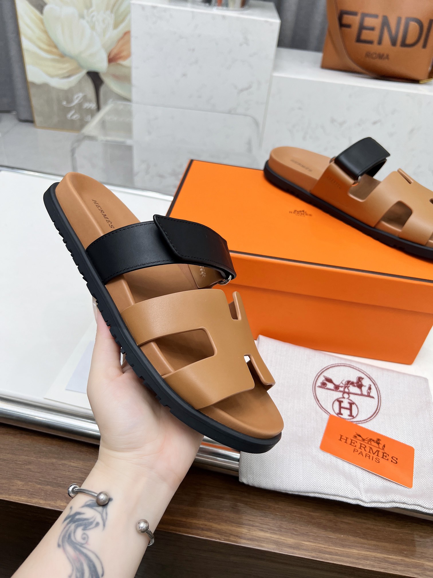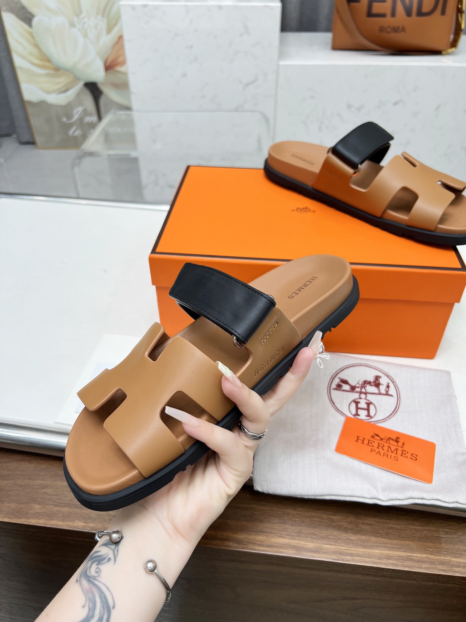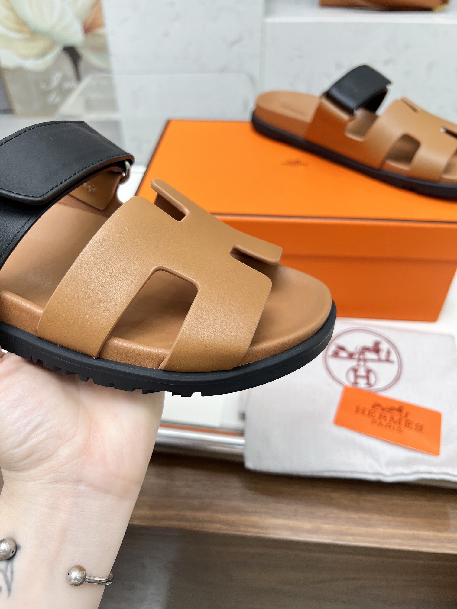 这款鞋子是AAAAA 1:1 质量 (非常棒). 使用了和原版一模一样的材料. 商标部分也保持了和爱马仕/Hermes一样. 图片拍摄是实物鞋子拍摄, 您所收到的实物保证和我们图片一模一样.