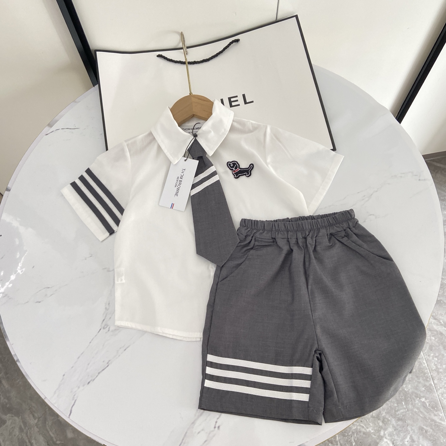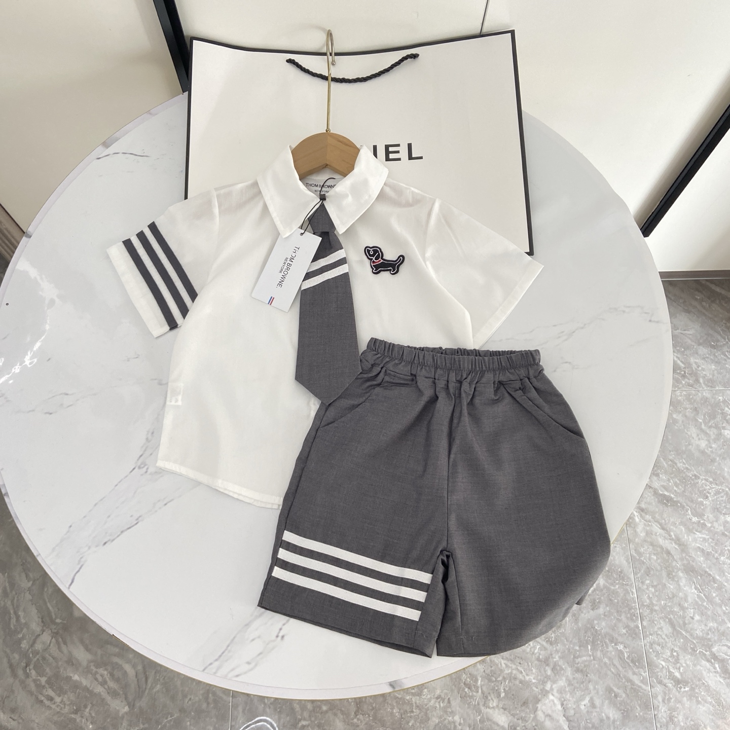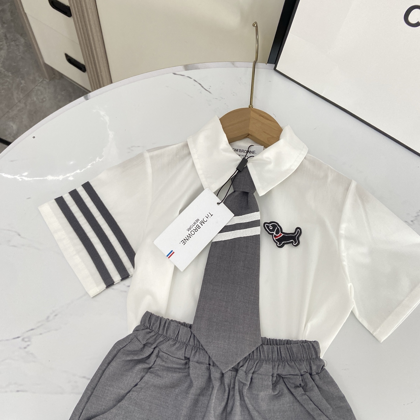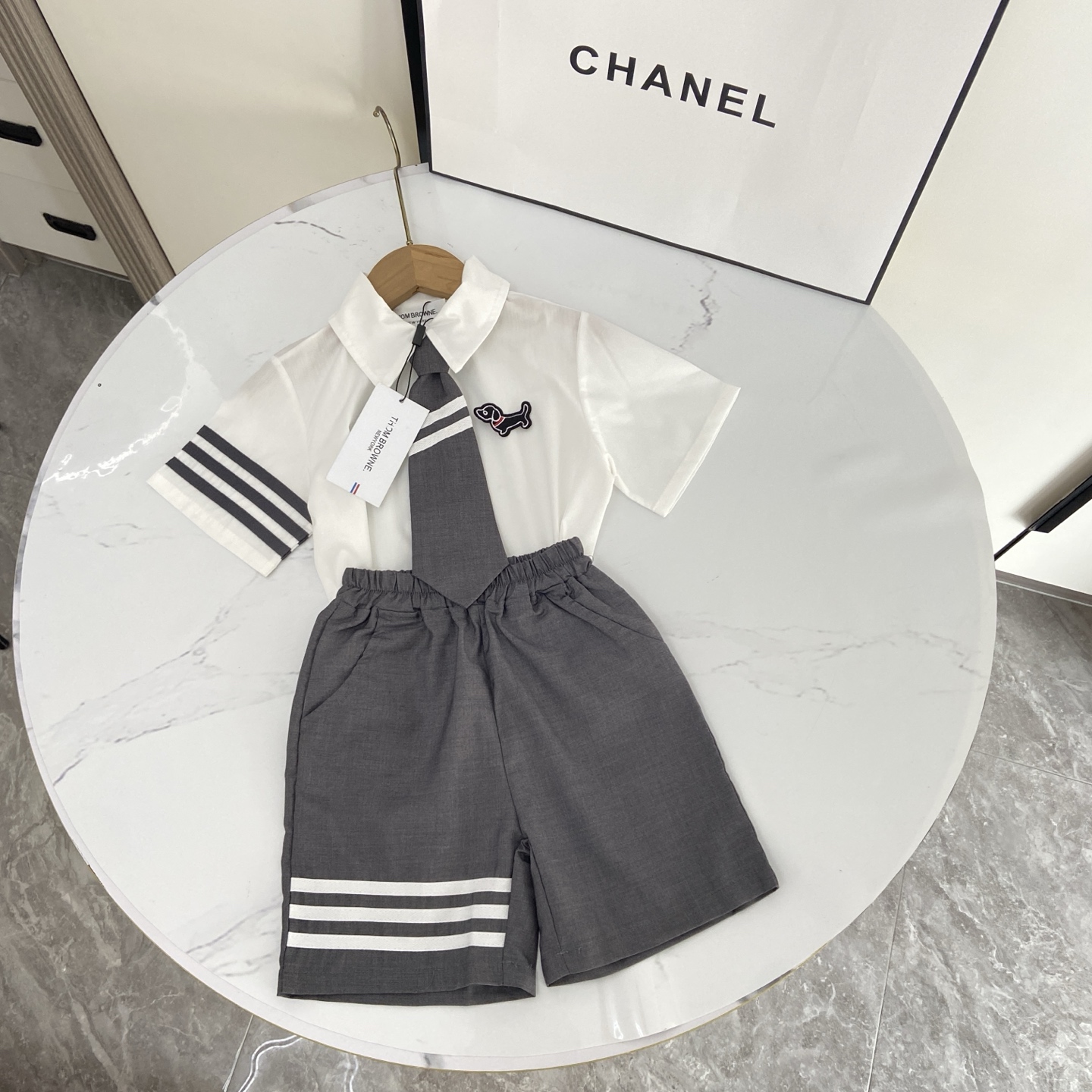 这款children's clothes是AAAAA 1:1 质量 (非常棒). 使用了和原版一模一样的材料. 商标部分也保持了和汤姆布朗/Thom Browne一样. 图片拍摄是实物children's clothes拍摄, 您所收到的实物保证和我们图片一模一样.