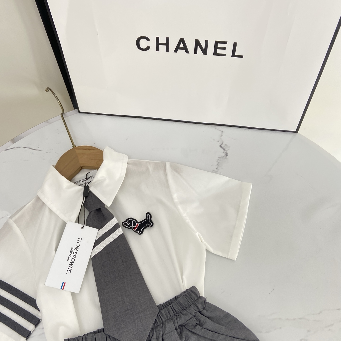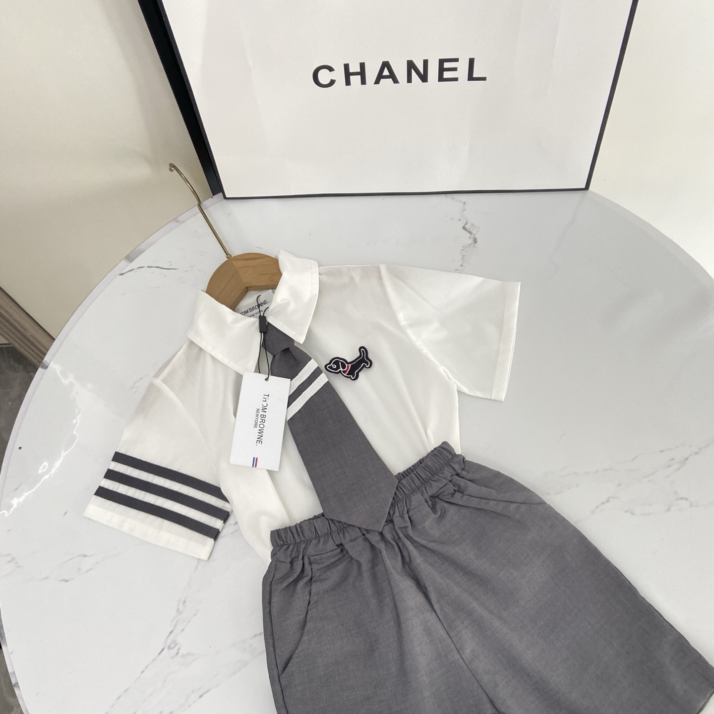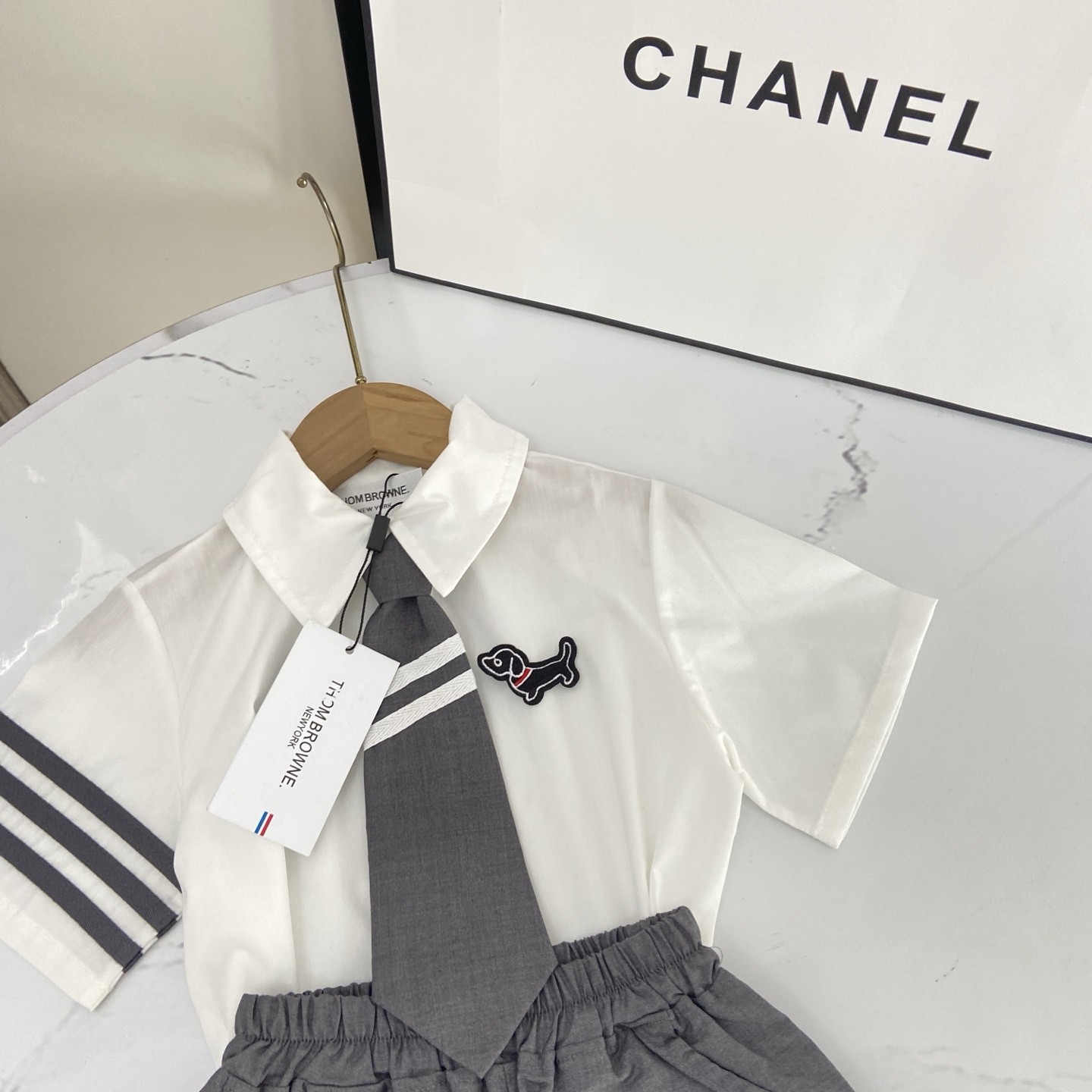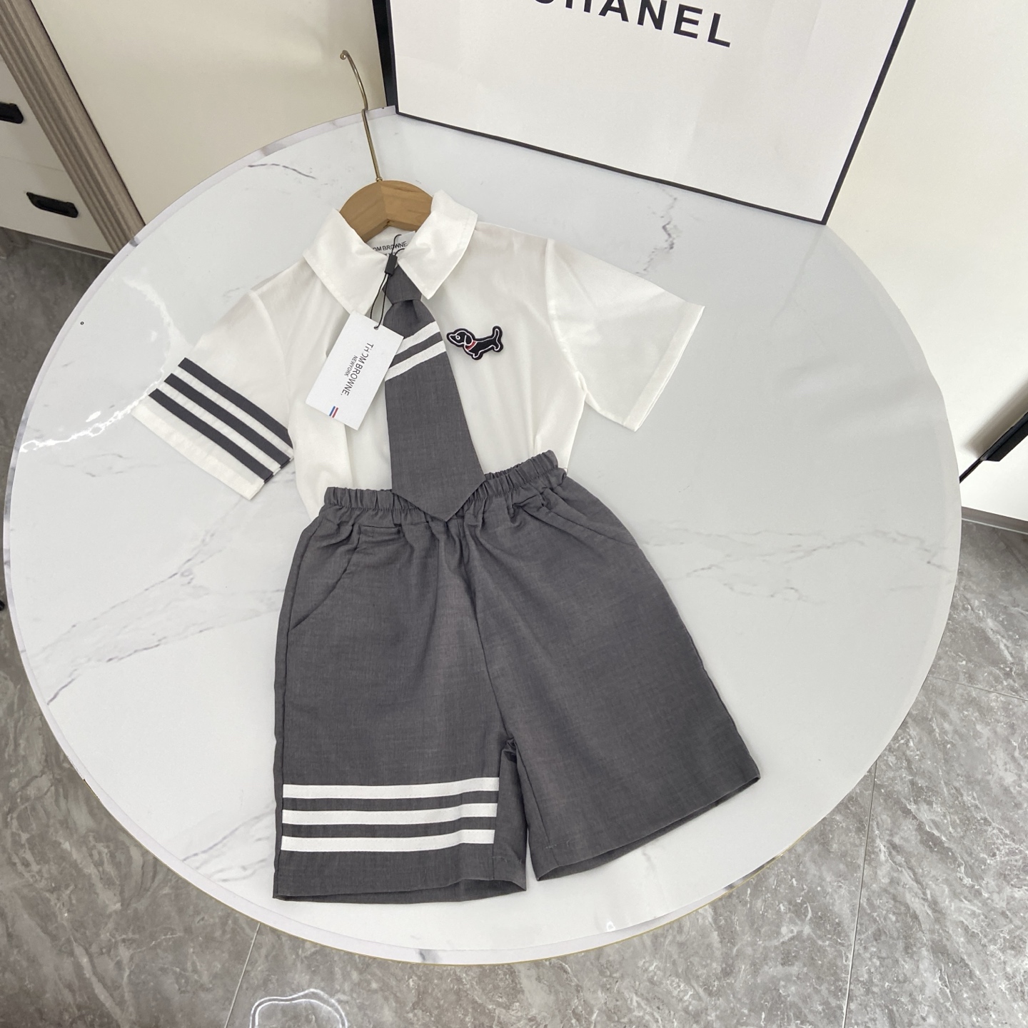 这款children's clothes是AAAAA 1:1 质量 (非常棒). 使用了和原版一模一样的材料. 商标部分也保持了和汤姆布朗/Thom Browne一样. 图片拍摄是实物children's clothes拍摄, 您所收到的实物保证和我们图片一模一样.