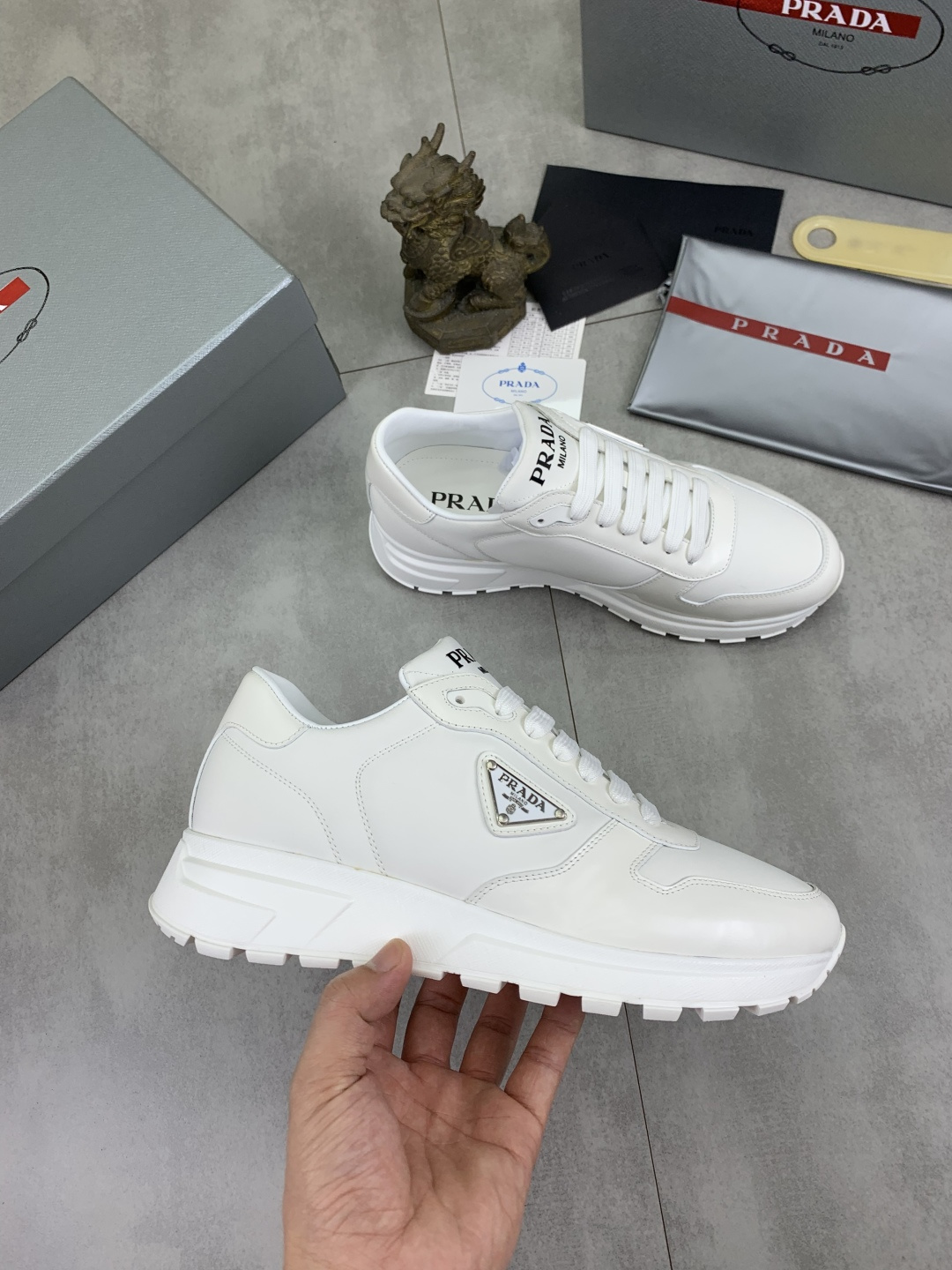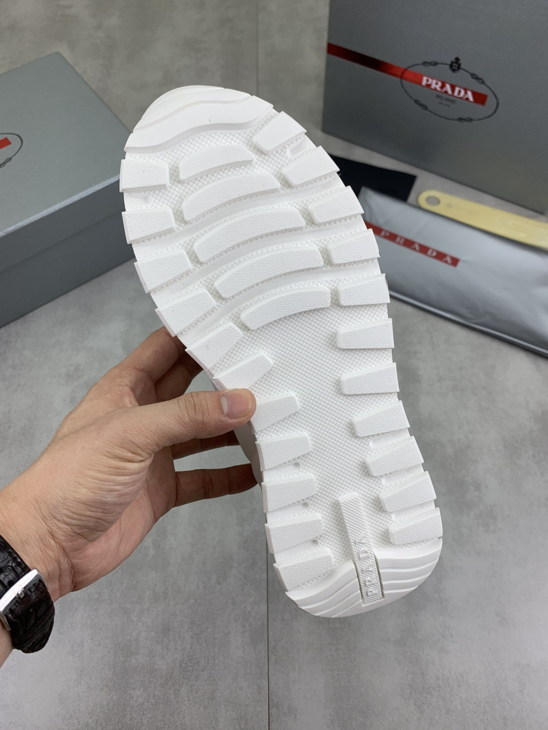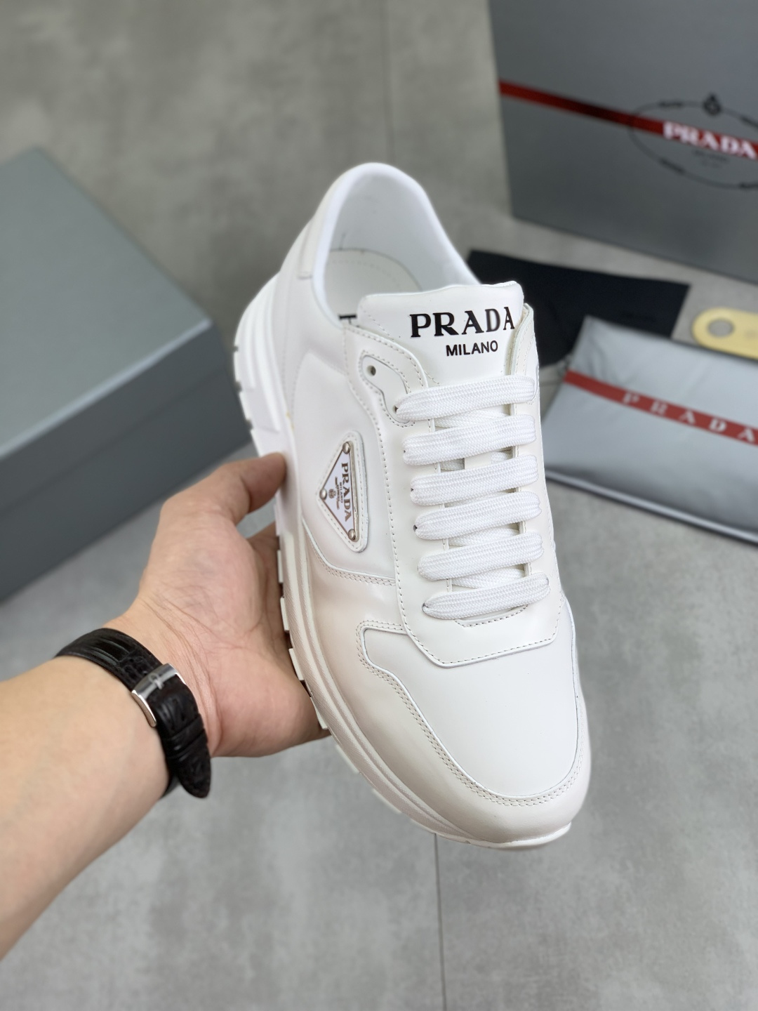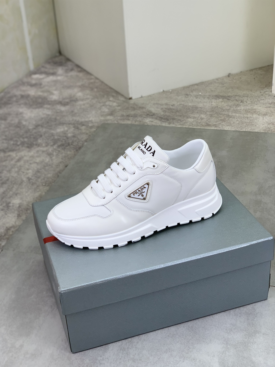 这款鞋子是AAAAA 1:1 质量 (非常棒). 使用了和原版一模一样的材料. 商标部分也保持了和普拉达/Prada一样. 图片拍摄是实物鞋子拍摄, 您所收到的实物保证和我们图片一模一样.