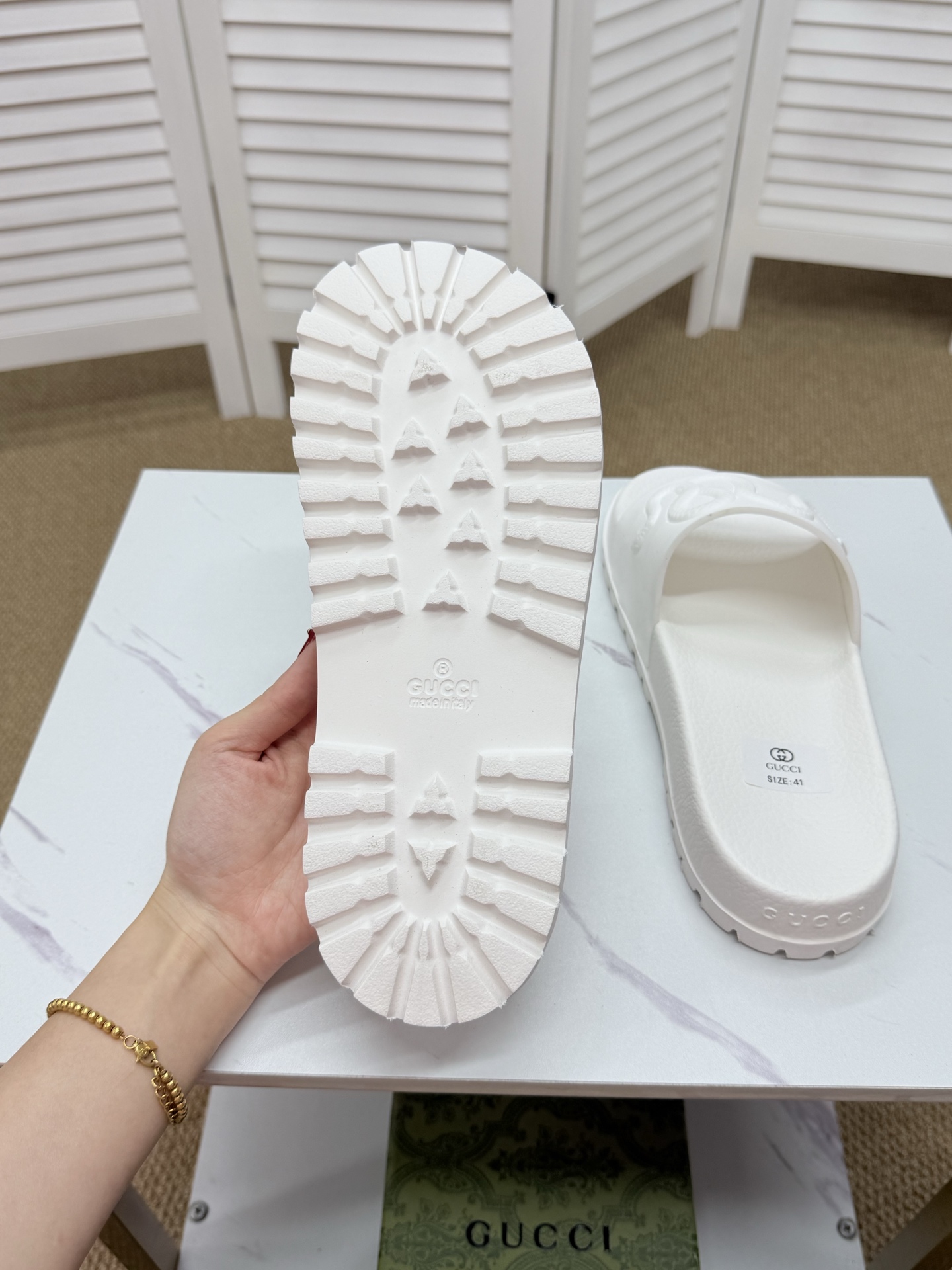 这款鞋子是AAAAA 1:1 质量 (非常棒). 使用了和原版一模一样的材料. 商标部分也保持了和古奇/Gucci一样. 图片拍摄是实物鞋子拍摄, 您所收到的实物保证和我们图片一模一样.
