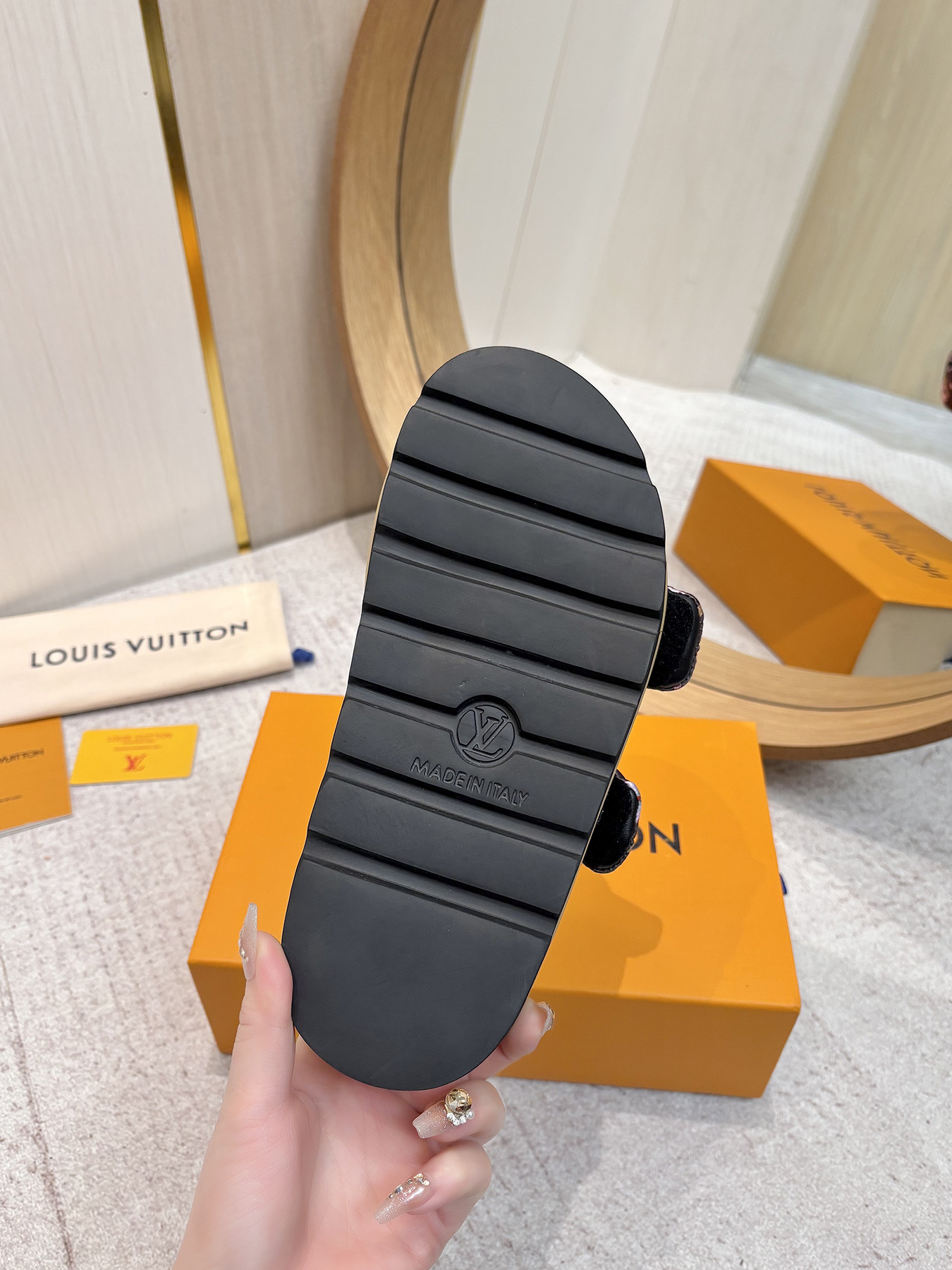 这款鞋子是AAAAA 1:1 质量 (非常棒). 使用了和原版一模一样的材料. 商标部分也保持了和路易威登/Louis Vuitton一样. 图片拍摄是实物鞋子拍摄, 您所收到的实物保证和我们图片一模一样.