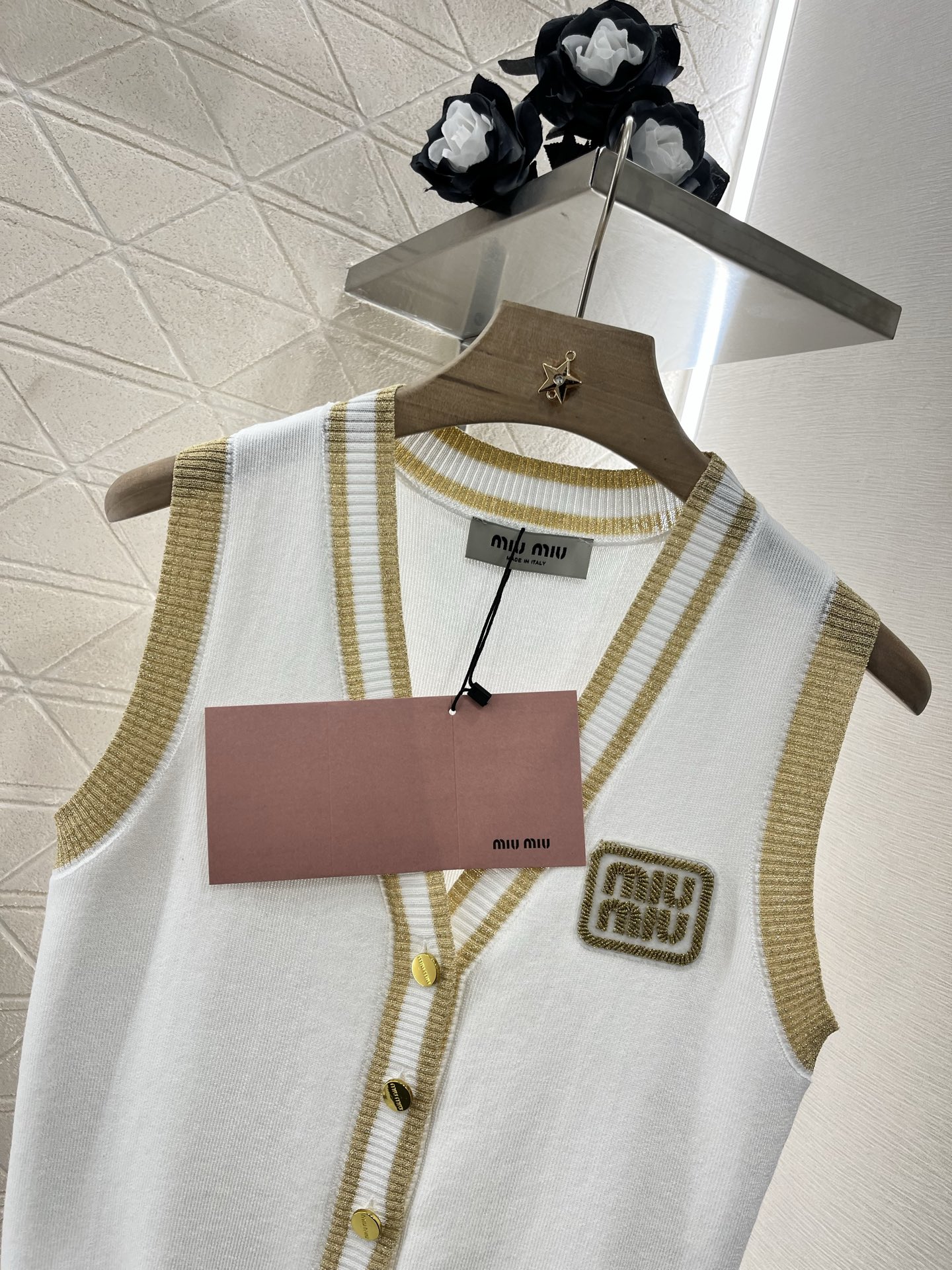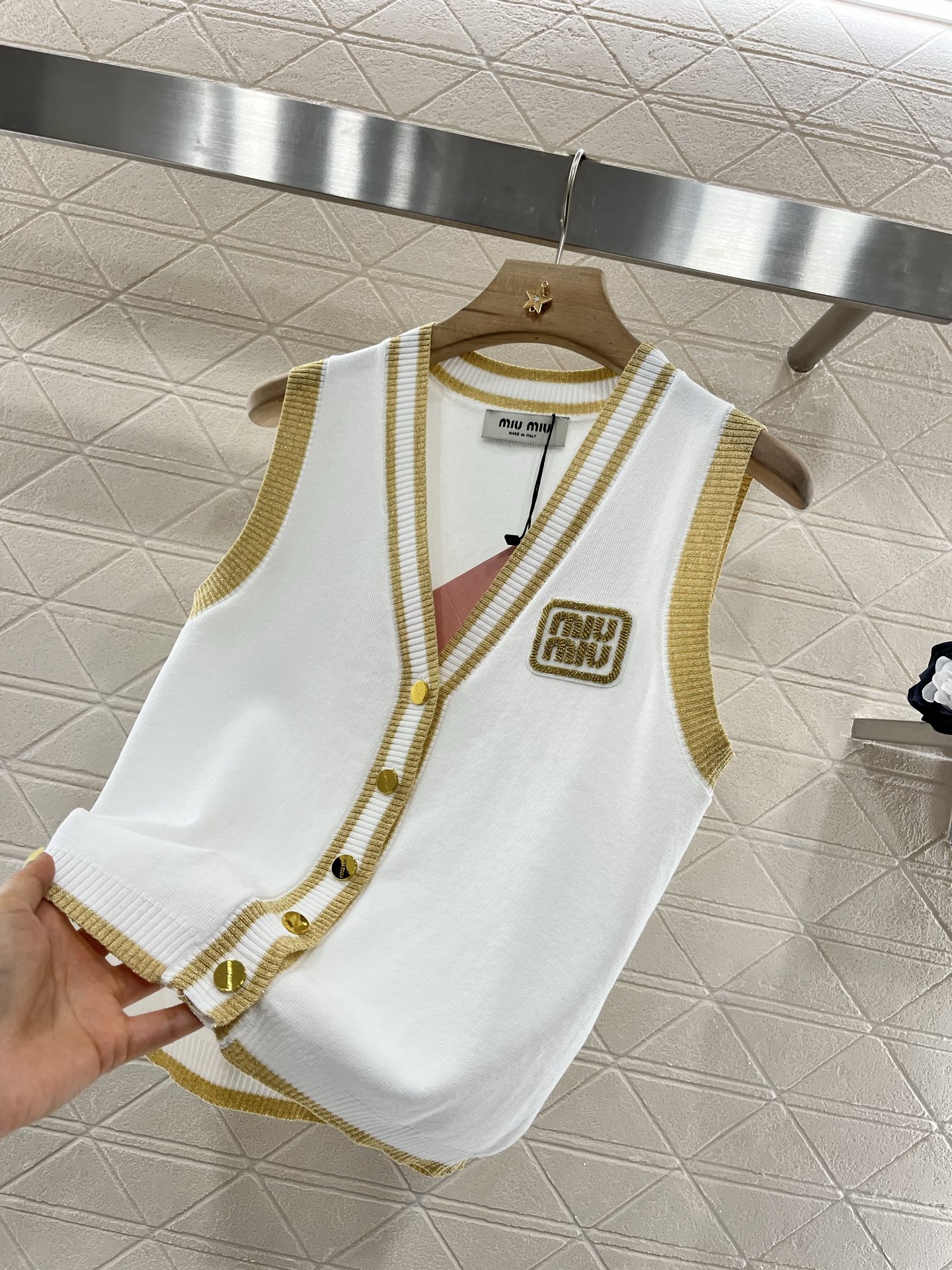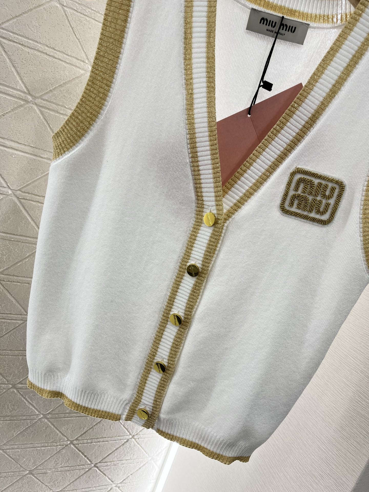 这款衣服是AAAAA 1:1 质量 (非常棒). 使用了和原版一模一样的材料. 商标部分也保持了和缪缪/Miu Miu一样. 图片拍摄是实物衣服拍摄, 您所收到的实物保证和我们图片一模一样.
