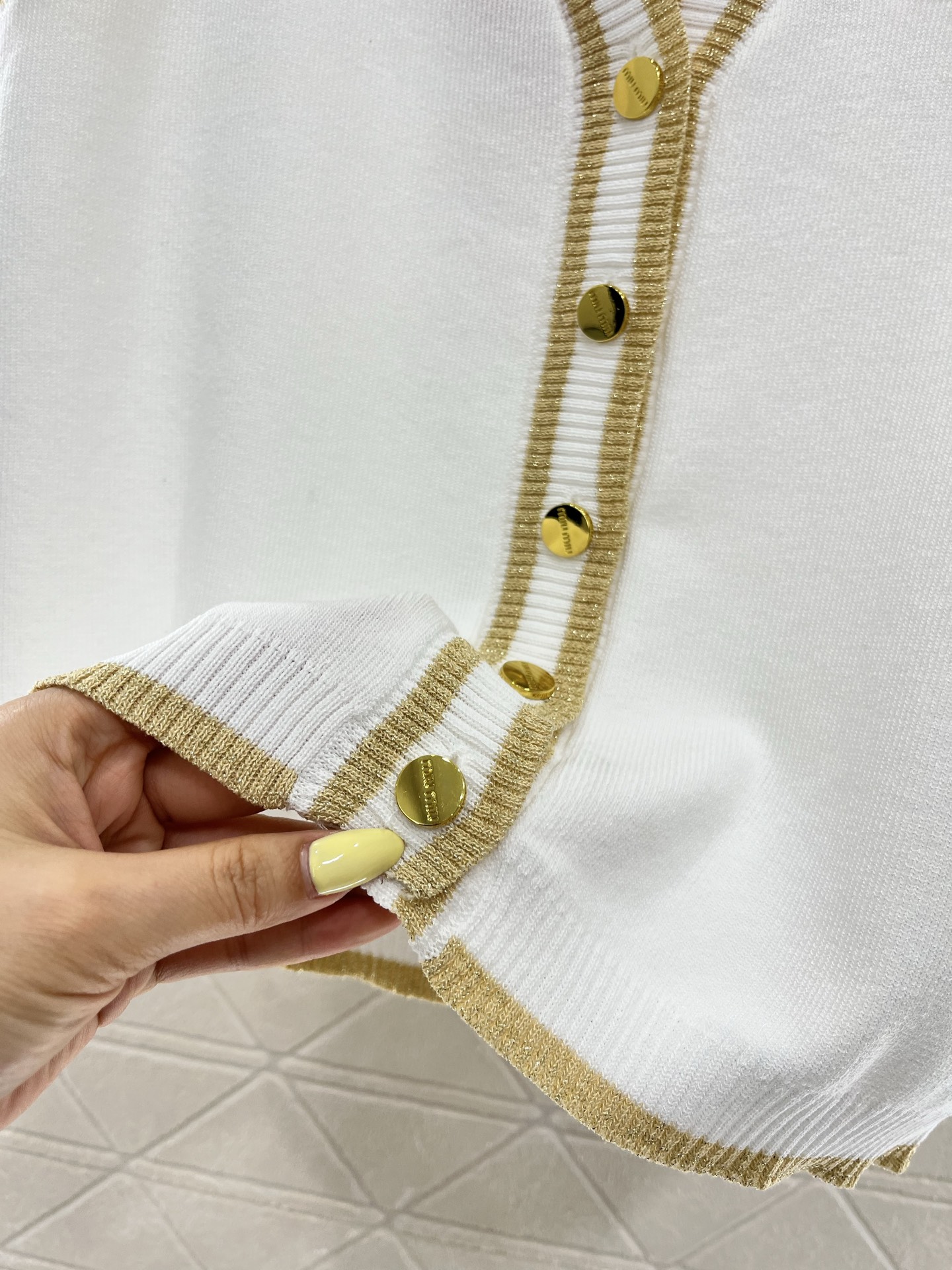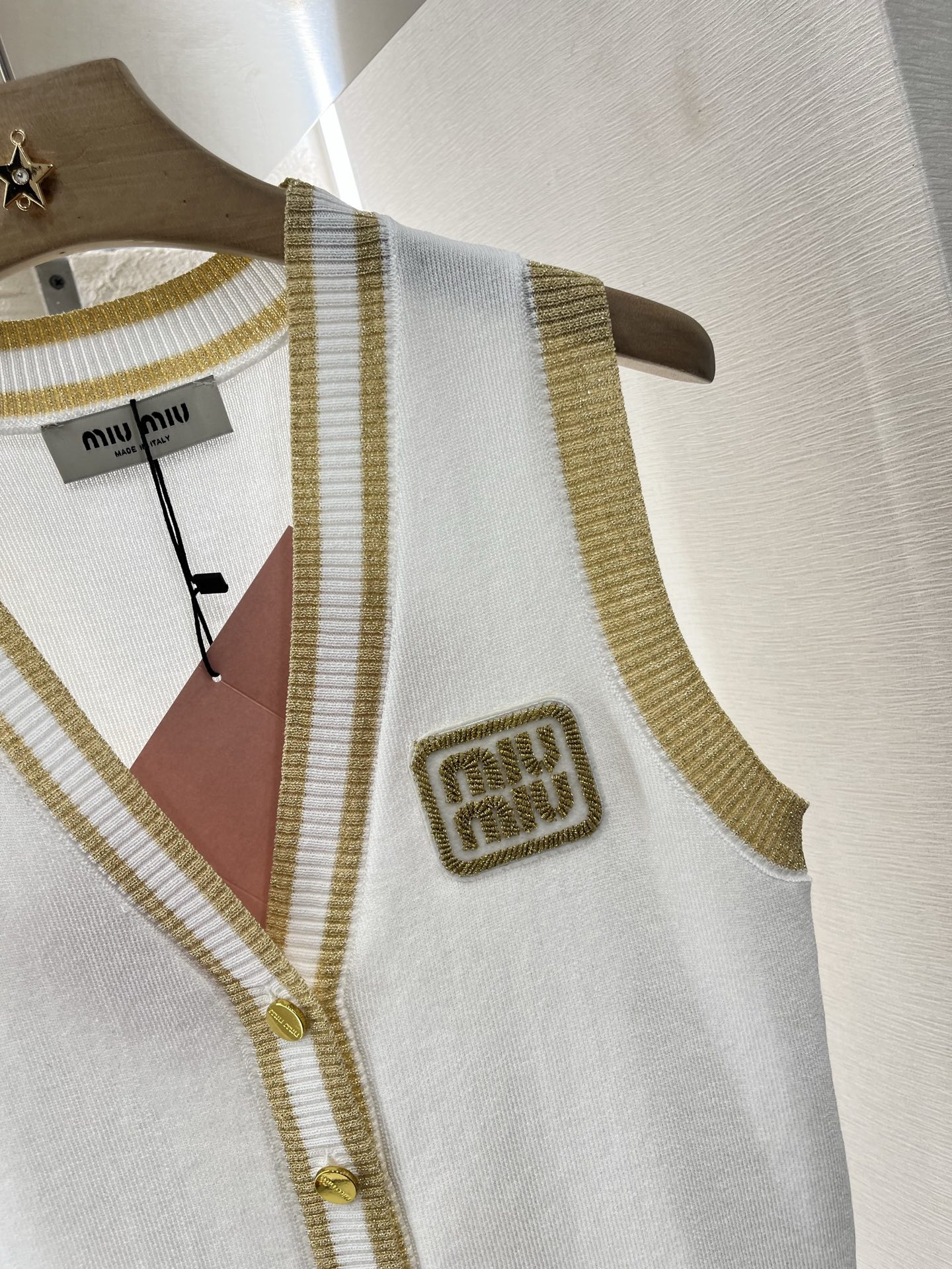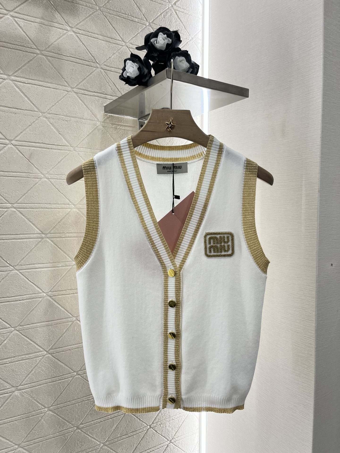 这款衣服是AAAAA 1:1 质量 (非常棒). 使用了和原版一模一样的材料. 商标部分也保持了和缪缪/Miu Miu一样. 图片拍摄是实物衣服拍摄, 您所收到的实物保证和我们图片一模一样.