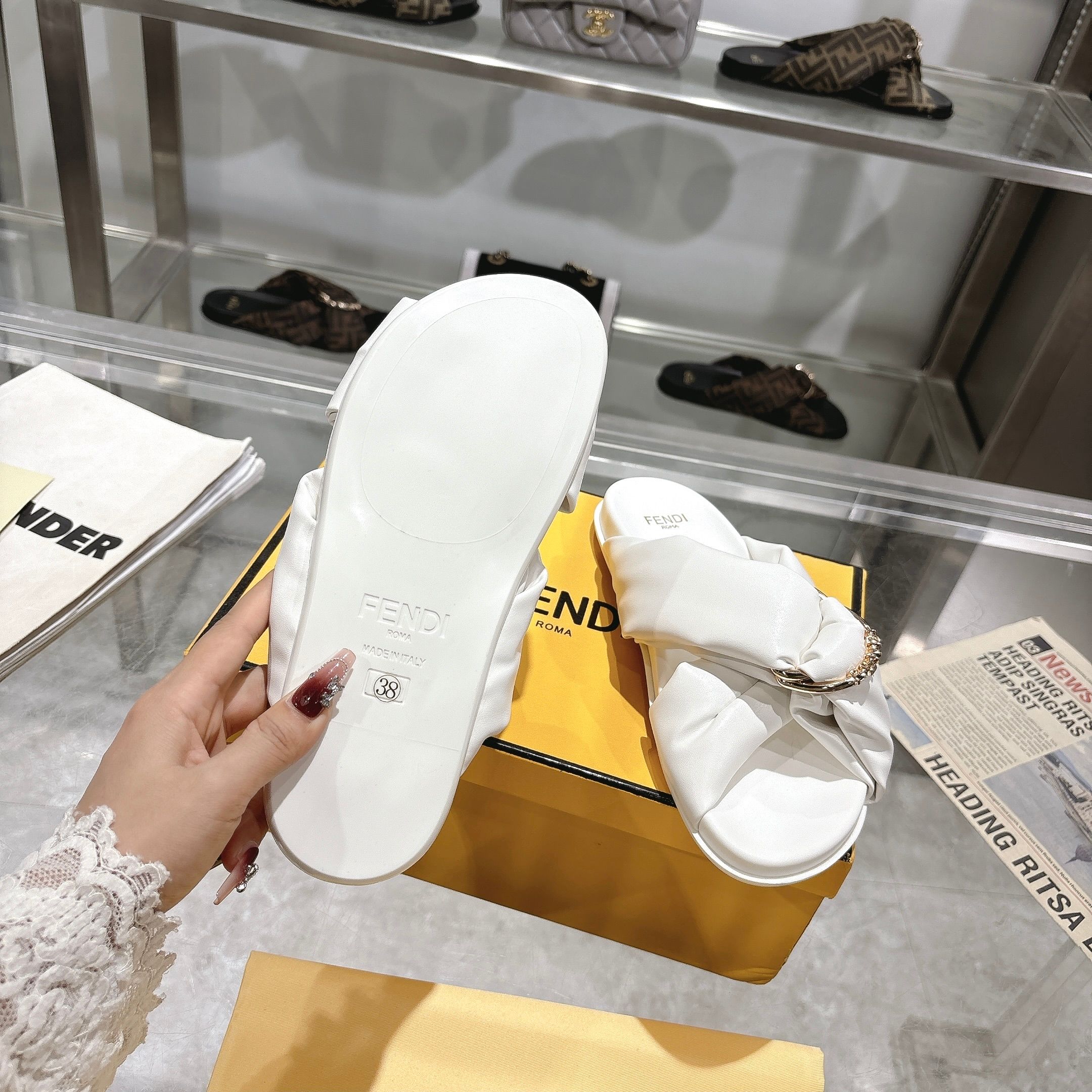 这款鞋子是AAAAA 1:1 质量 (非常棒). 使用了和原版一模一样的材料. 商标部分也保持了和芬迪/Fendi一样. 图片拍摄是实物鞋子拍摄, 您所收到的实物保证和我们图片一模一样.