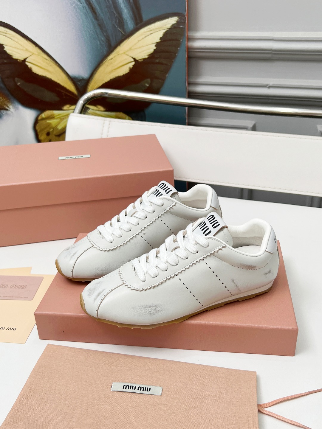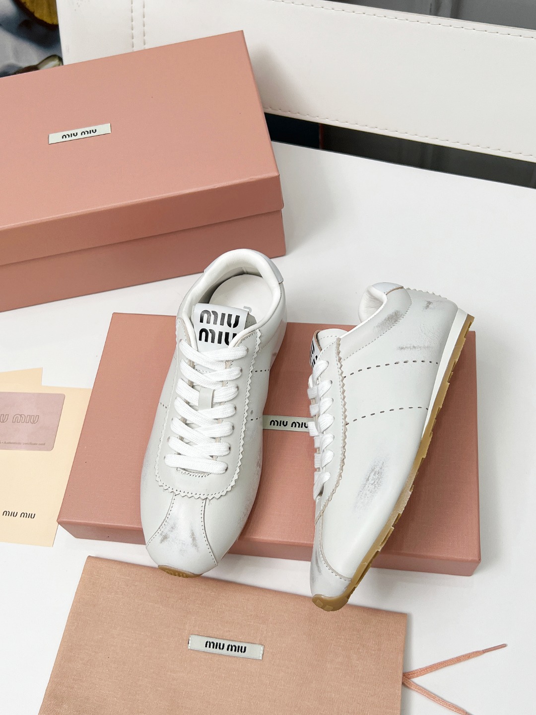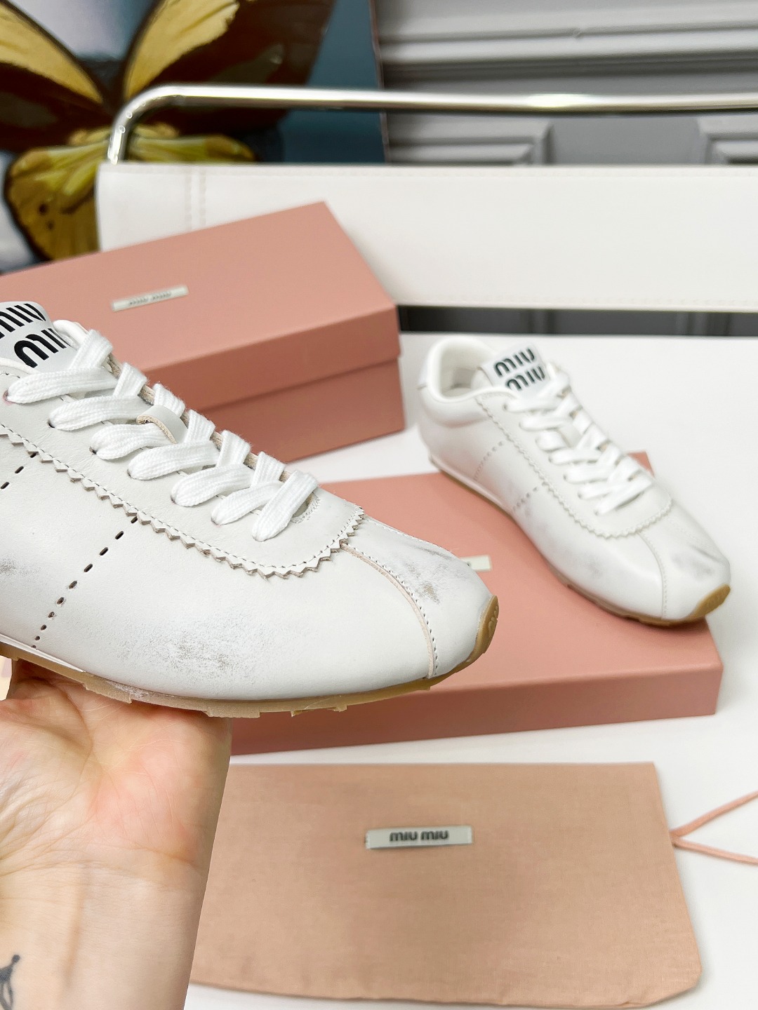 这款鞋子是AAAAA 1:1 质量 (非常棒). 使用了和原版一模一样的材料. 商标部分也保持了和缪缪/Miu Miu一样. 图片拍摄是实物鞋子拍摄, 您所收到的实物保证和我们图片一模一样.