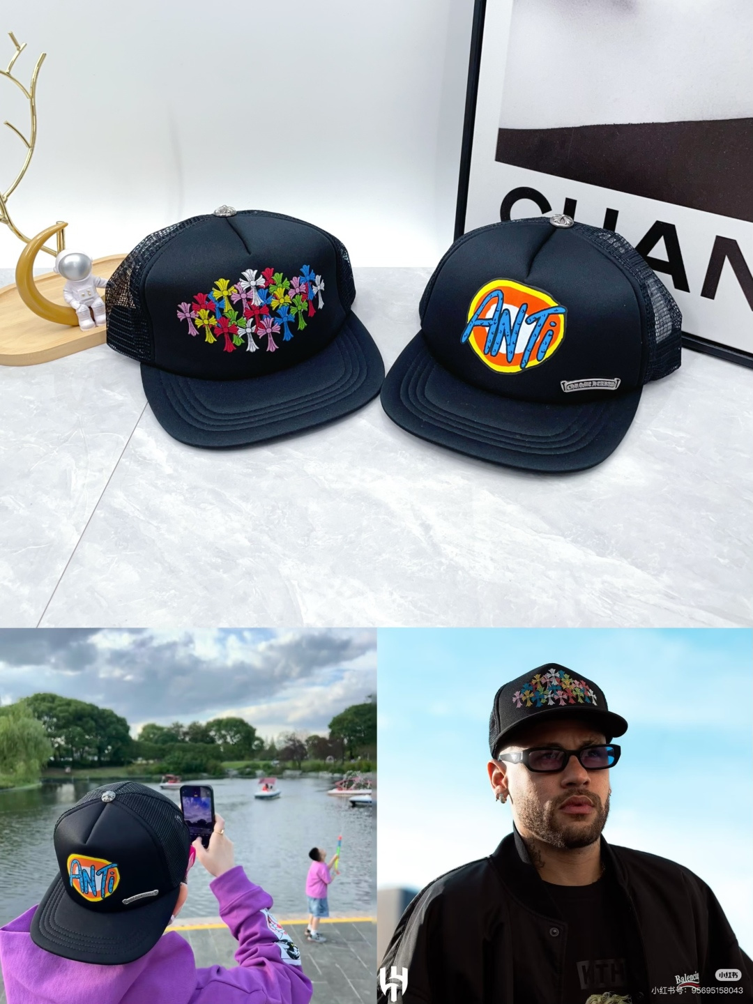 这款帽子是AAAAA 1:1 质量 (非常棒). 使用了和原版一模一样的材料. 商标部分也保持了和克罗心/Chrome Hearts一样. 图片拍摄是实物帽子拍摄, 您所收到的实物保证和我们图片一模一样.
