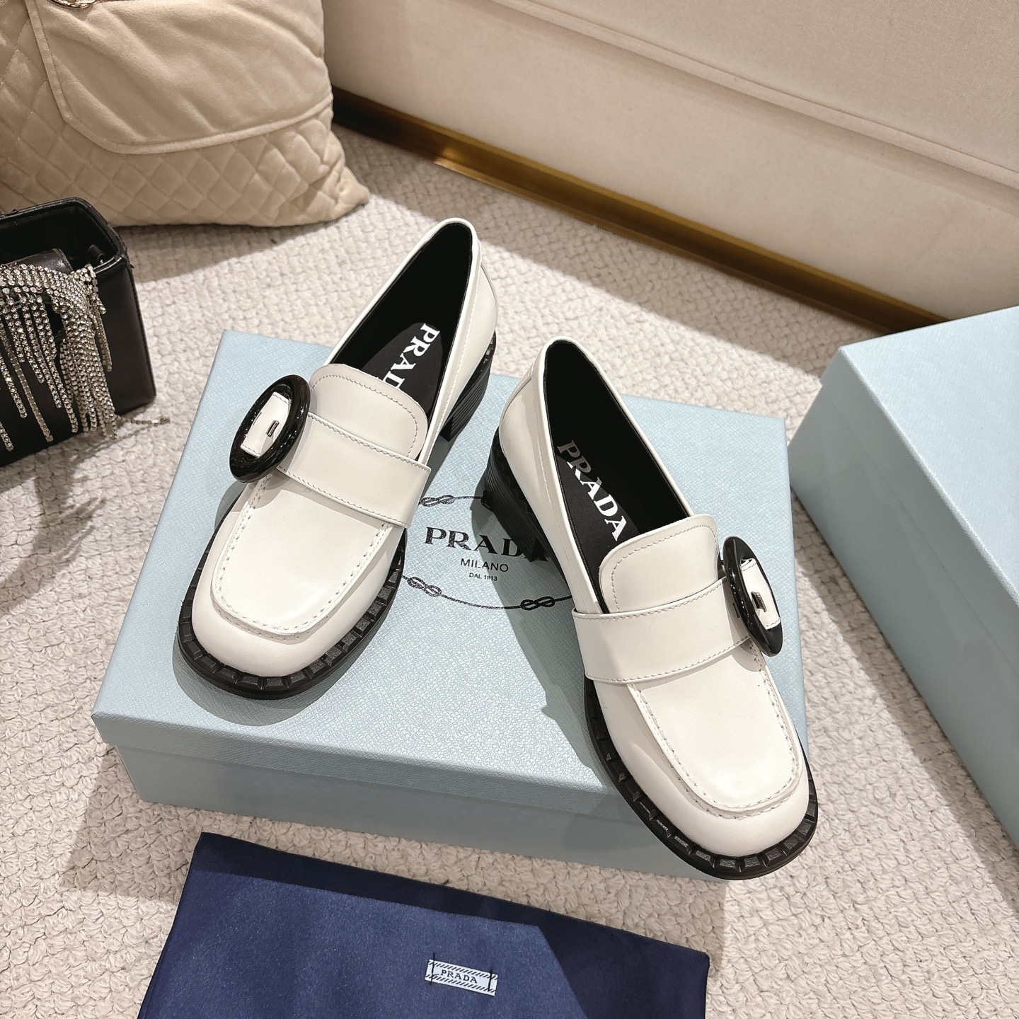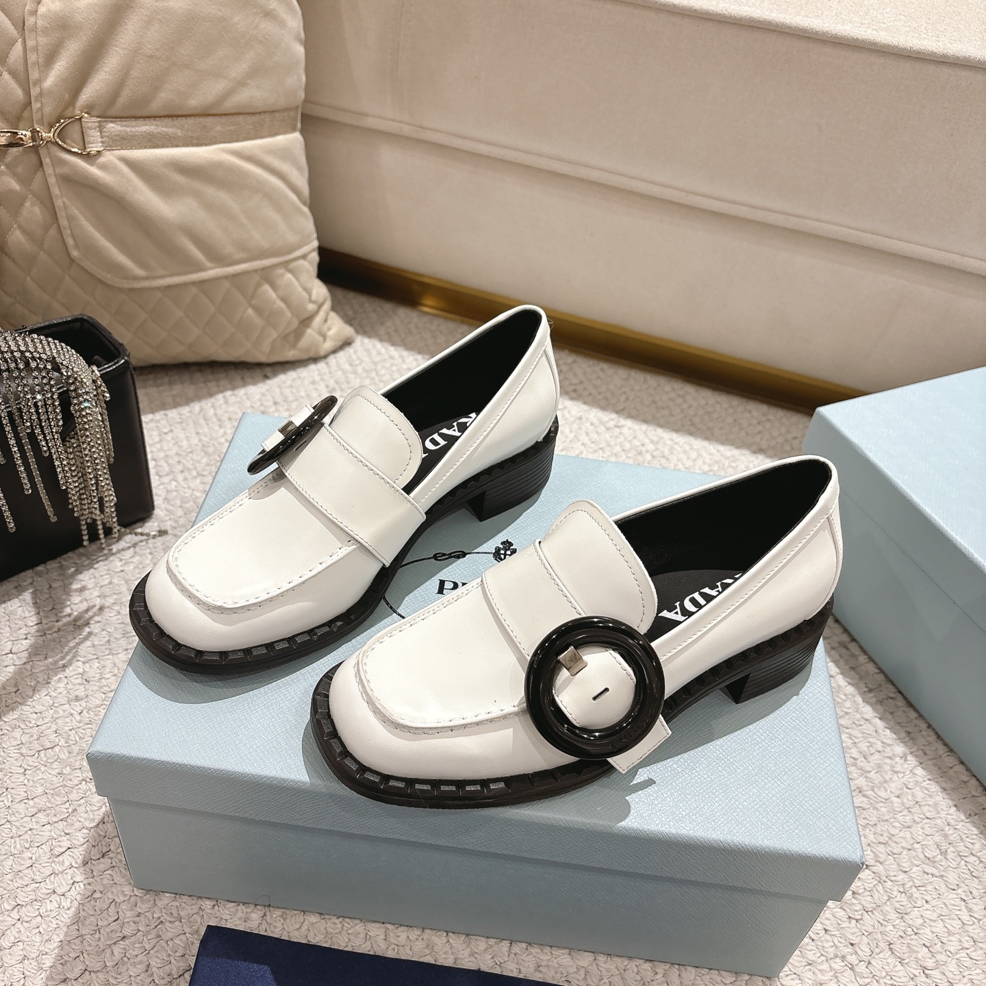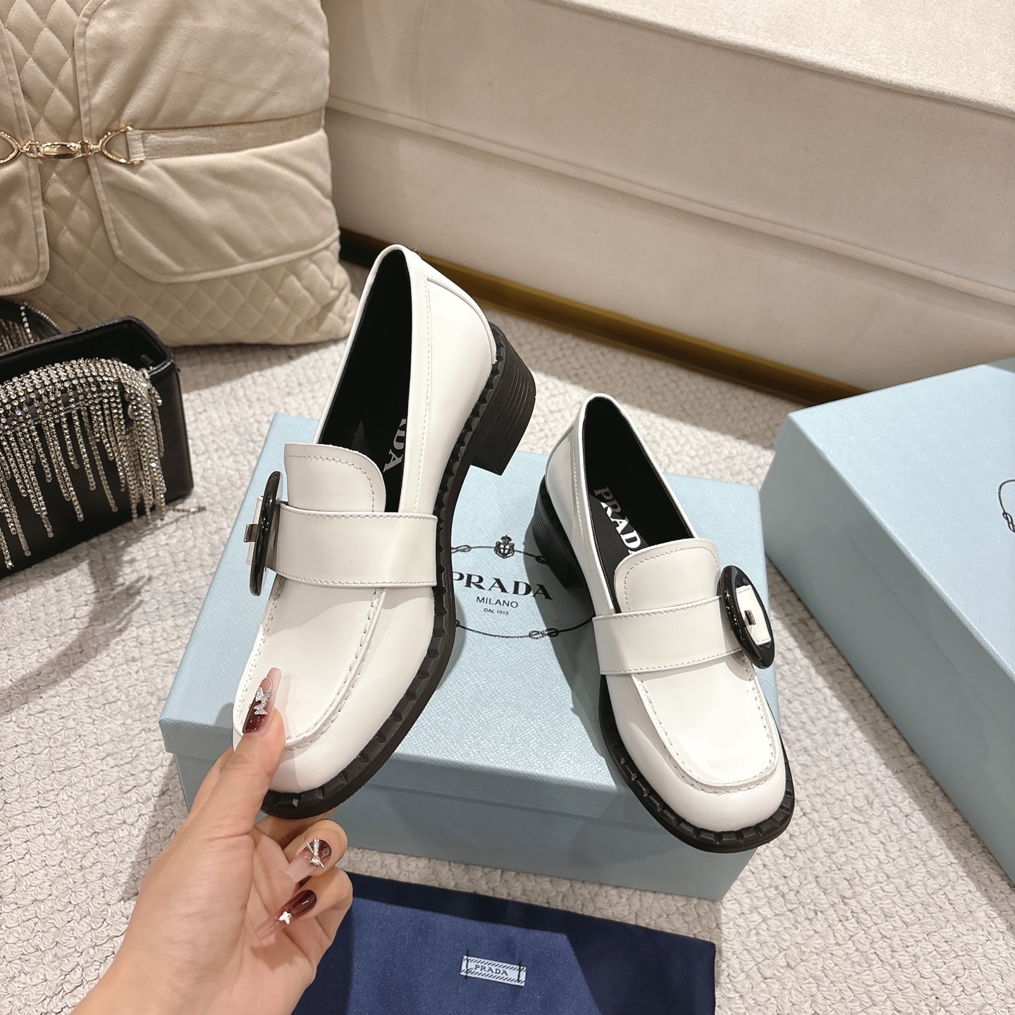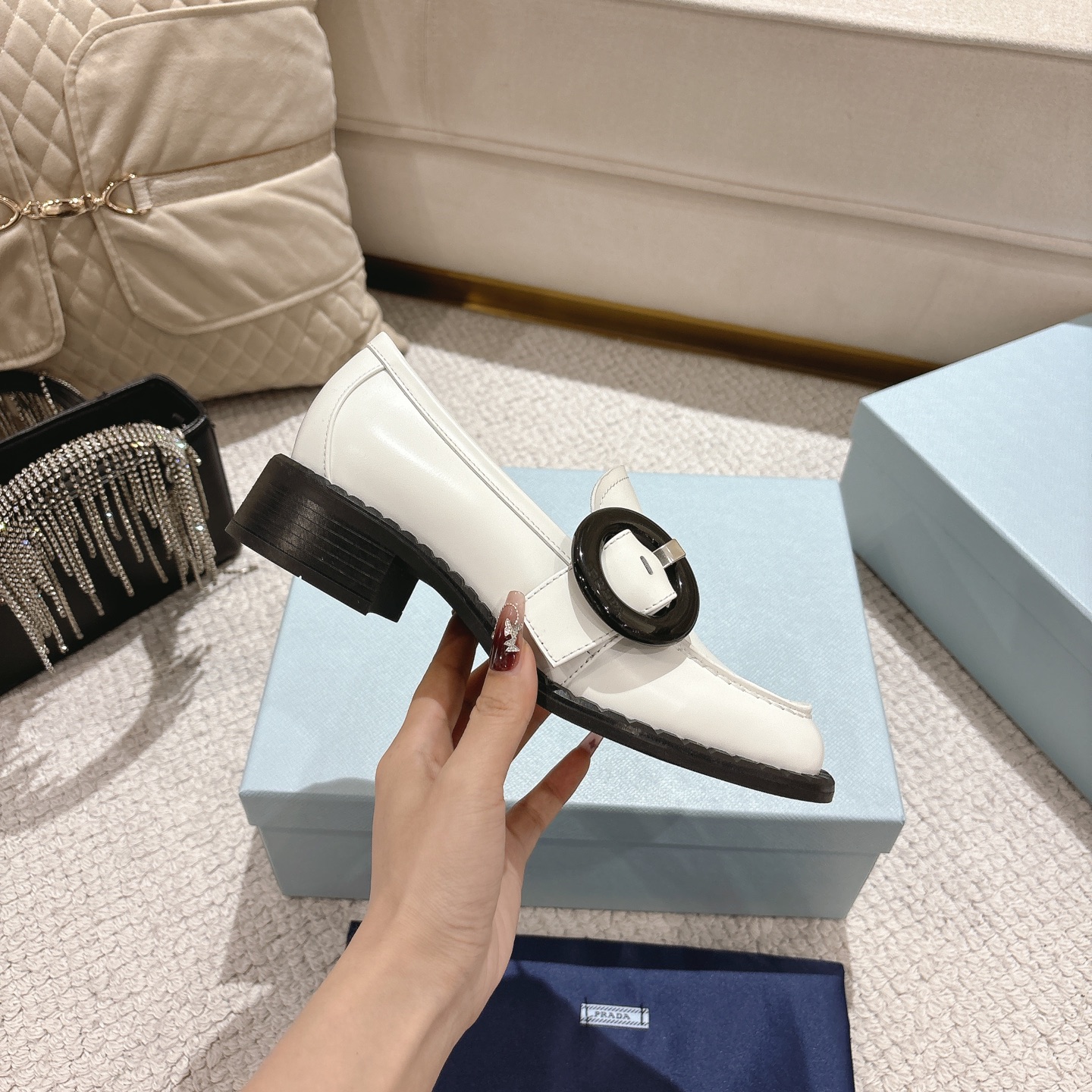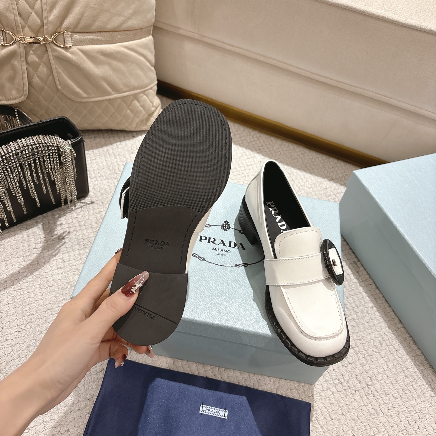 这款鞋子是AAAAA 1:1 质量 (非常棒). 使用了和原版一模一样的材料. 商标部分也保持了和普拉达/Prada一样. 图片拍摄是实物鞋子拍摄, 您所收到的实物保证和我们图片一模一样.