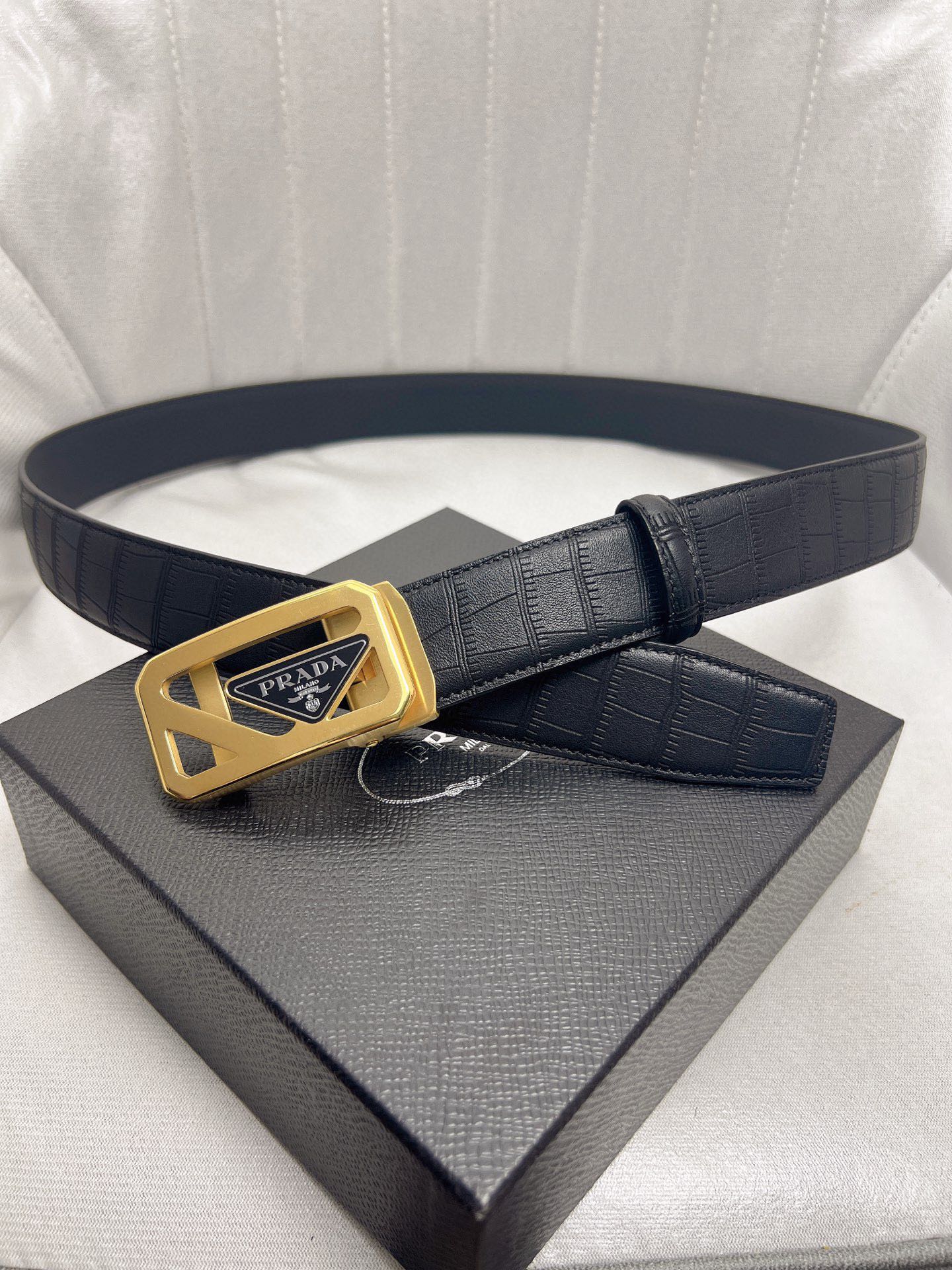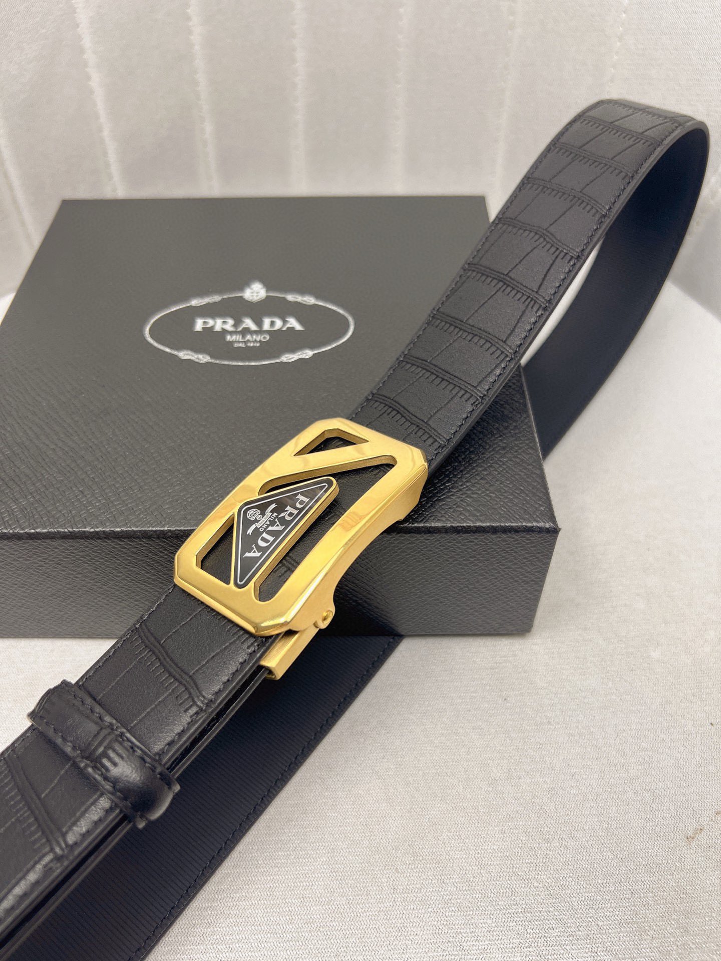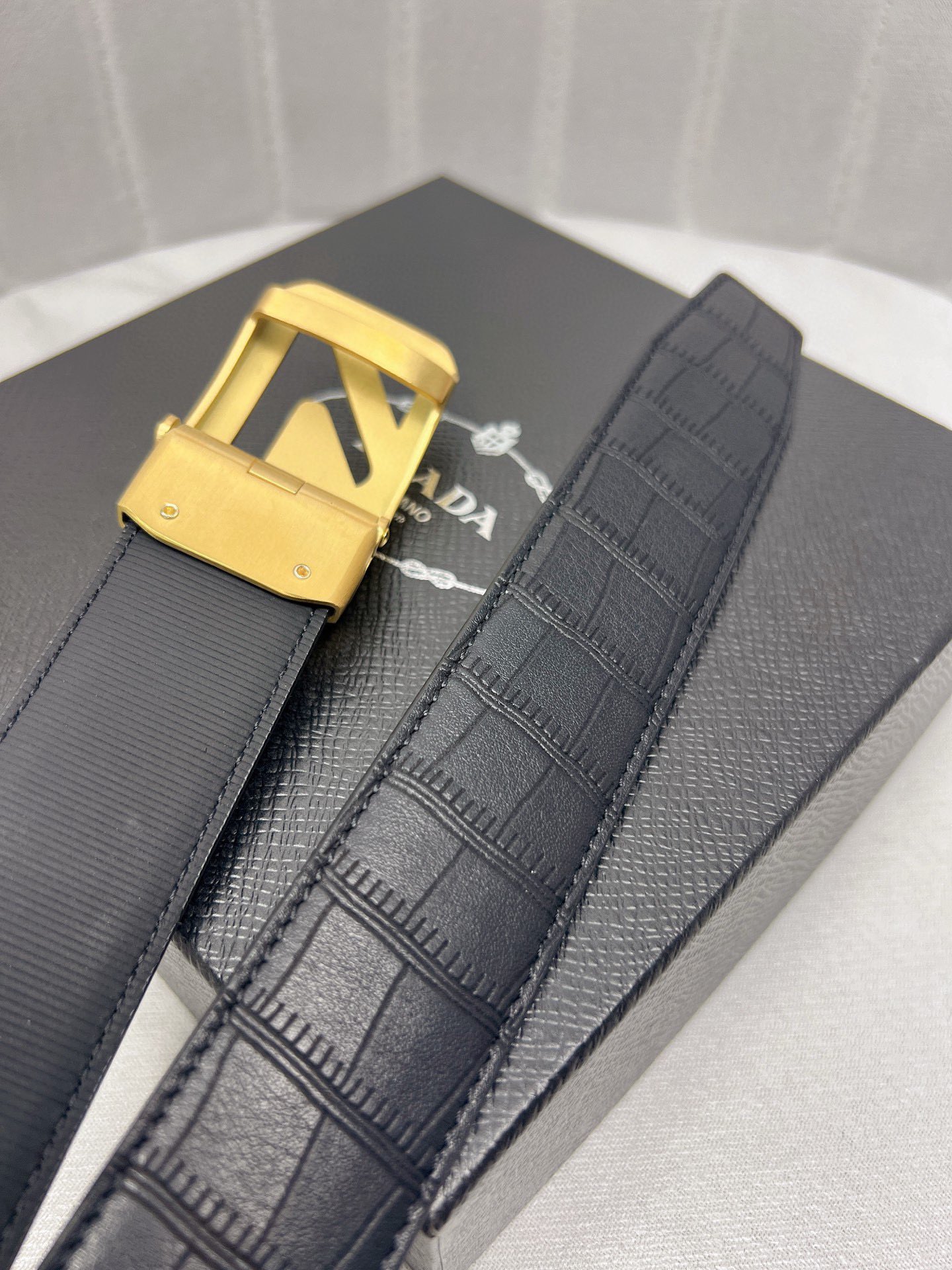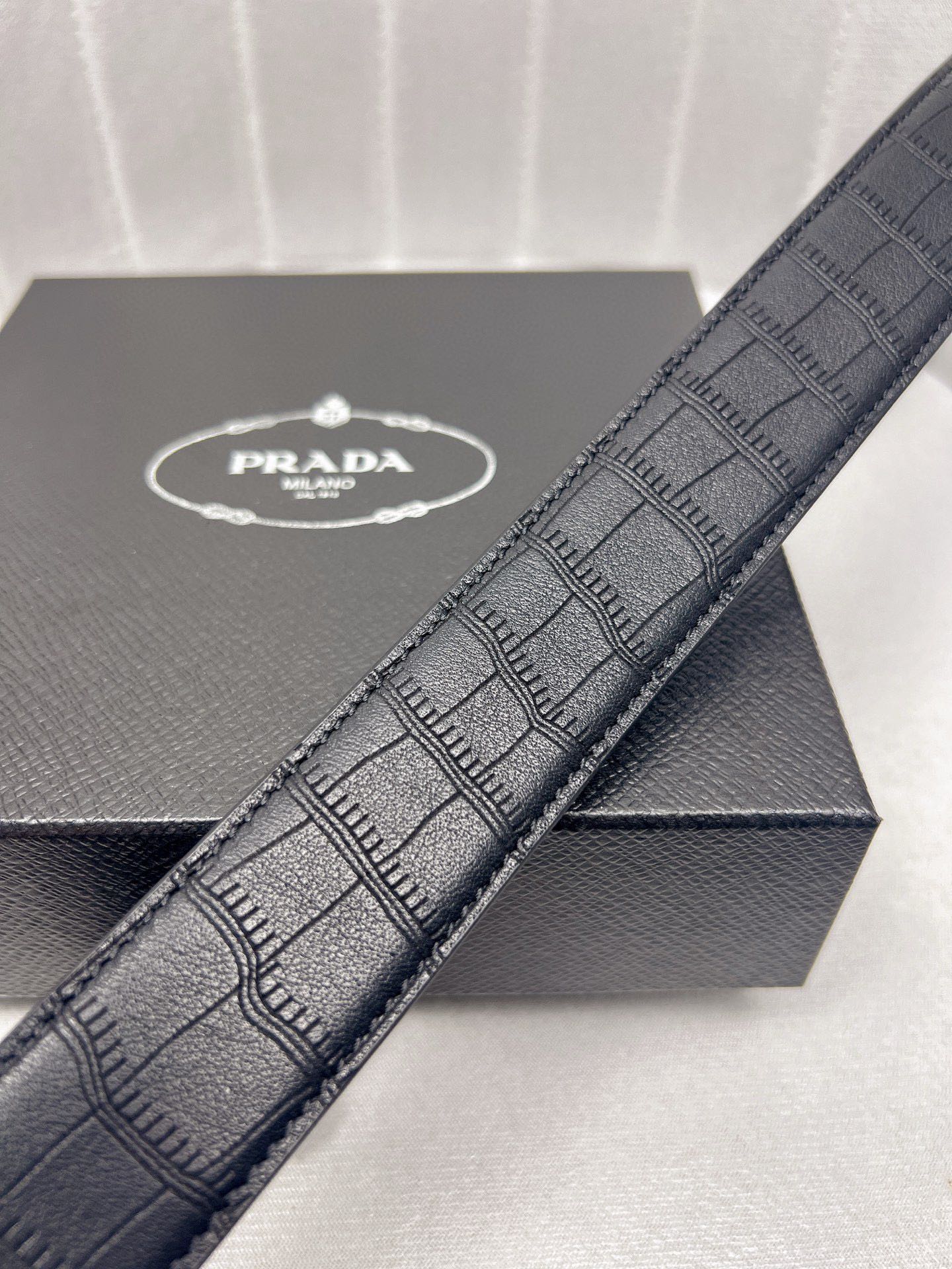 这款皮带是AAAAA 1:1 质量 (非常棒). 使用了和原版一模一样的材料. 商标部分也保持了和普拉达/Prada一样. 图片拍摄是实物皮带拍摄, 您所收到的实物保证和我们图片一模一样.