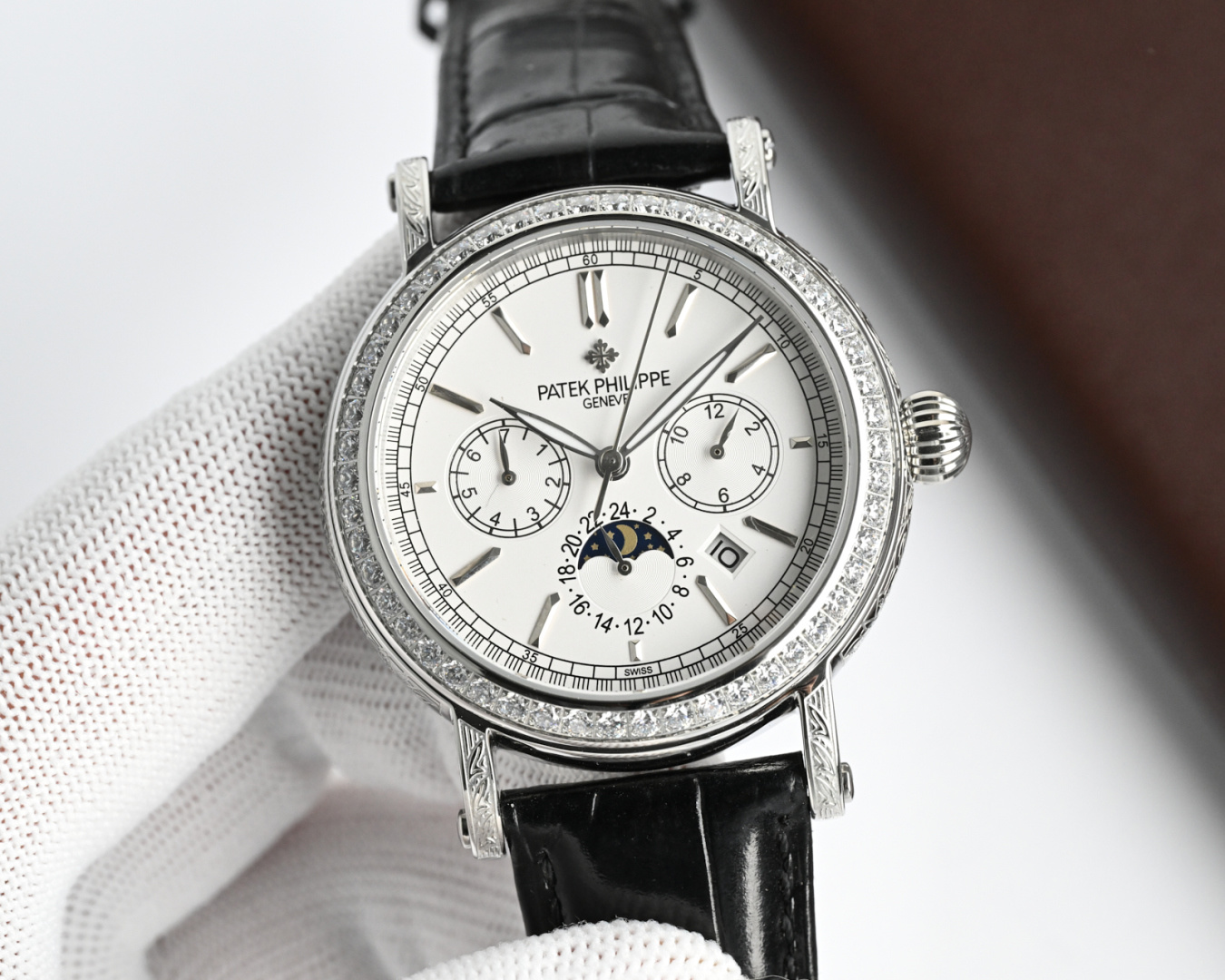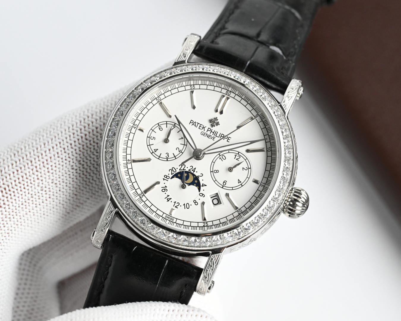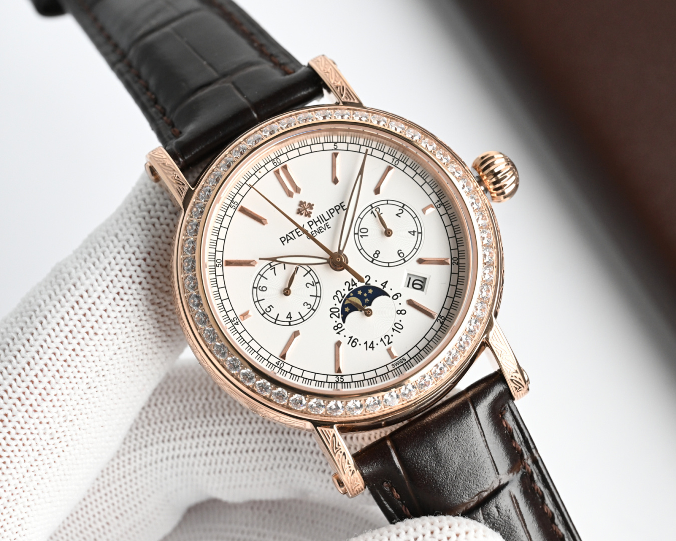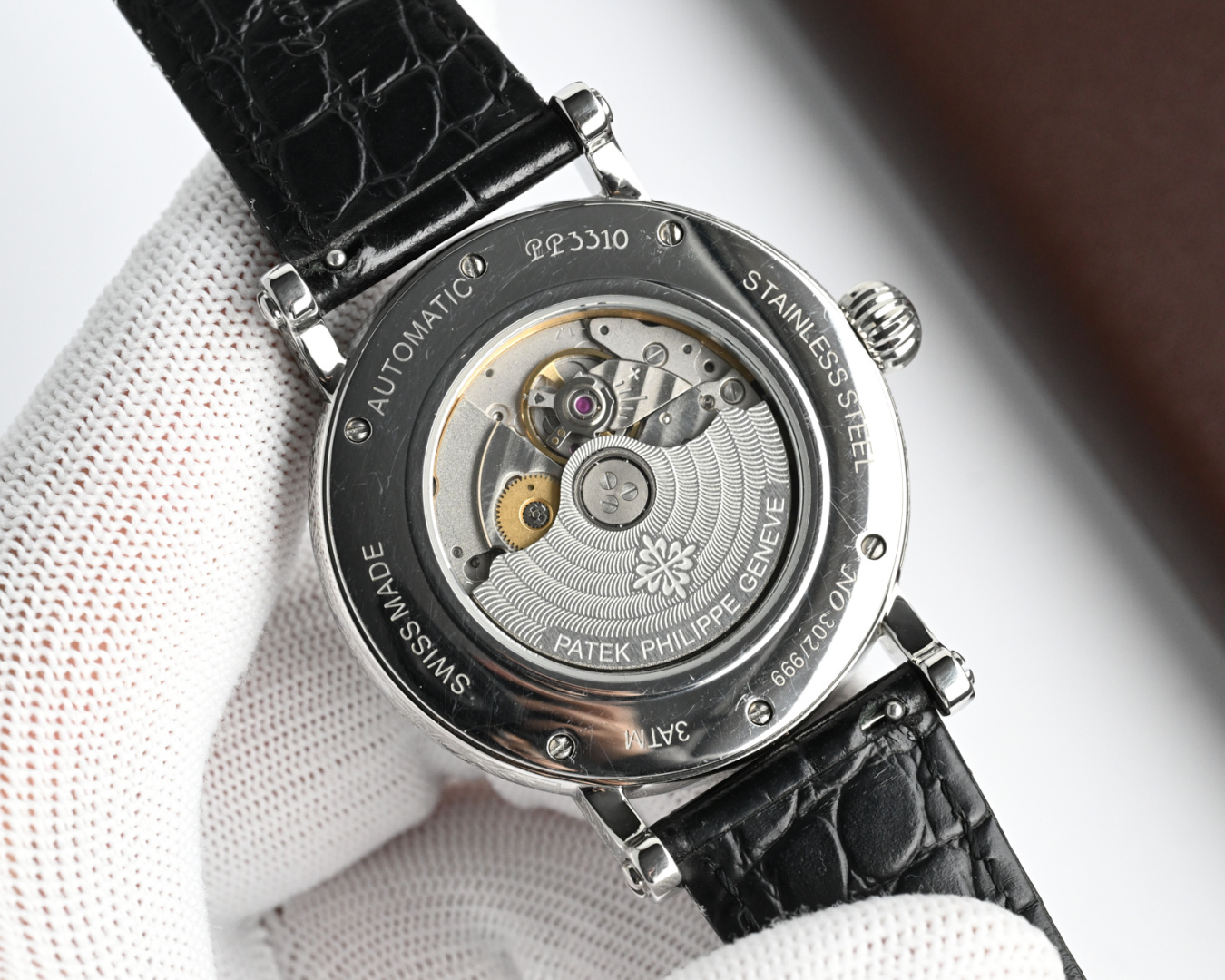 这款手表是AAAAA 1:1 质量 (非常棒). 使用了和原版一模一样的材料. 商标部分也保持了和百达翡丽/Patek Philippe一样. 图片拍摄是实物手表拍摄, 您所收到的实物保证和我们图片一模一样.