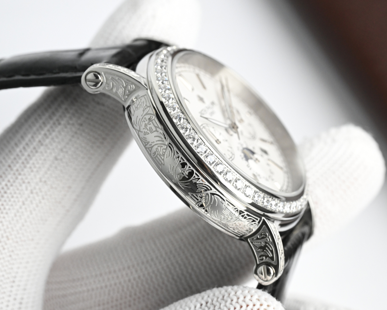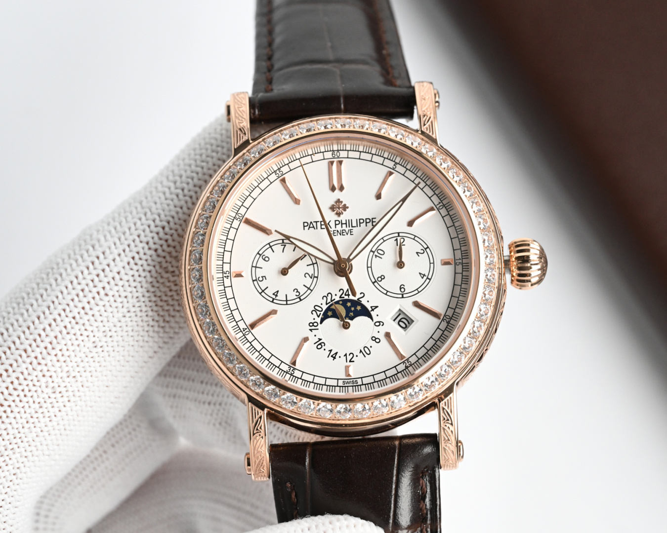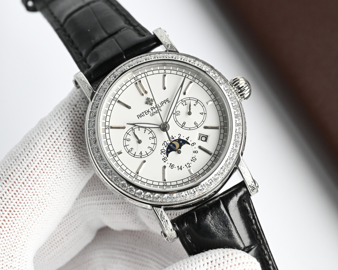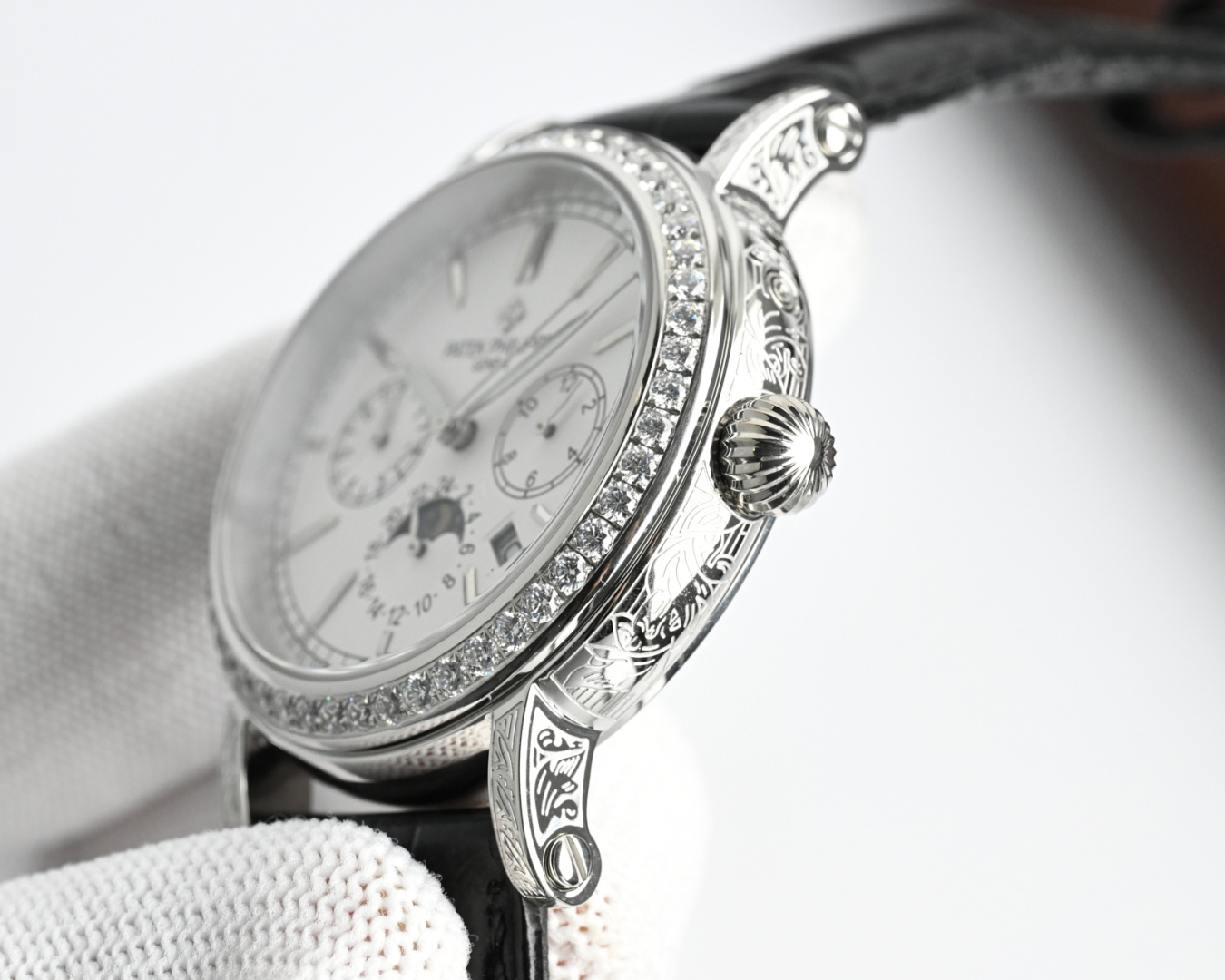 这款手表是AAAAA 1:1 质量 (非常棒). 使用了和原版一模一样的材料. 商标部分也保持了和百达翡丽/Patek Philippe一样. 图片拍摄是实物手表拍摄, 您所收到的实物保证和我们图片一模一样.