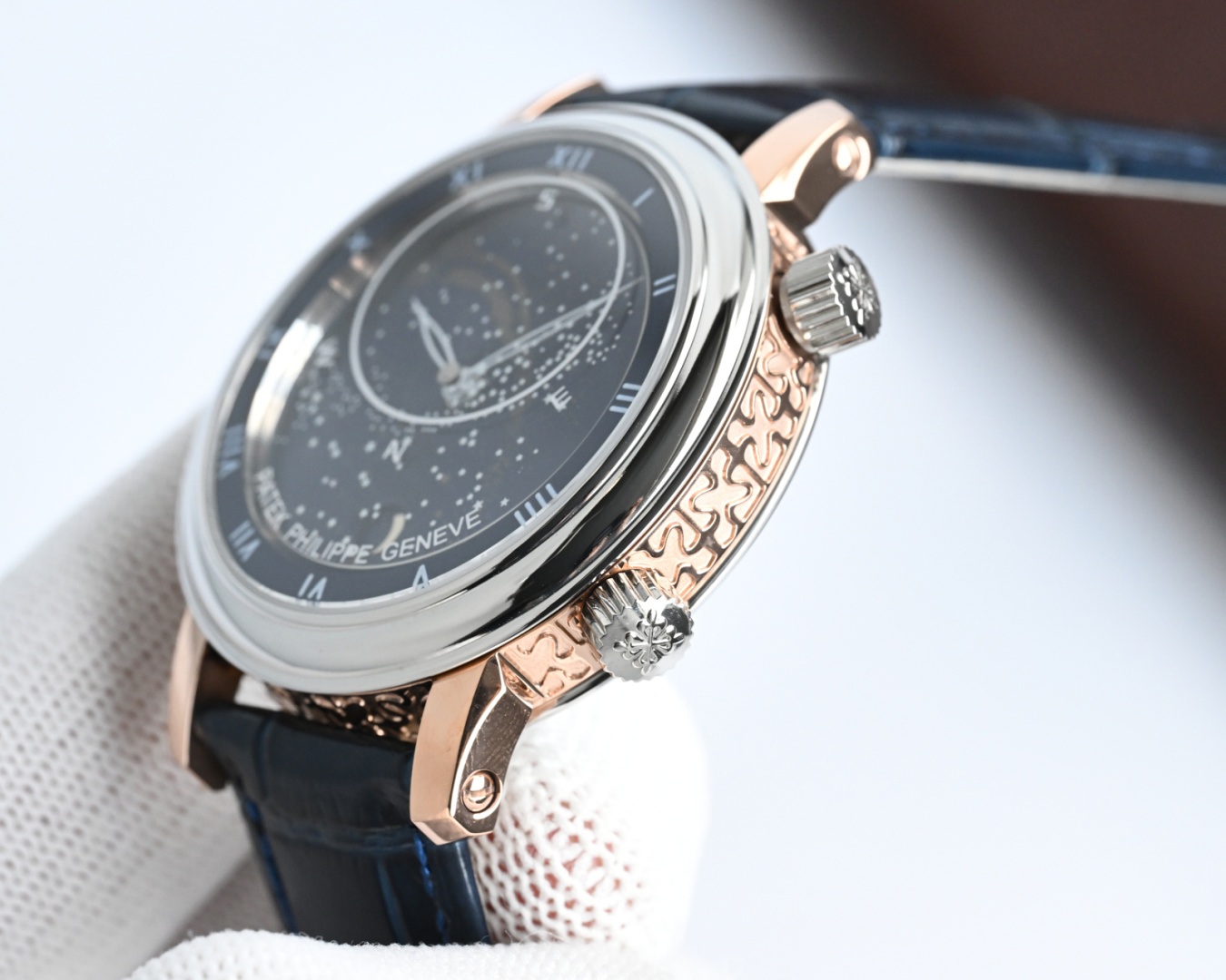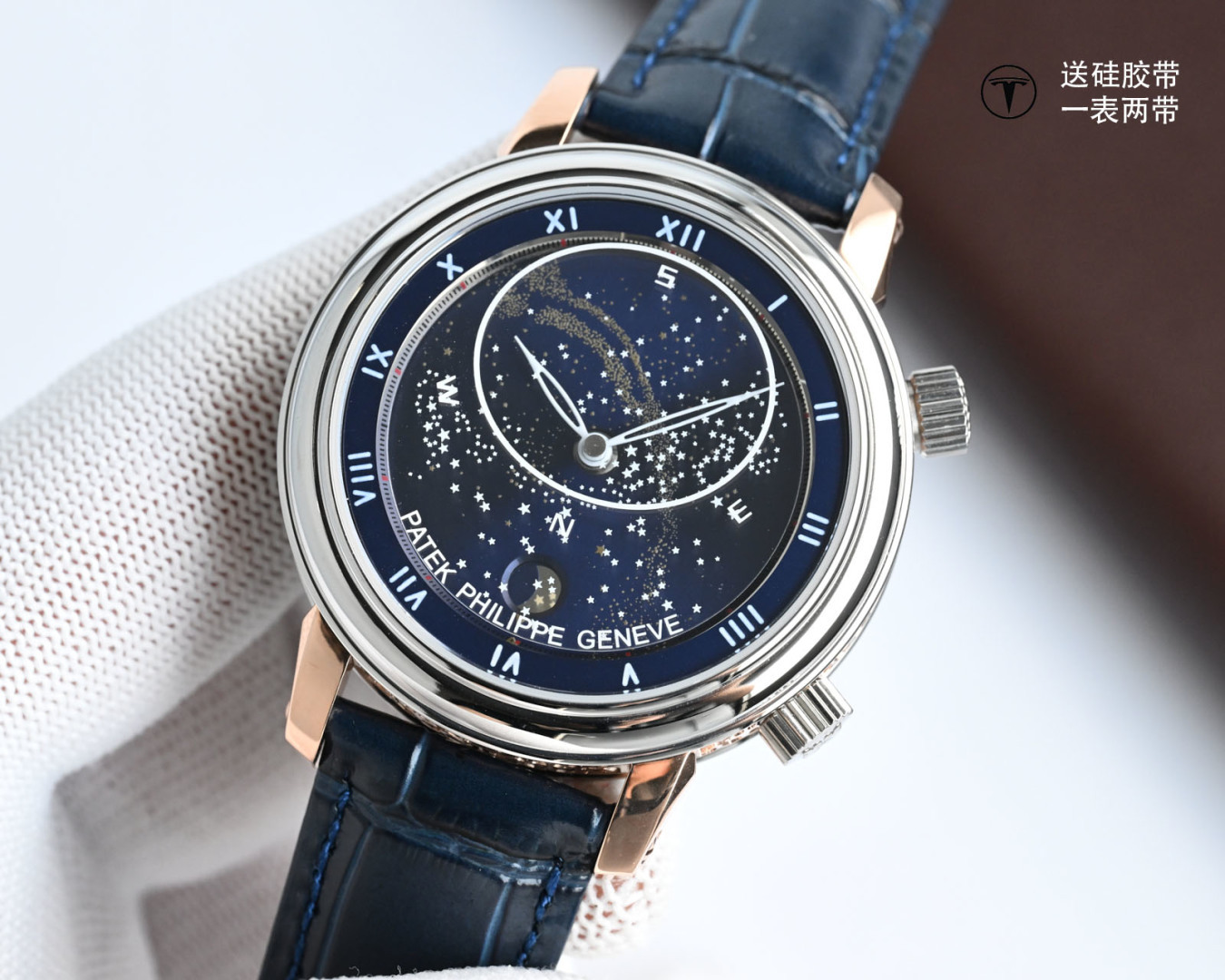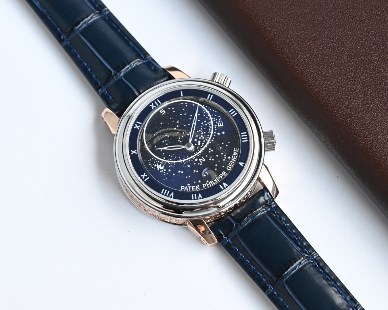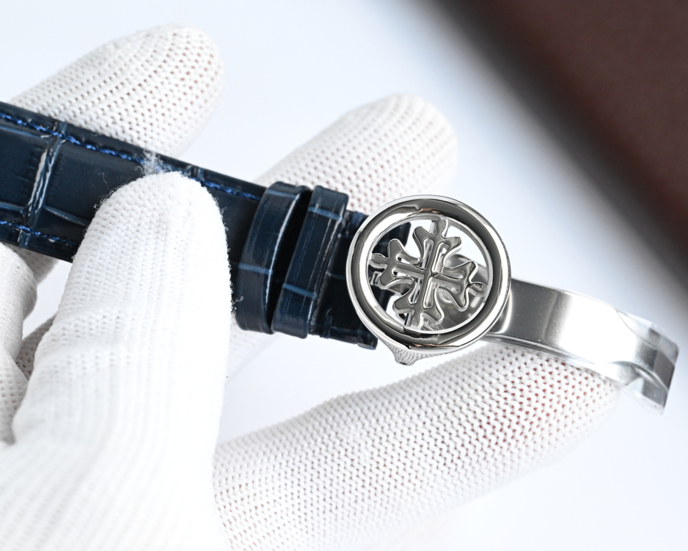 这款手表是AAAAA 1:1 质量 (非常棒). 使用了和原版一模一样的材料. 商标部分也保持了和百达翡丽/Patek Philippe一样. 图片拍摄是实物手表拍摄, 您所收到的实物保证和我们图片一模一样.