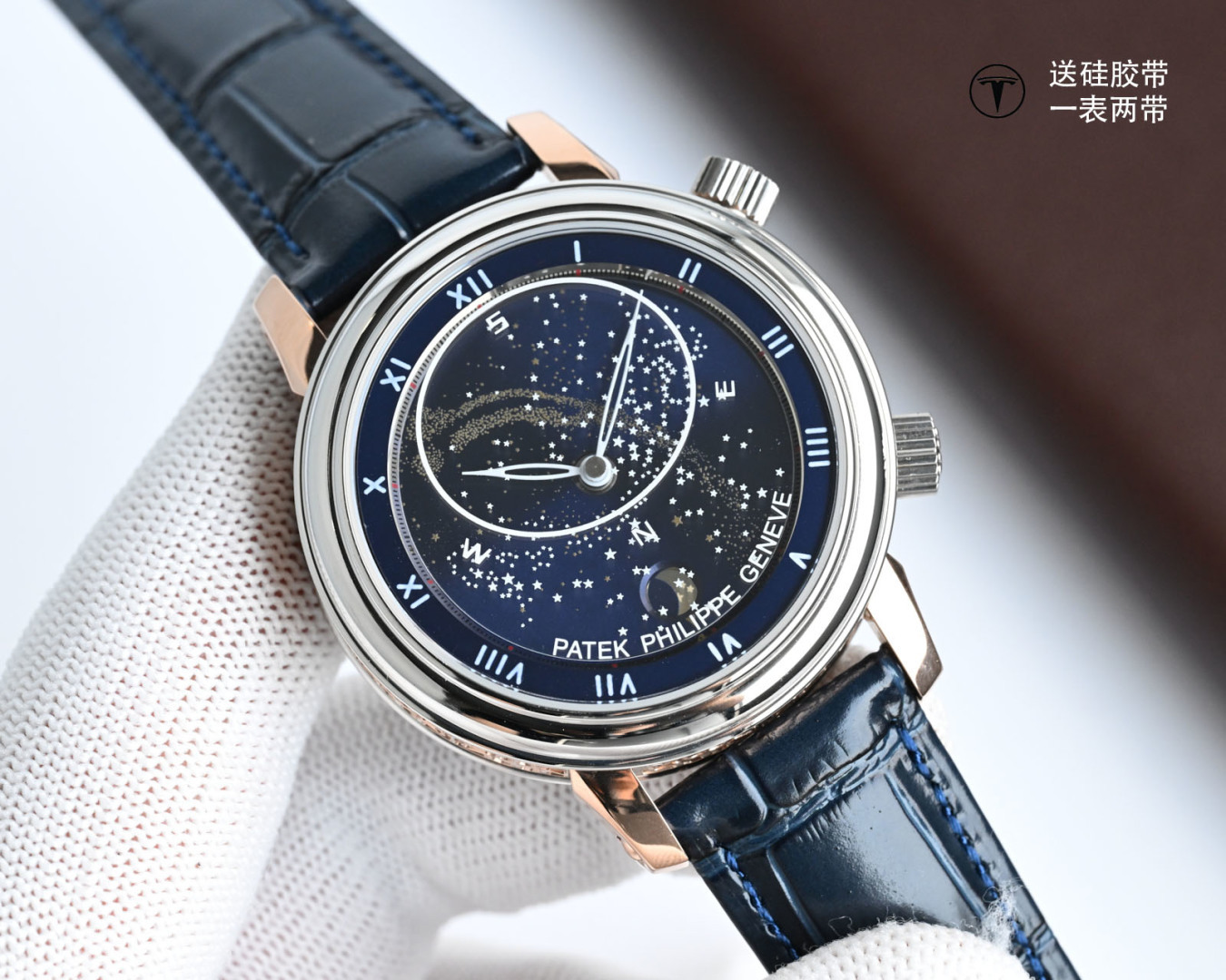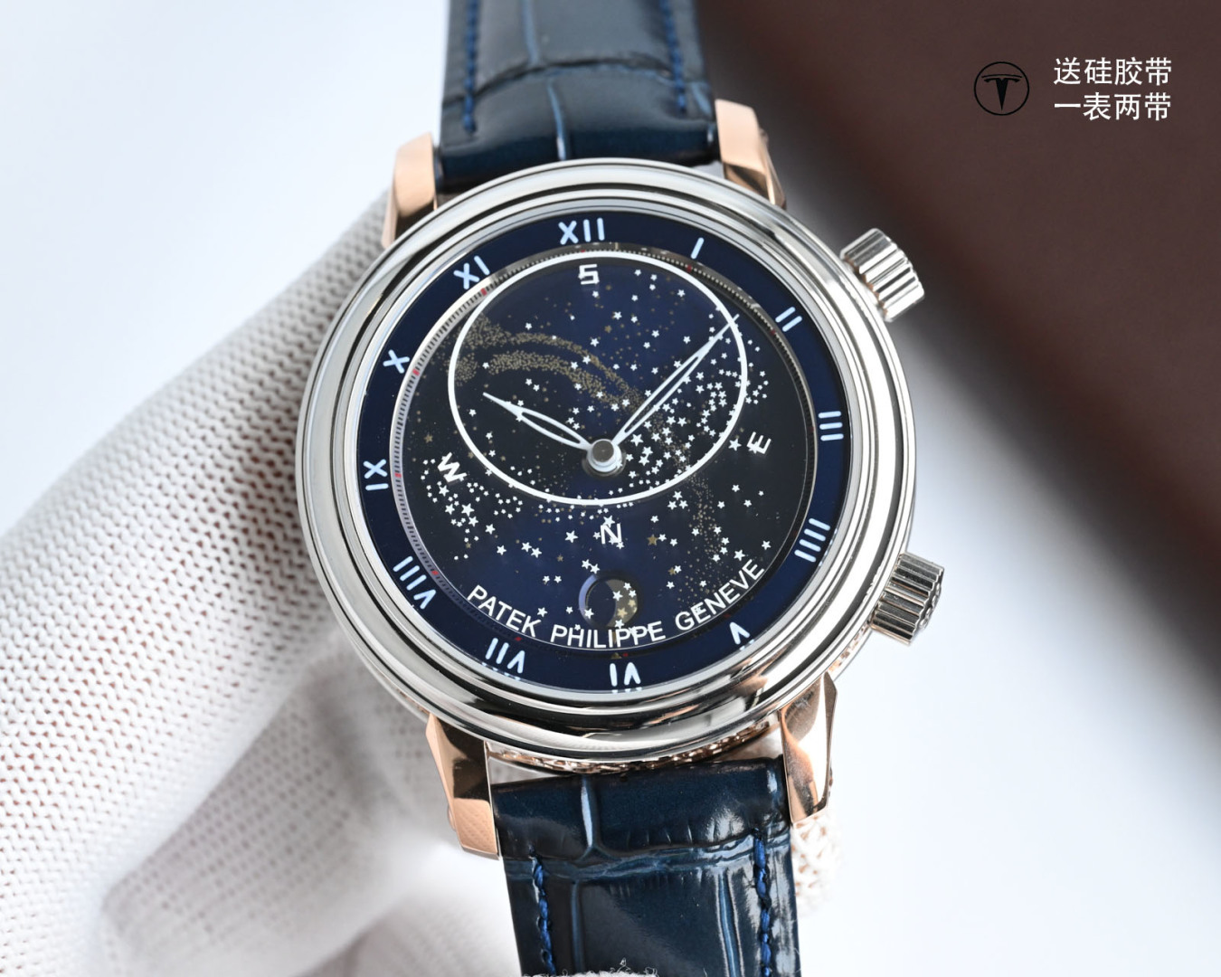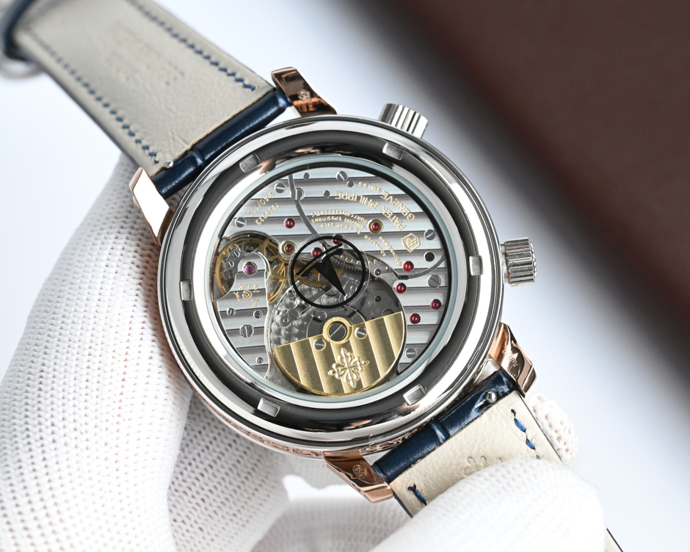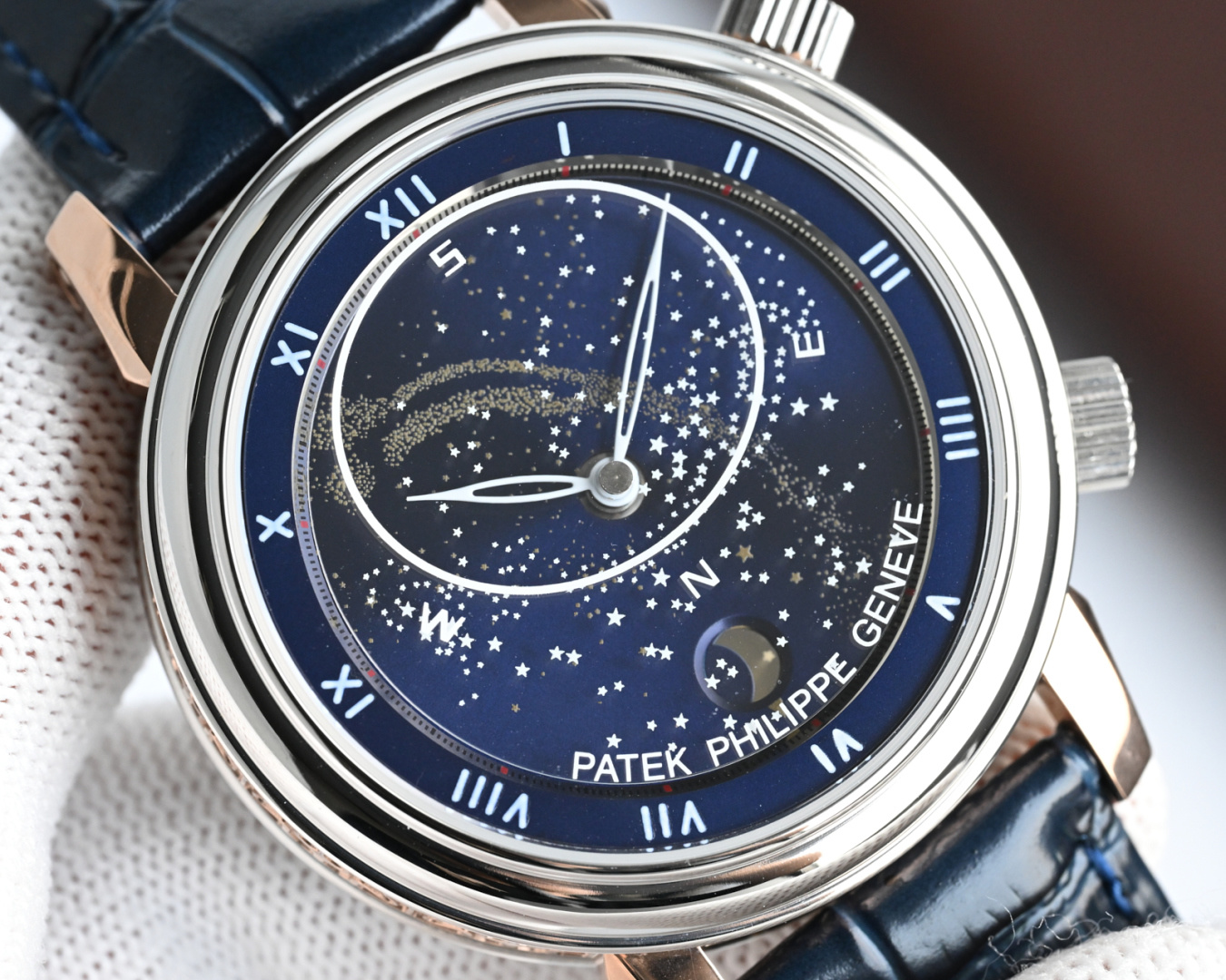 这款手表是AAAAA 1:1 质量 (非常棒). 使用了和原版一模一样的材料. 商标部分也保持了和百达翡丽/Patek Philippe一样. 图片拍摄是实物手表拍摄, 您所收到的实物保证和我们图片一模一样.