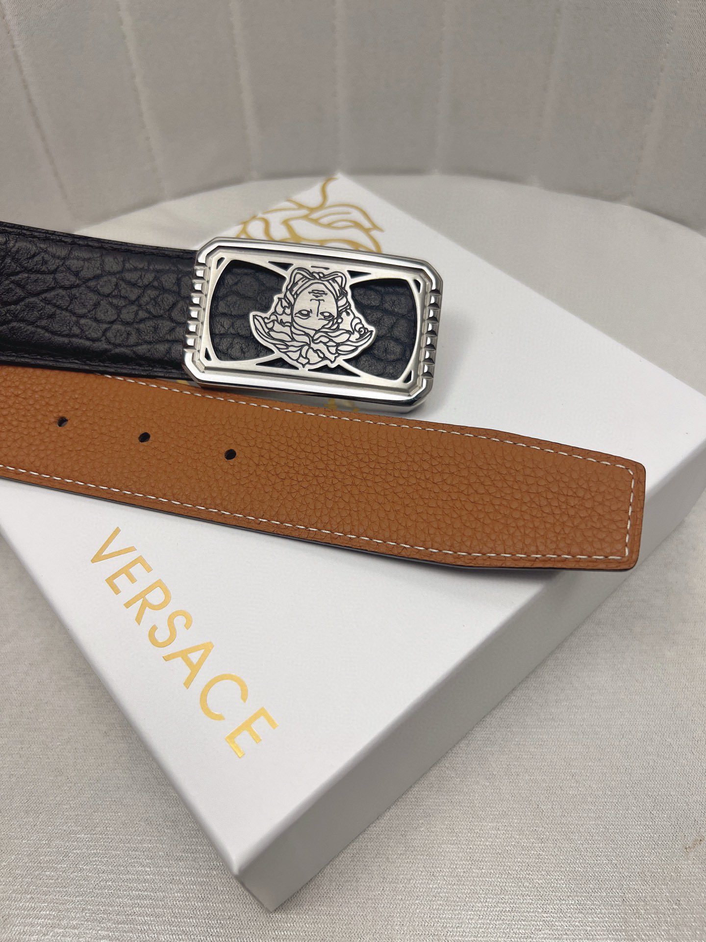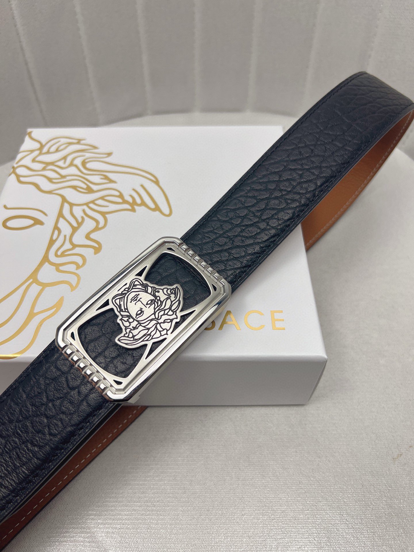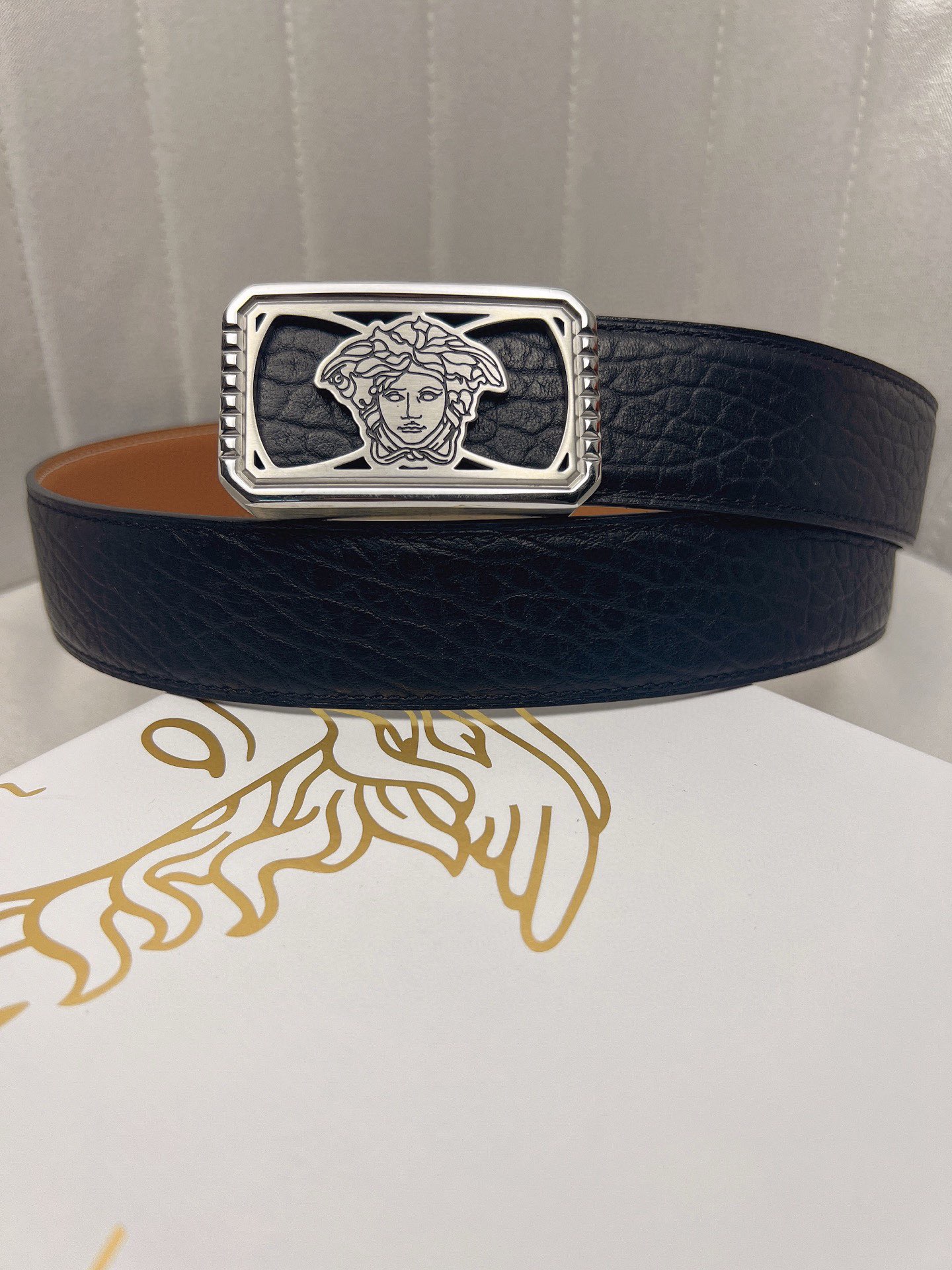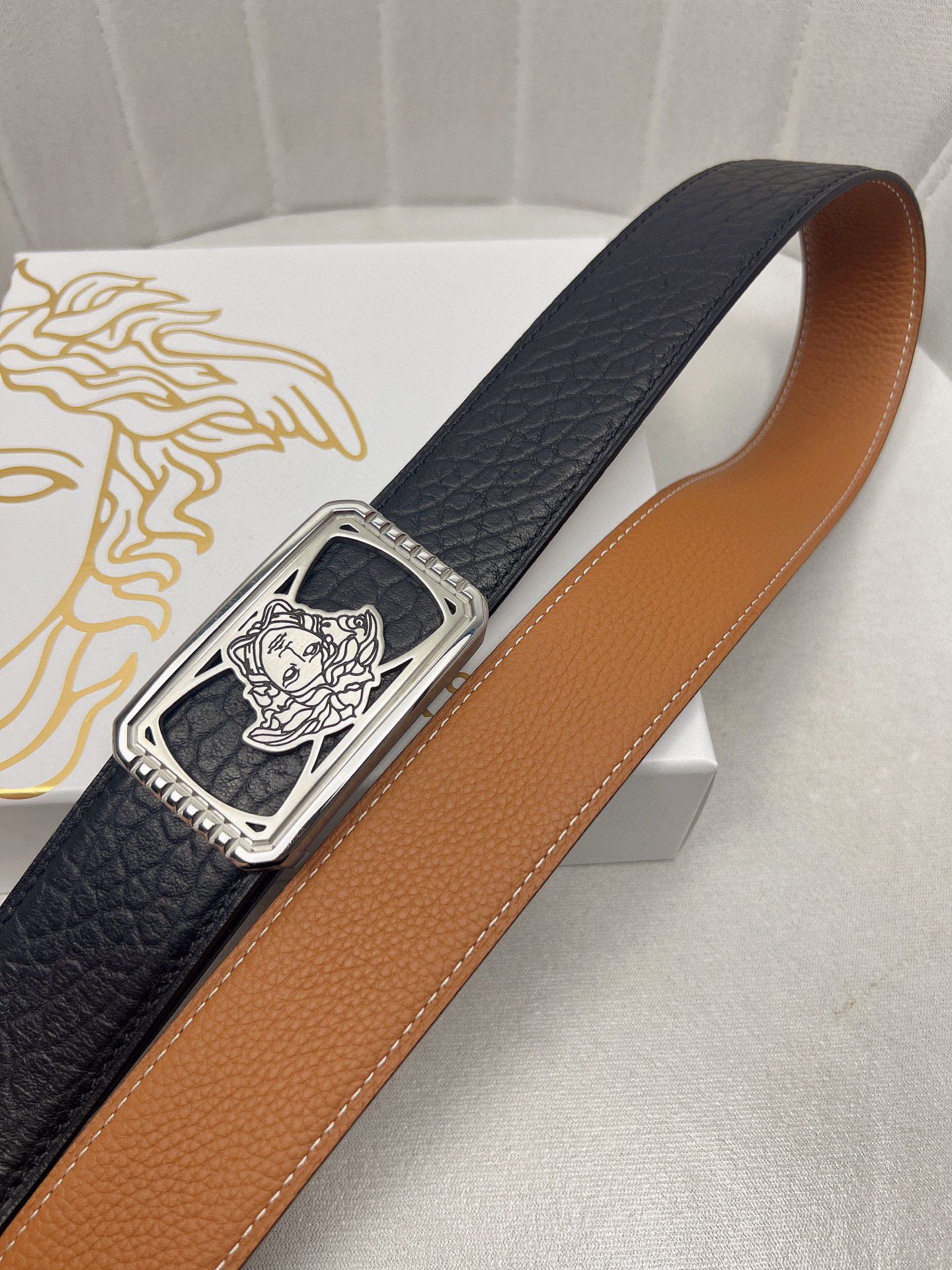 这款皮带是AAAAA 1:1 质量 (非常棒). 使用了和原版一模一样的材料. 商标部分也保持了和范思哲/Versace一样. 图片拍摄是实物皮带拍摄, 您所收到的实物保证和我们图片一模一样.