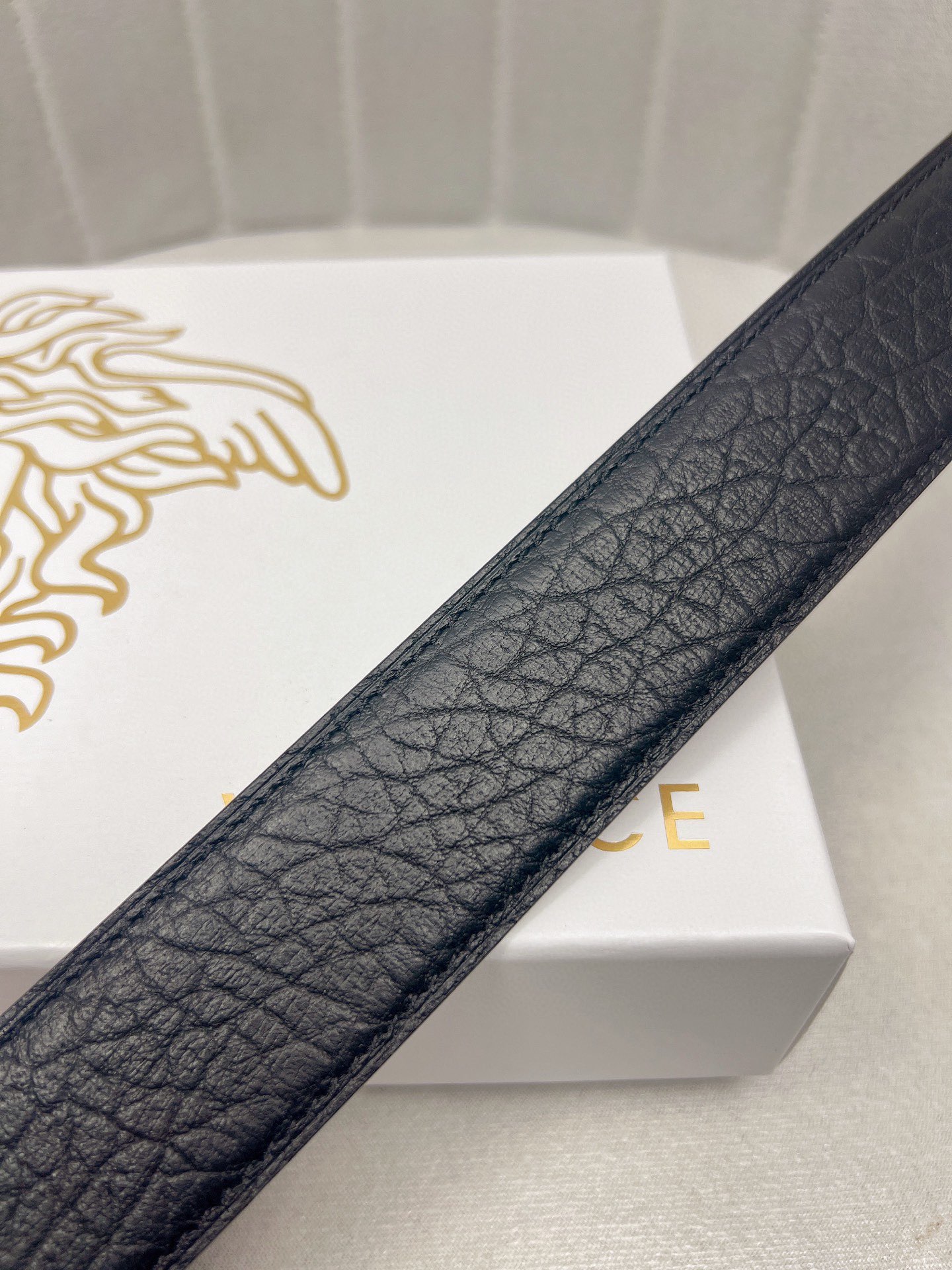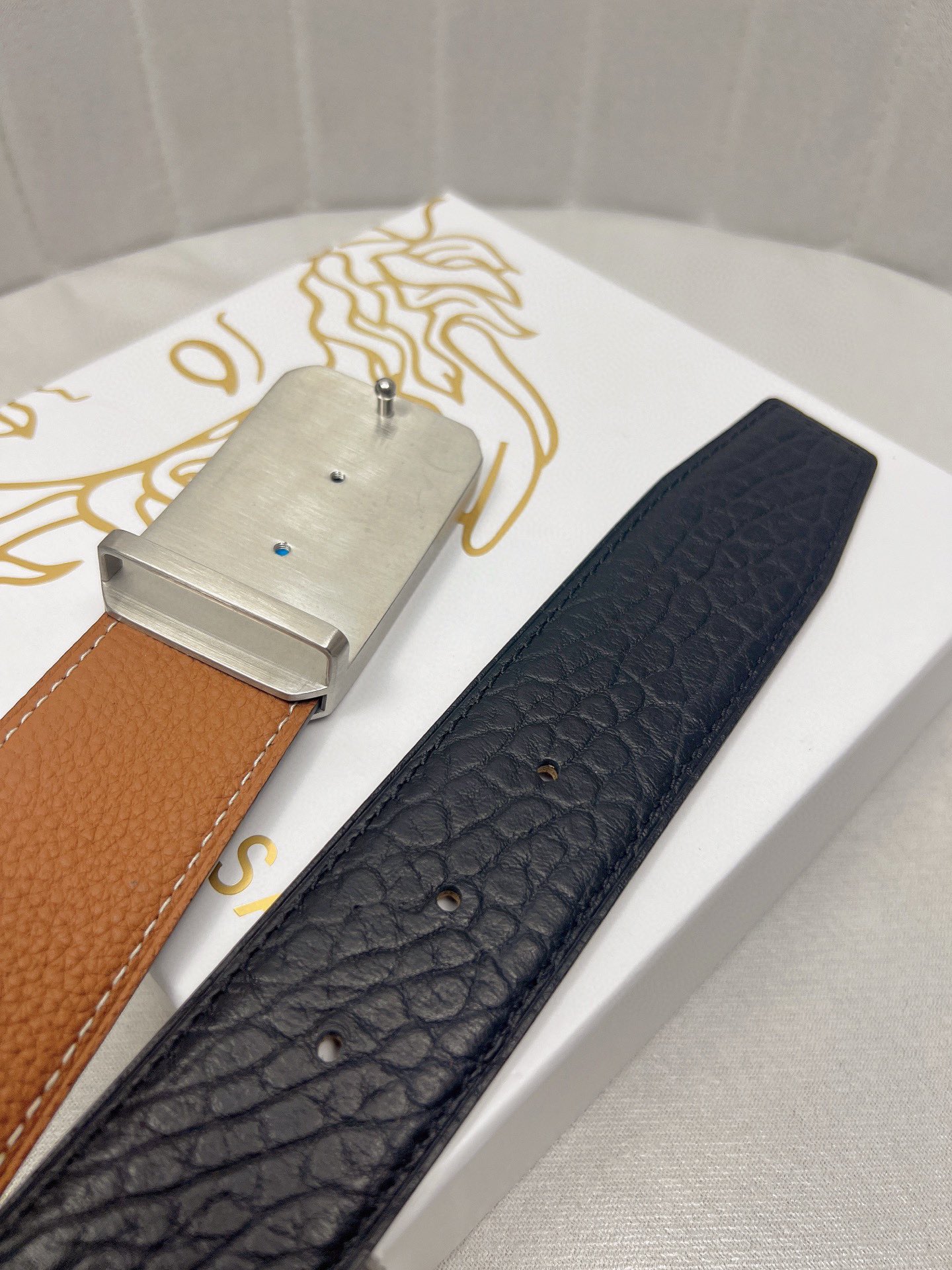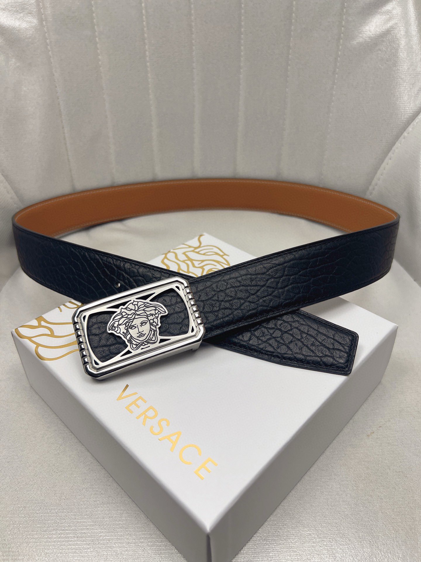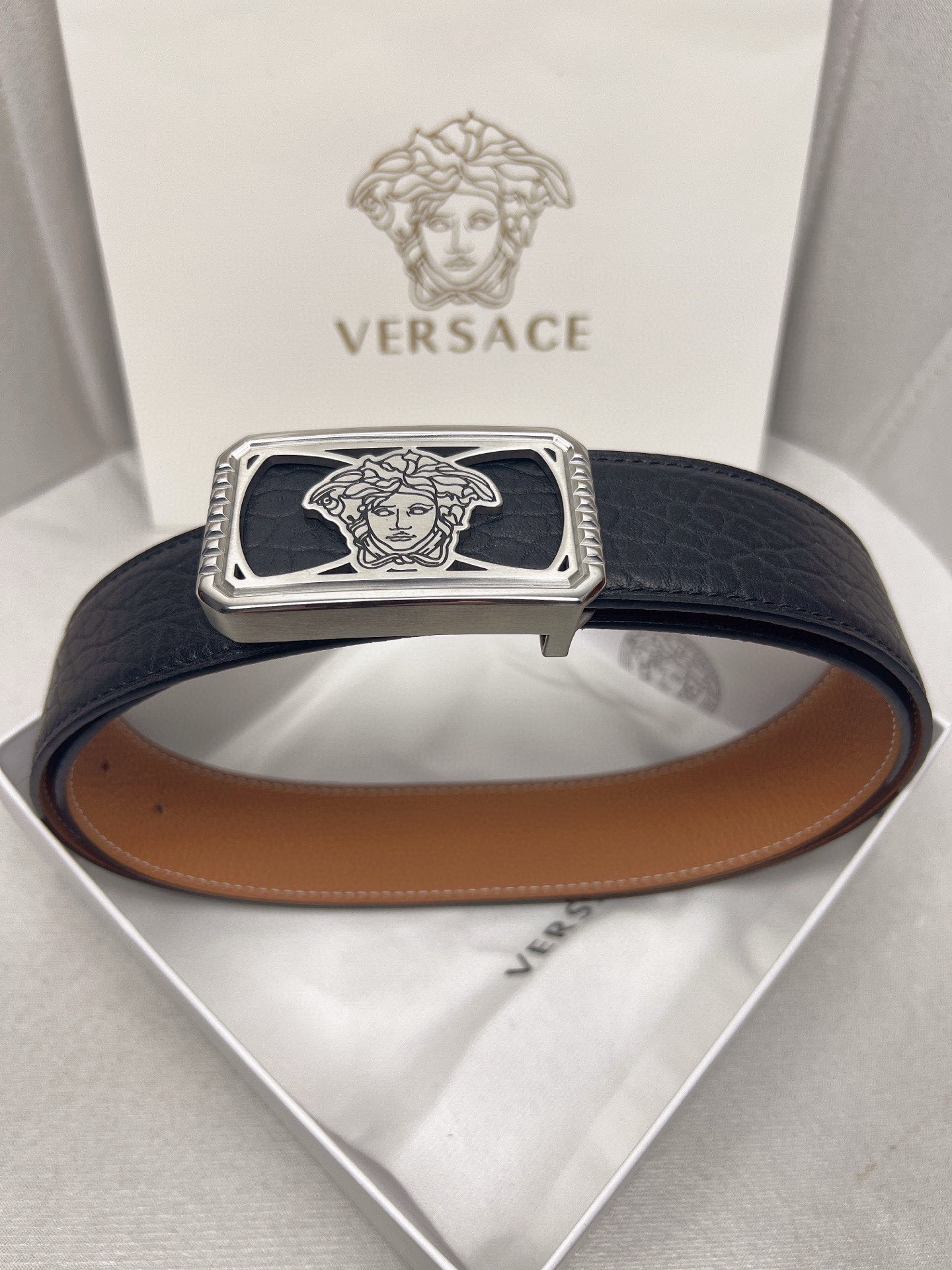 这款皮带是AAAAA 1:1 质量 (非常棒). 使用了和原版一模一样的材料. 商标部分也保持了和范思哲/Versace一样. 图片拍摄是实物皮带拍摄, 您所收到的实物保证和我们图片一模一样.