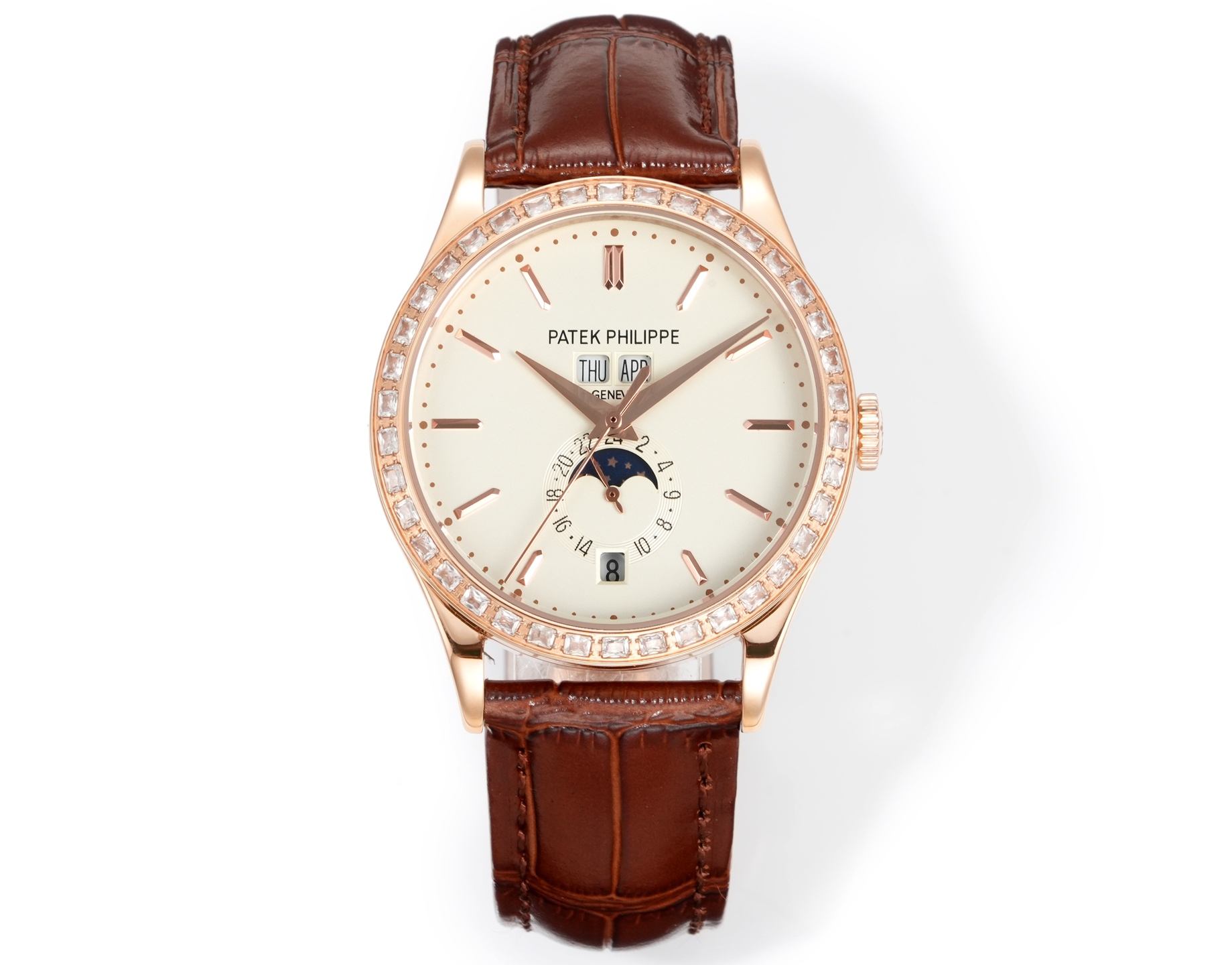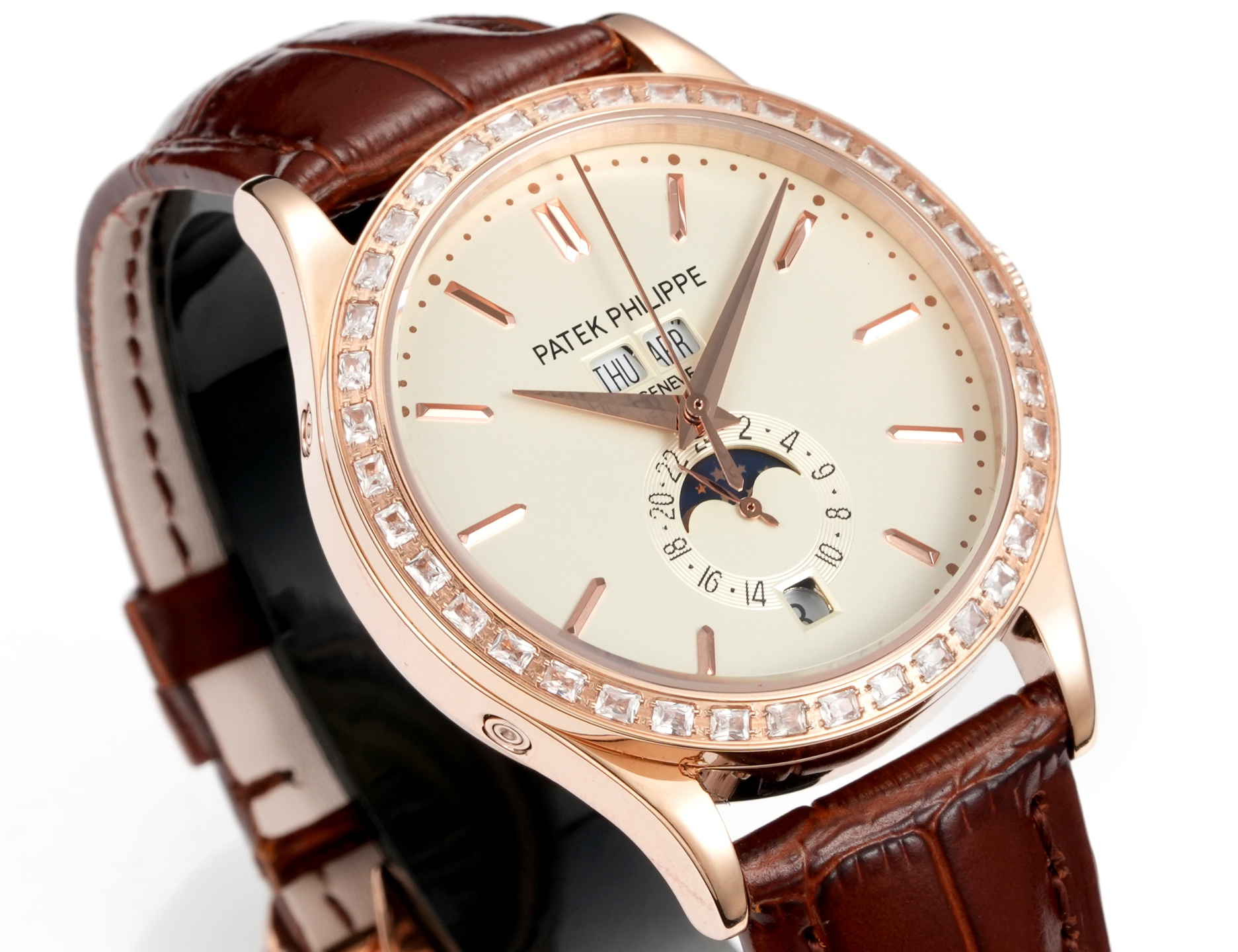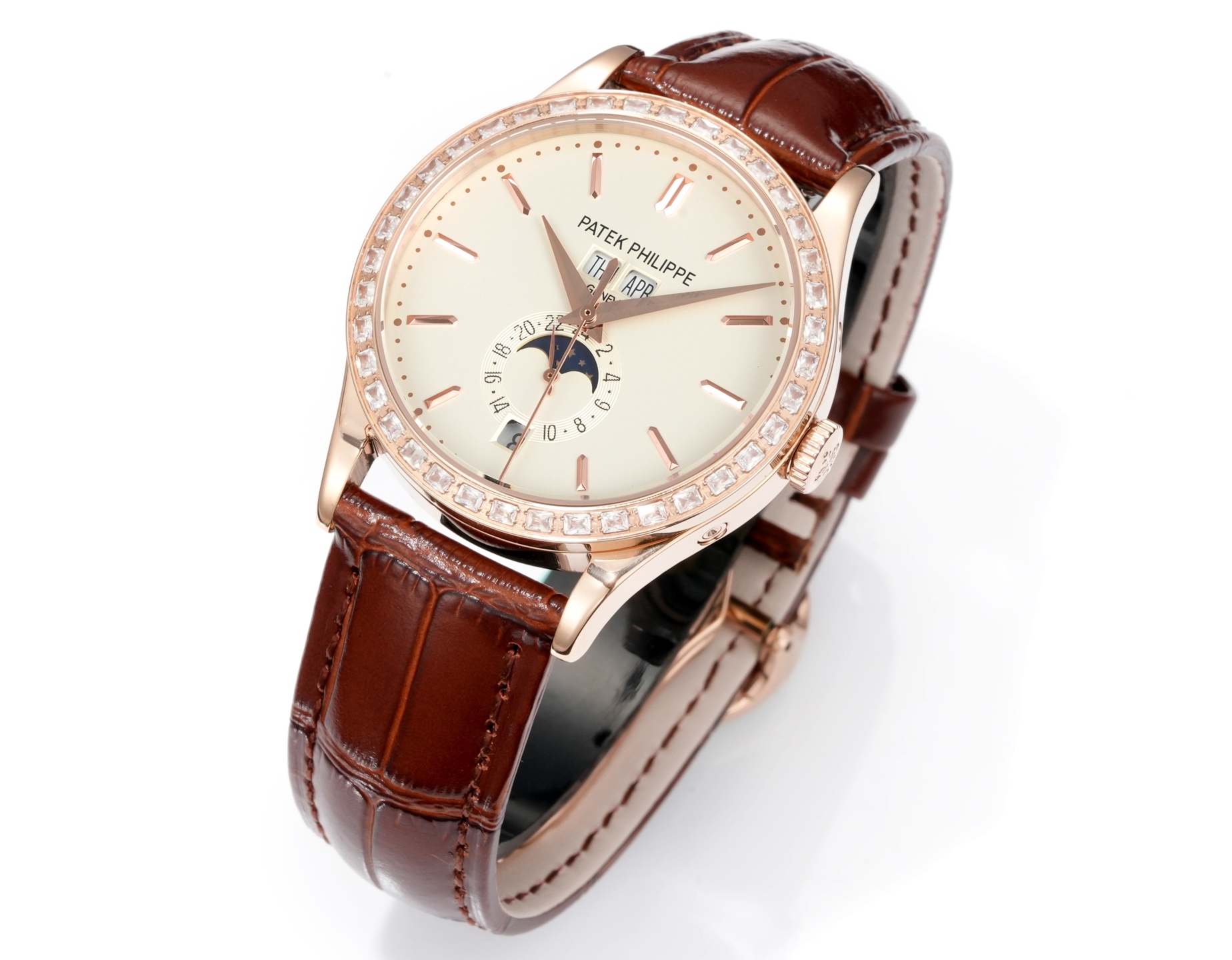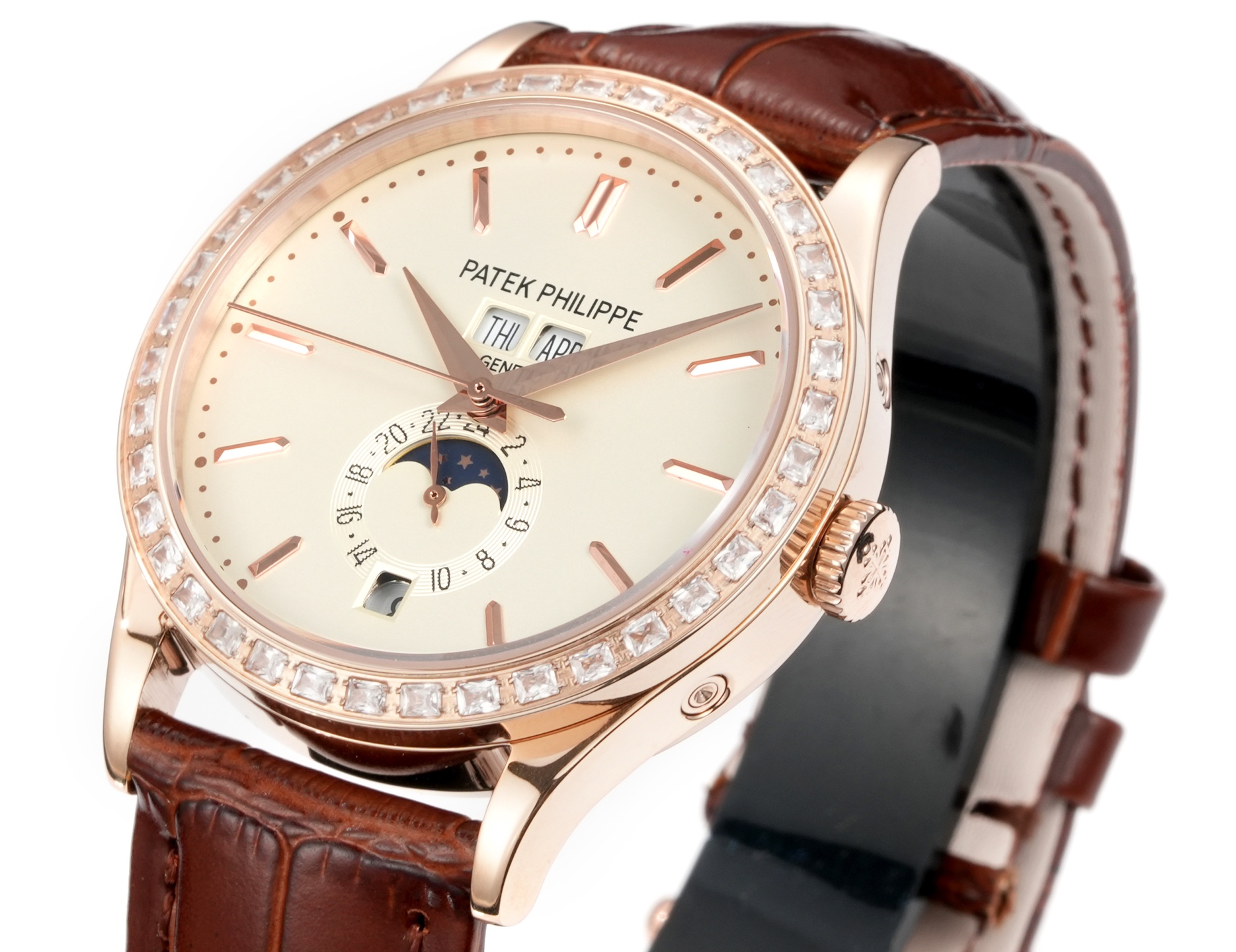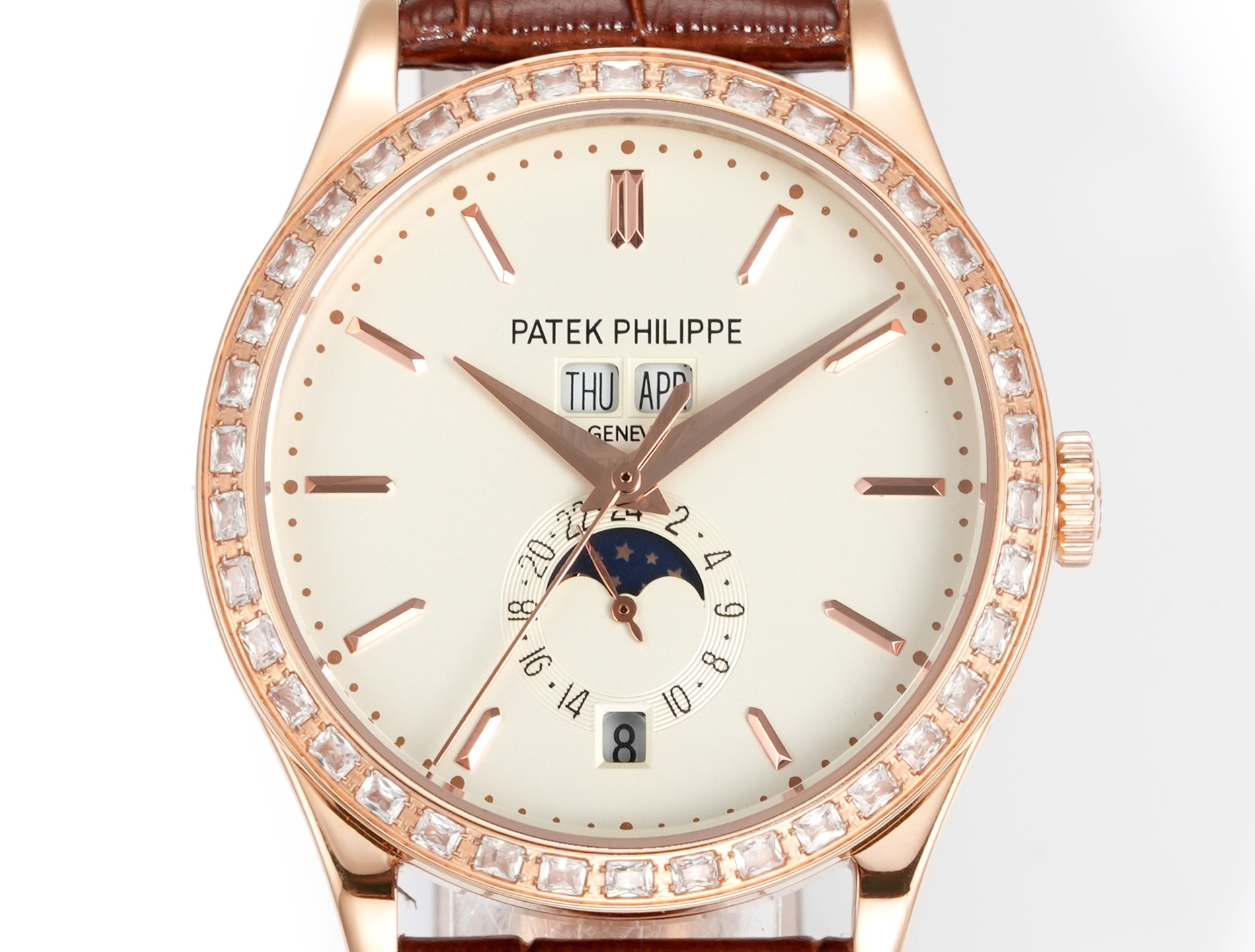 这款手表是AAAAA 1:1 质量 (非常棒). 使用了和原版一模一样的材料. 商标部分也保持了和百达翡丽/Patek Philippe一样. 图片拍摄是实物手表拍摄, 您所收到的实物保证和我们图片一模一样.