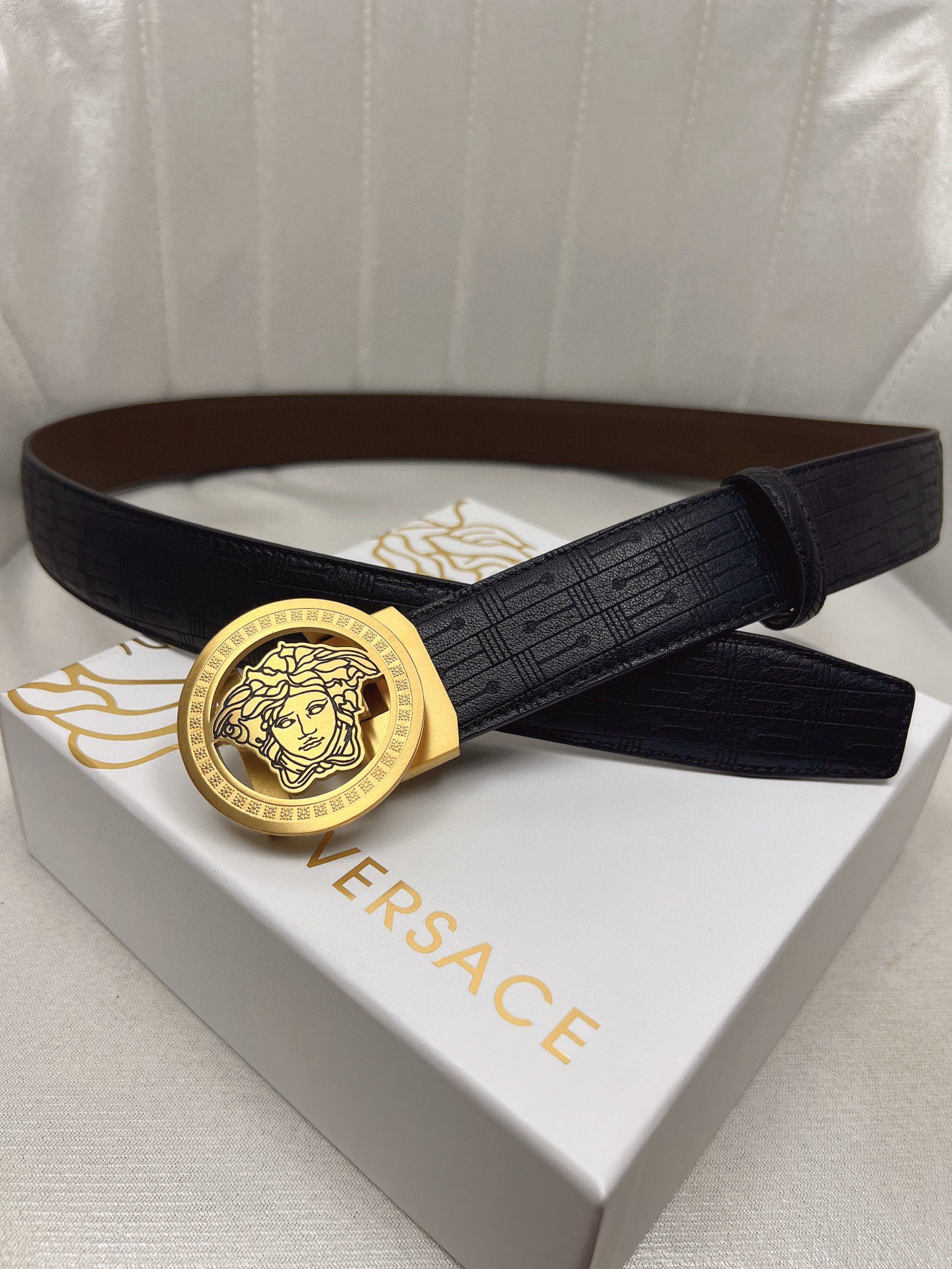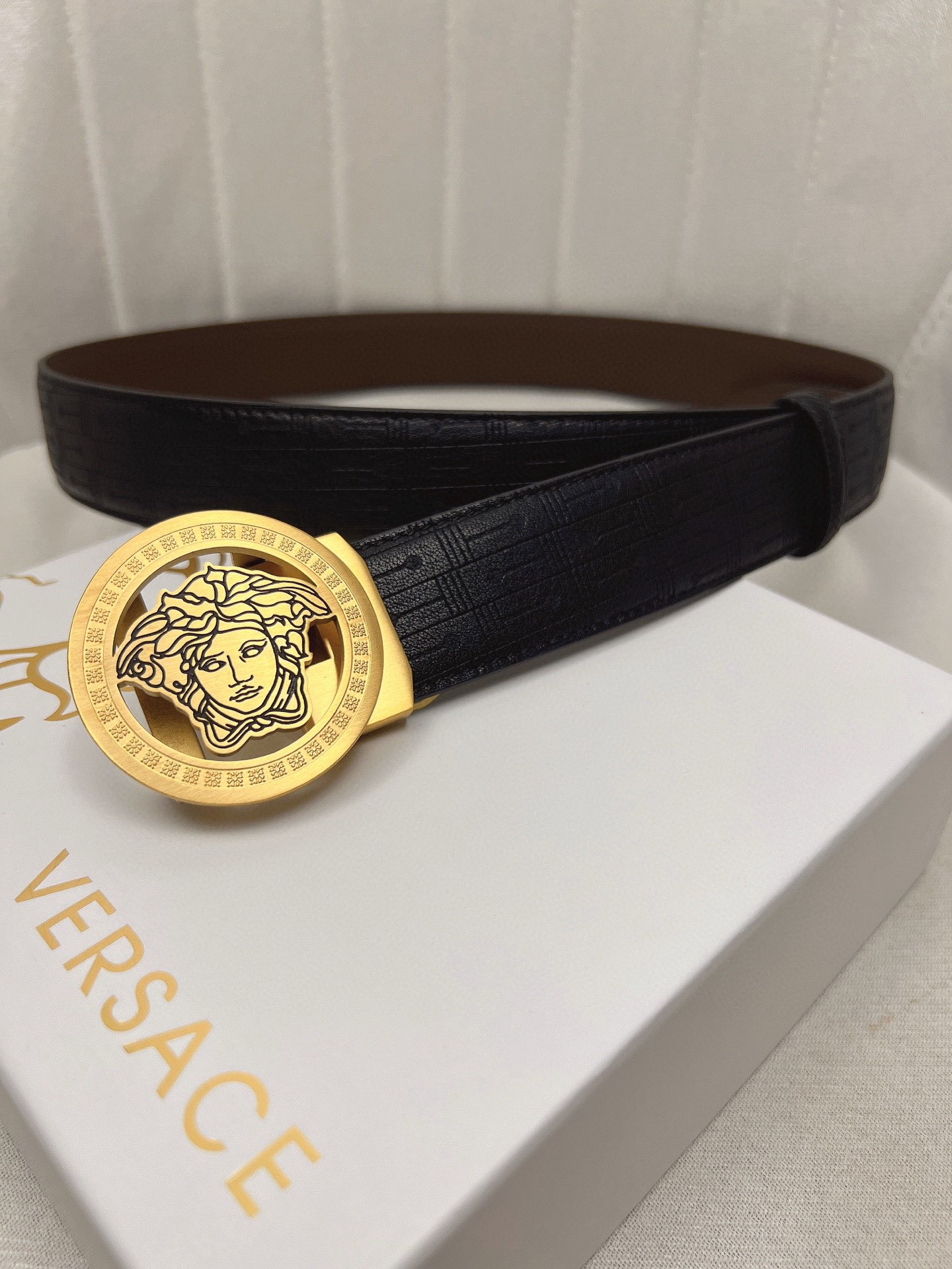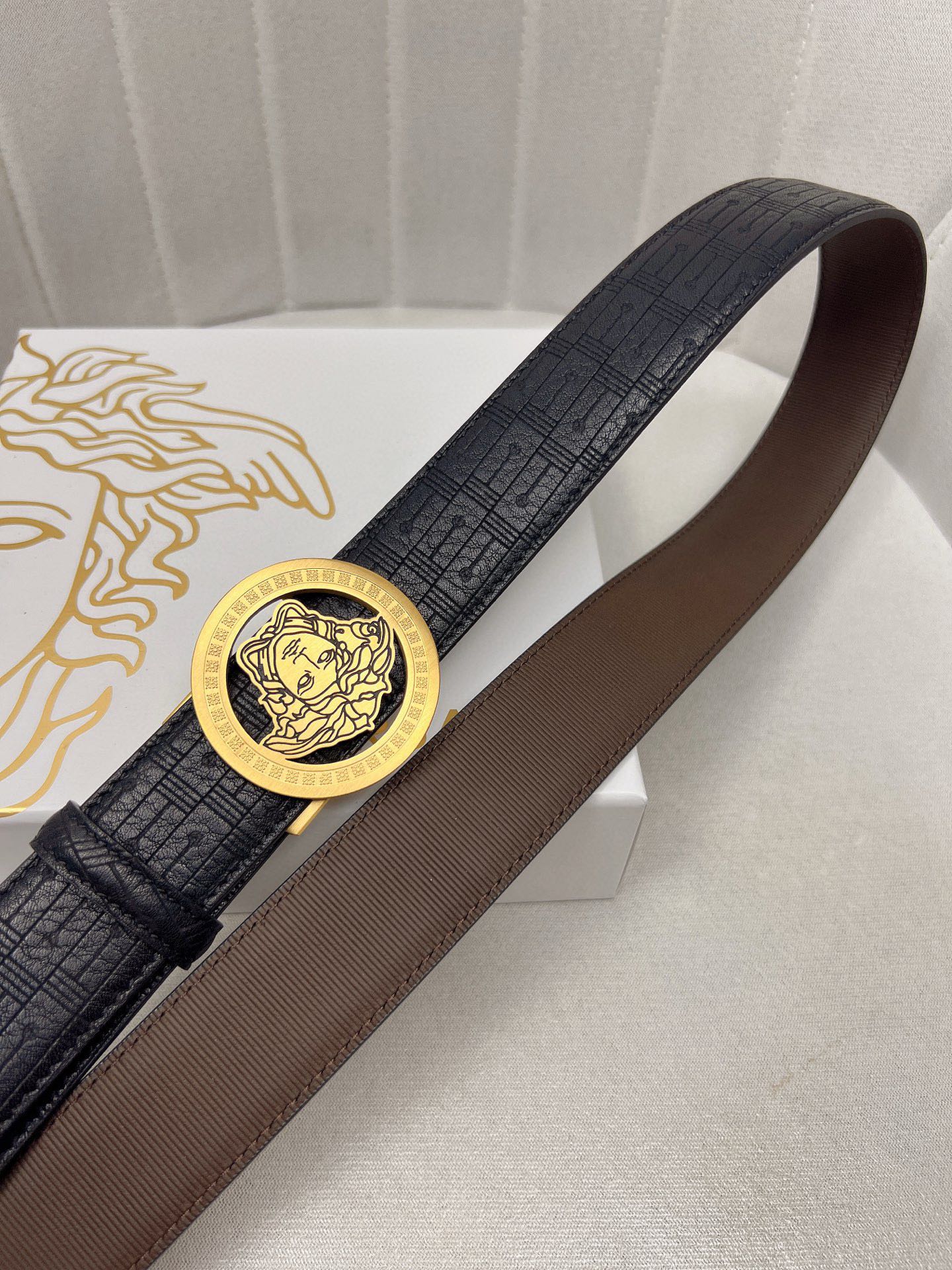 这款皮带是AAAAA 1:1 质量 (非常棒). 使用了和原版一模一样的材料. 商标部分也保持了和范思哲/Versace一样. 图片拍摄是实物皮带拍摄, 您所收到的实物保证和我们图片一模一样.