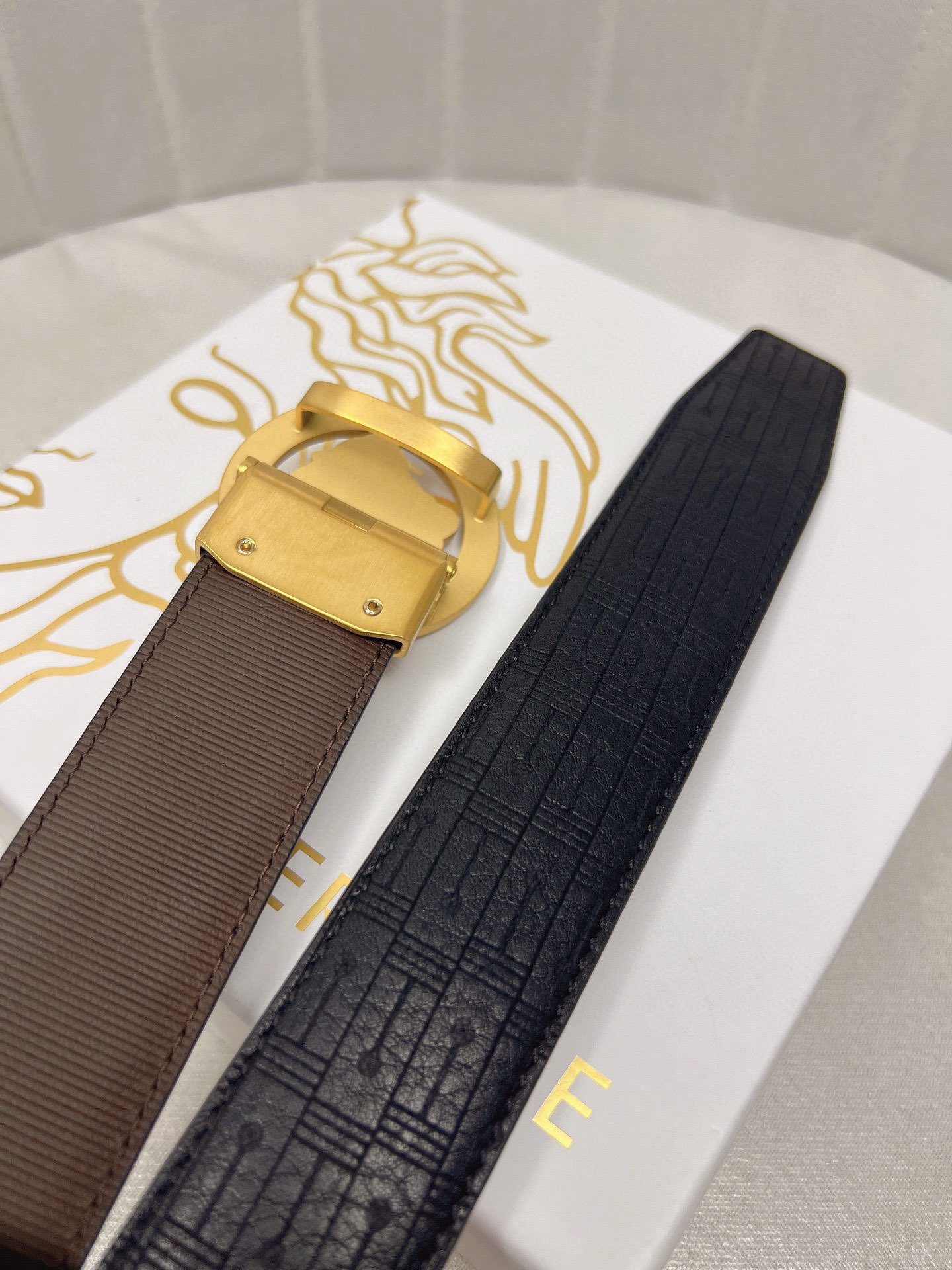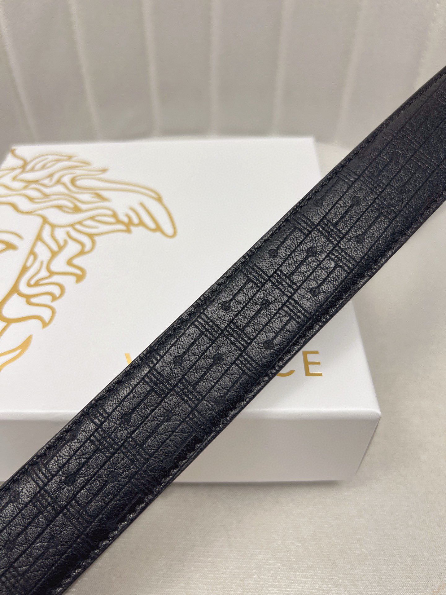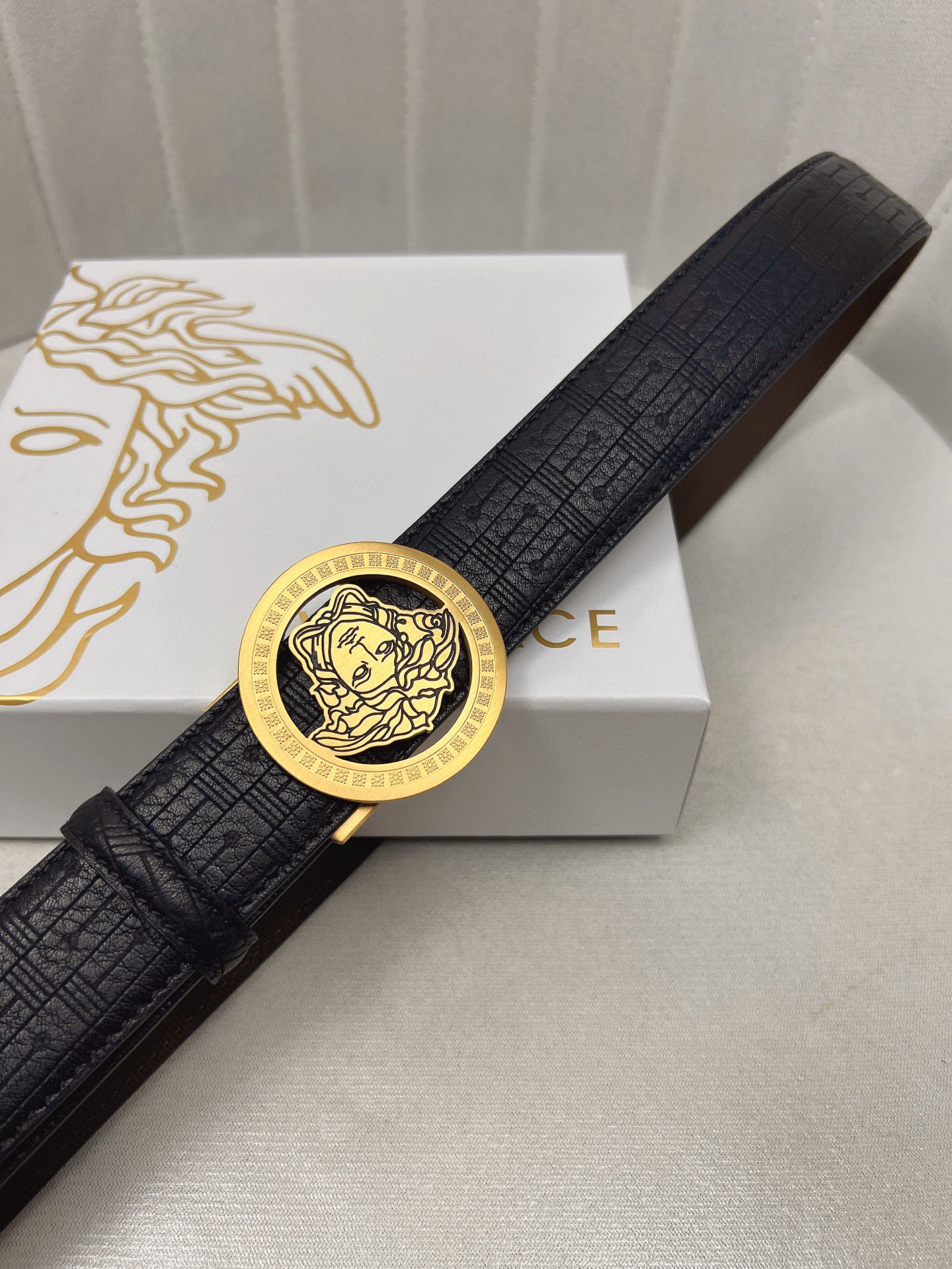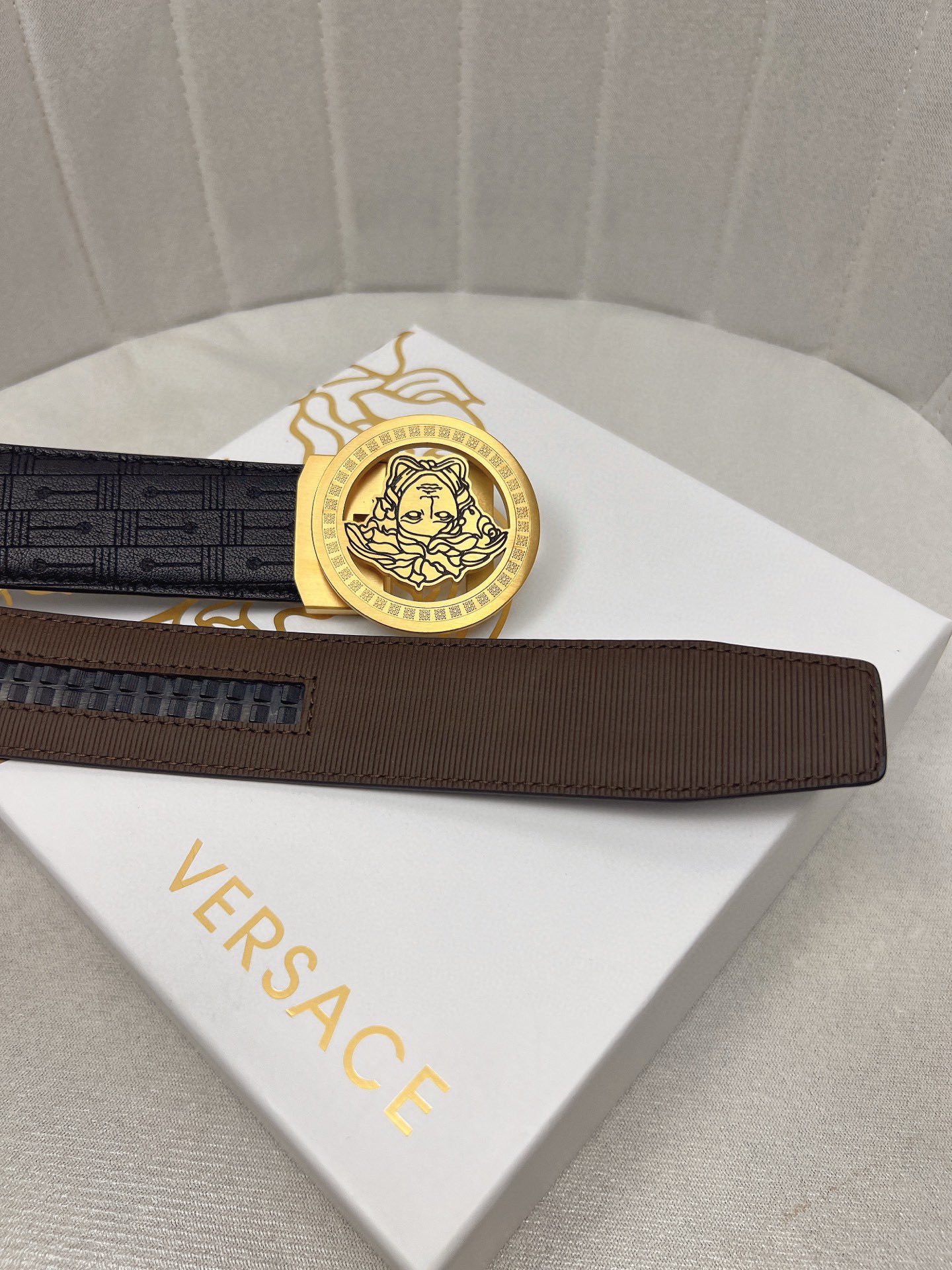 这款皮带是AAAAA 1:1 质量 (非常棒). 使用了和原版一模一样的材料. 商标部分也保持了和范思哲/Versace一样. 图片拍摄是实物皮带拍摄, 您所收到的实物保证和我们图片一模一样.