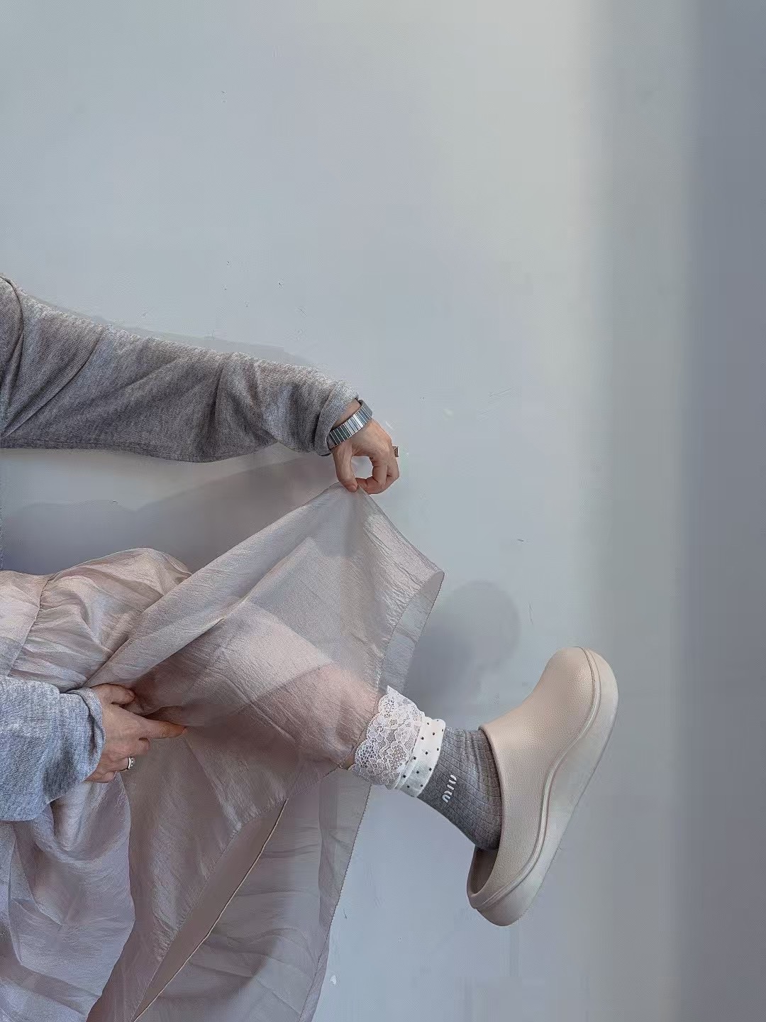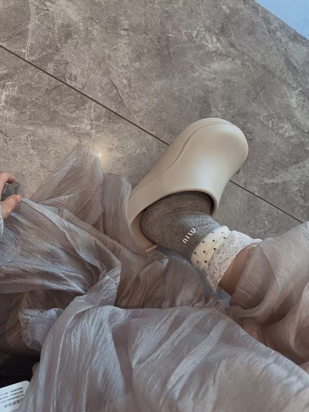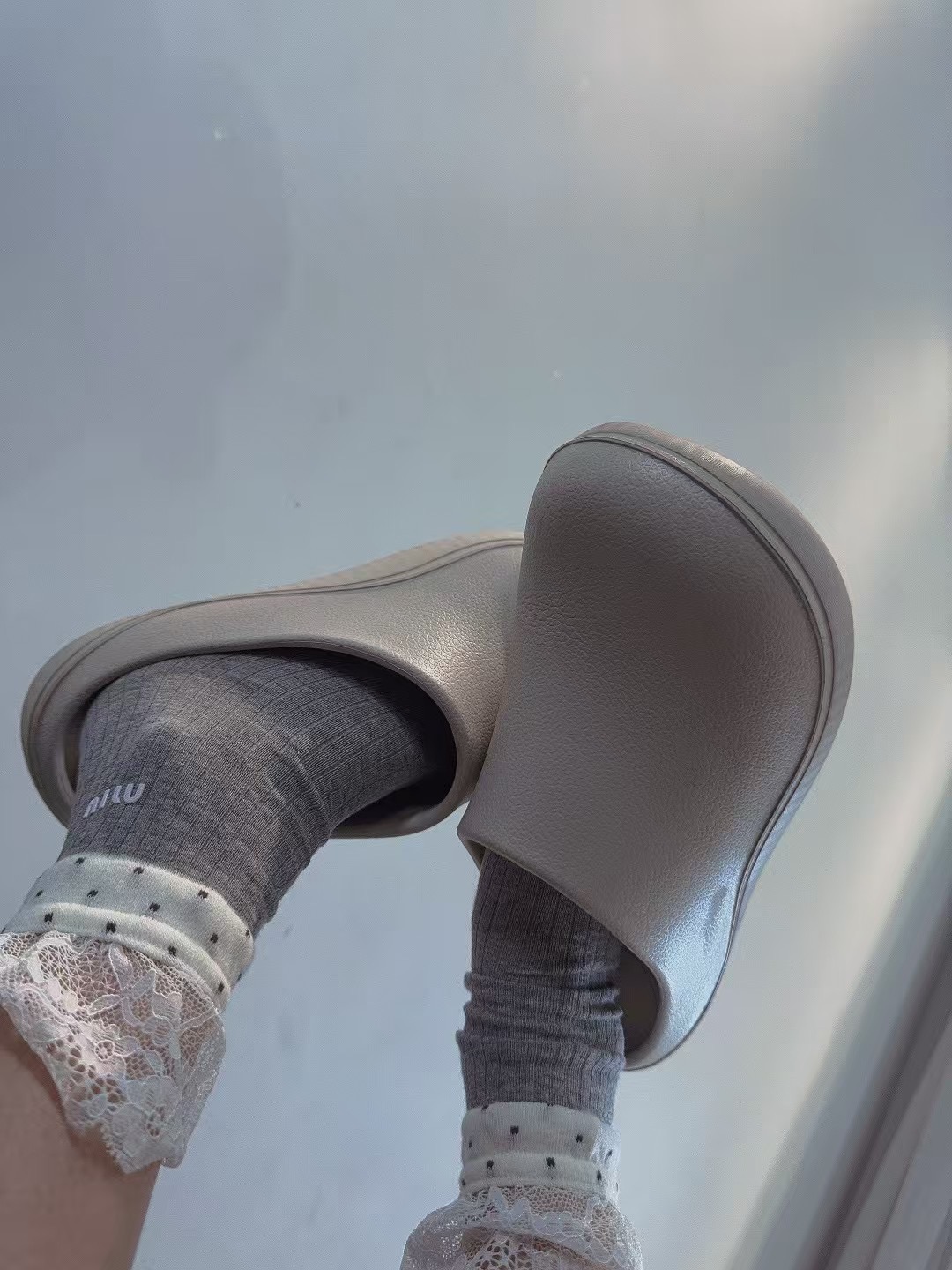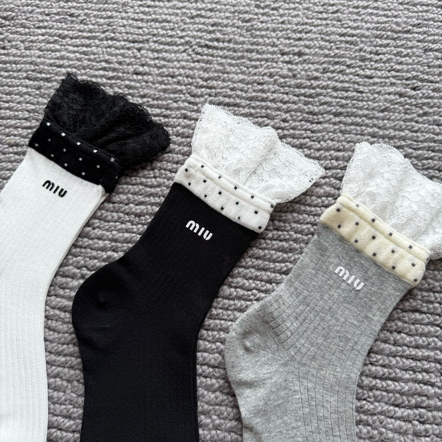 这款sock是AAAAA 1:1 质量 (非常棒). 使用了和原版一模一样的材料. 商标部分也保持了和缪缪/Miu Miu一样. 图片拍摄是实物sock拍摄, 您所收到的实物保证和我们图片一模一样.
