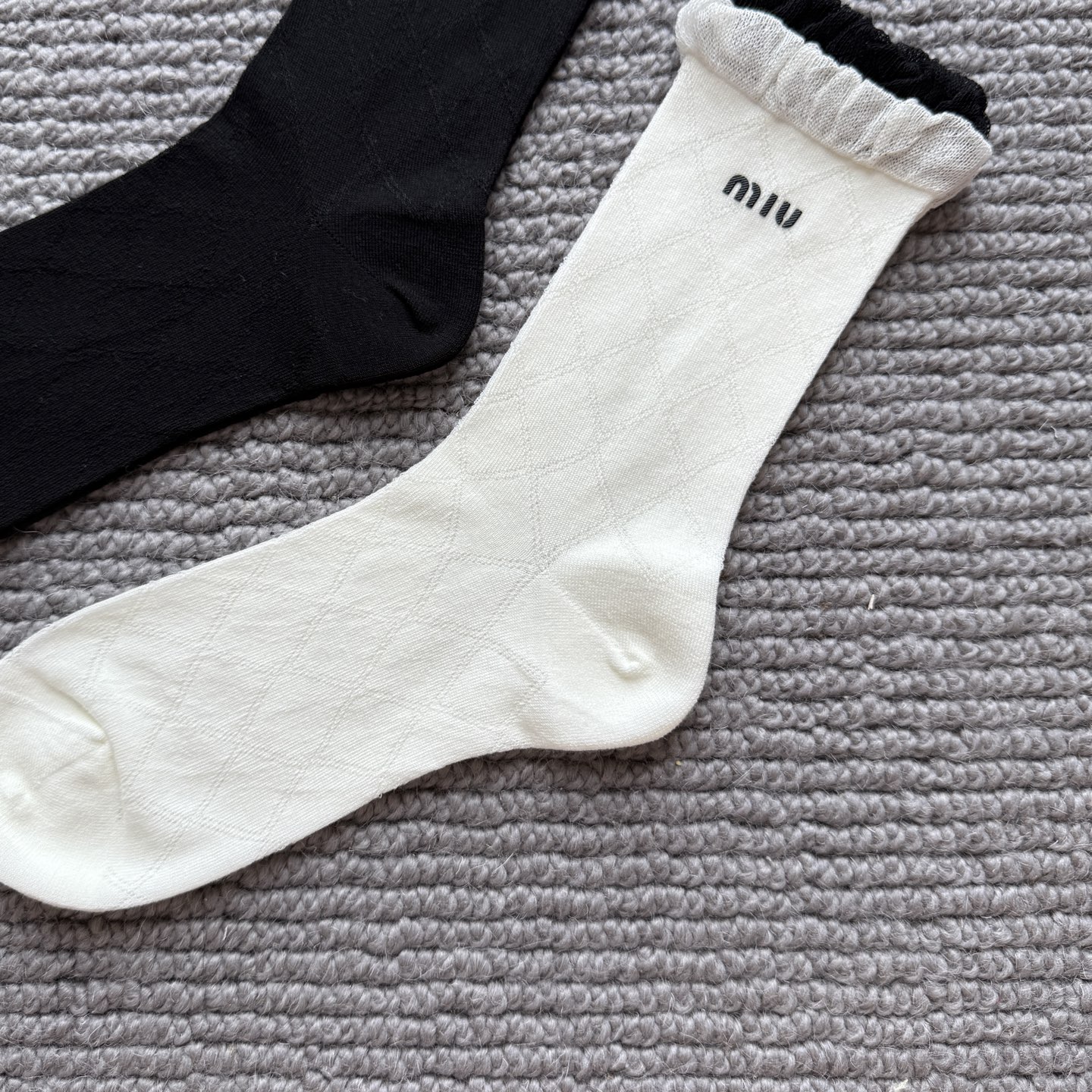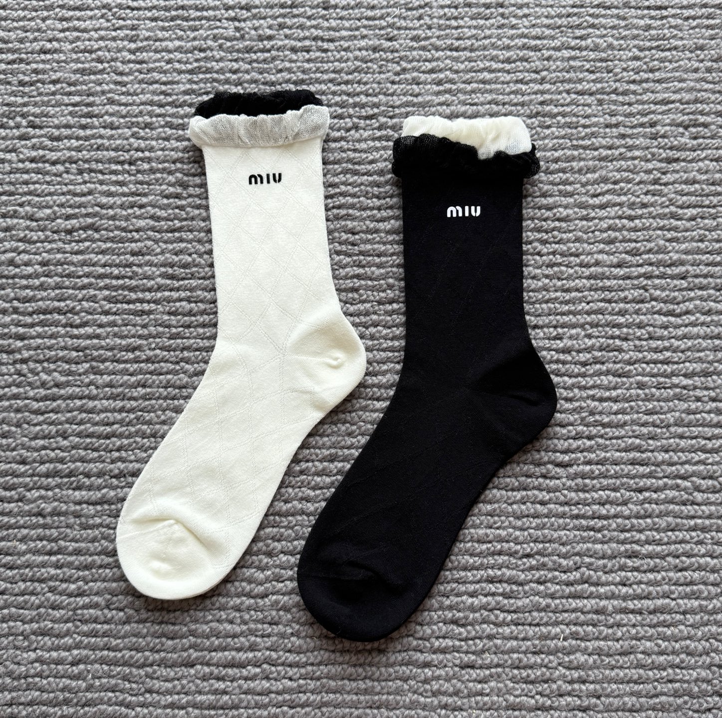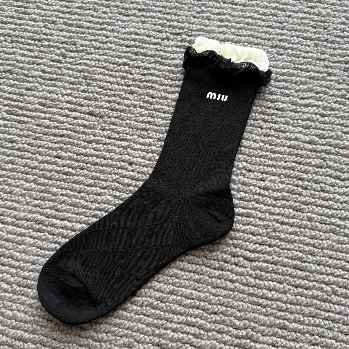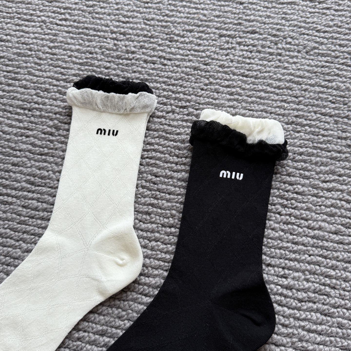 这款sock是AAAAA 1:1 质量 (非常棒). 使用了和原版一模一样的材料. 商标部分也保持了和缪缪/Miu Miu一样. 图片拍摄是实物sock拍摄, 您所收到的实物保证和我们图片一模一样.