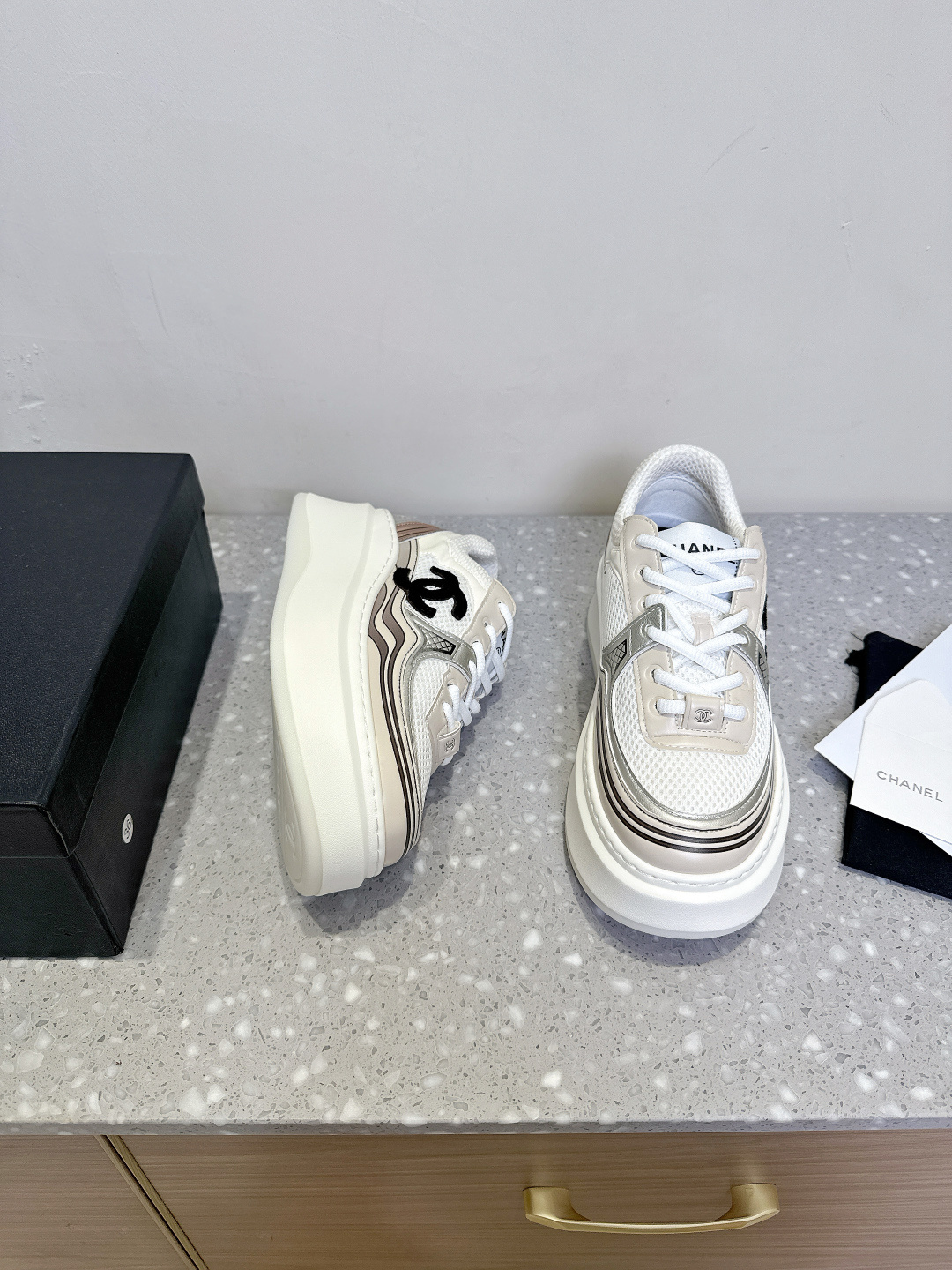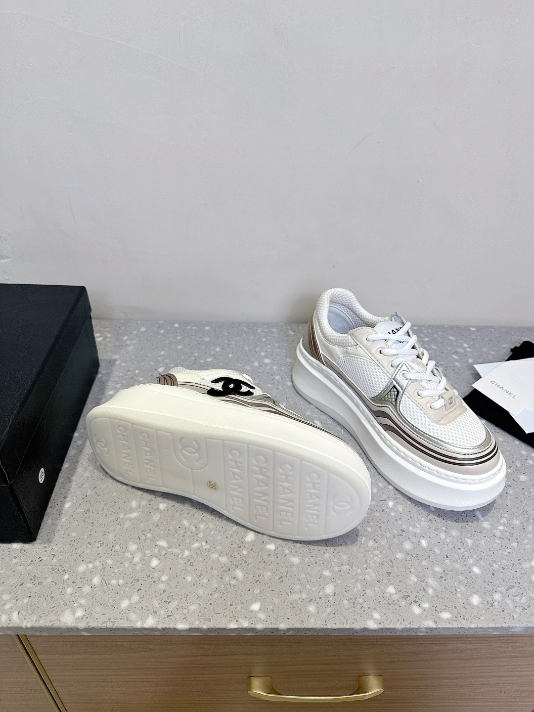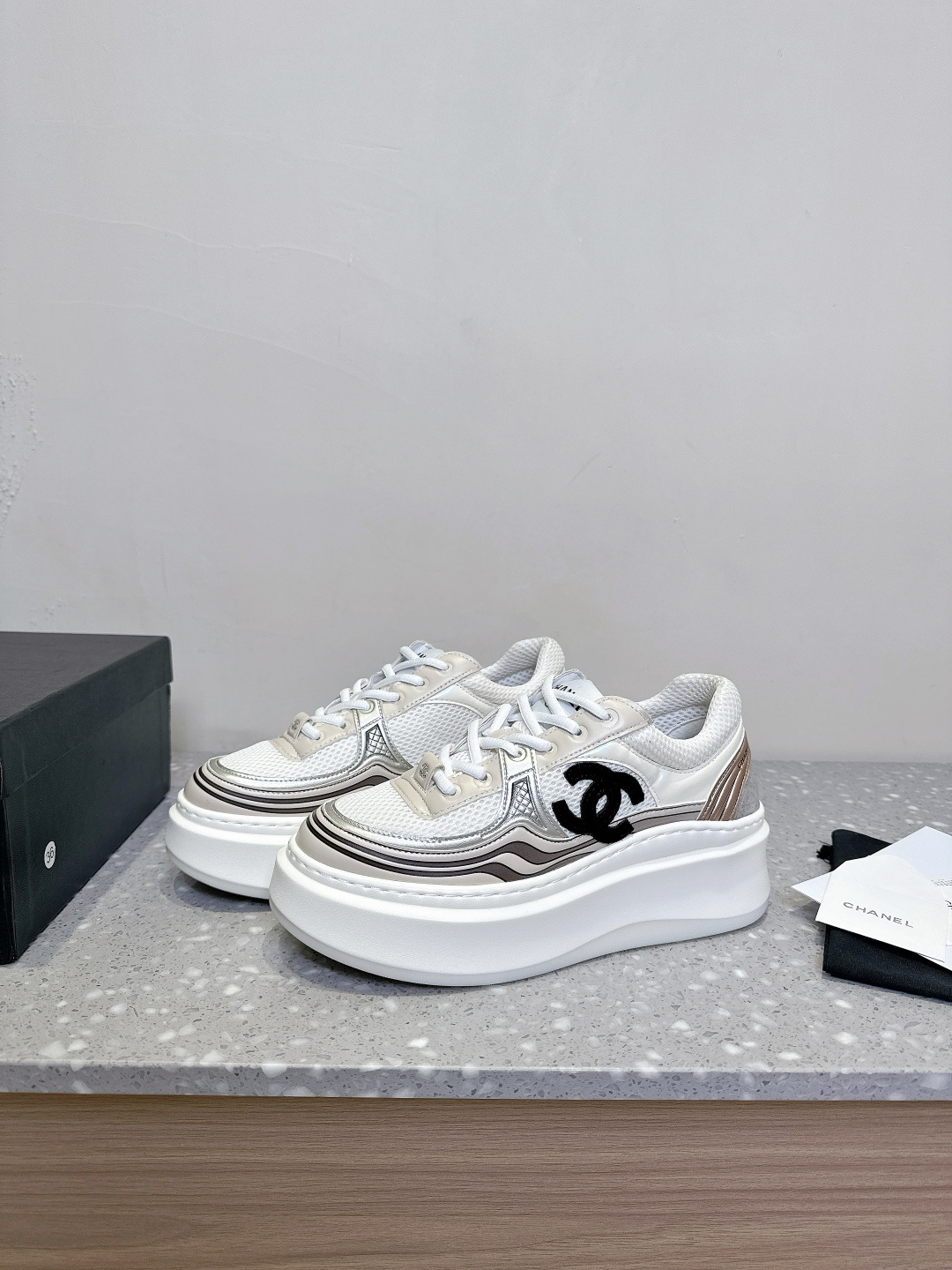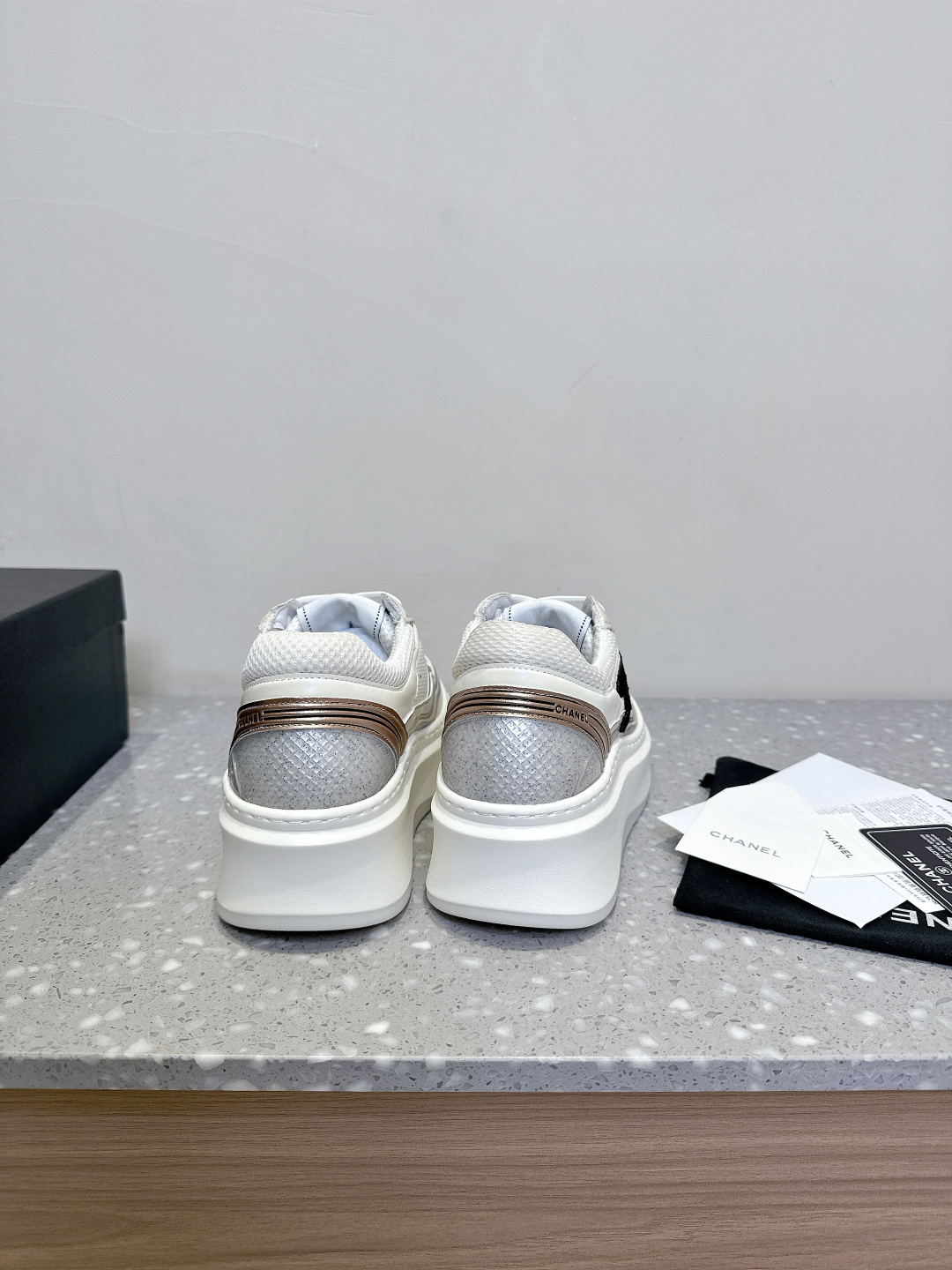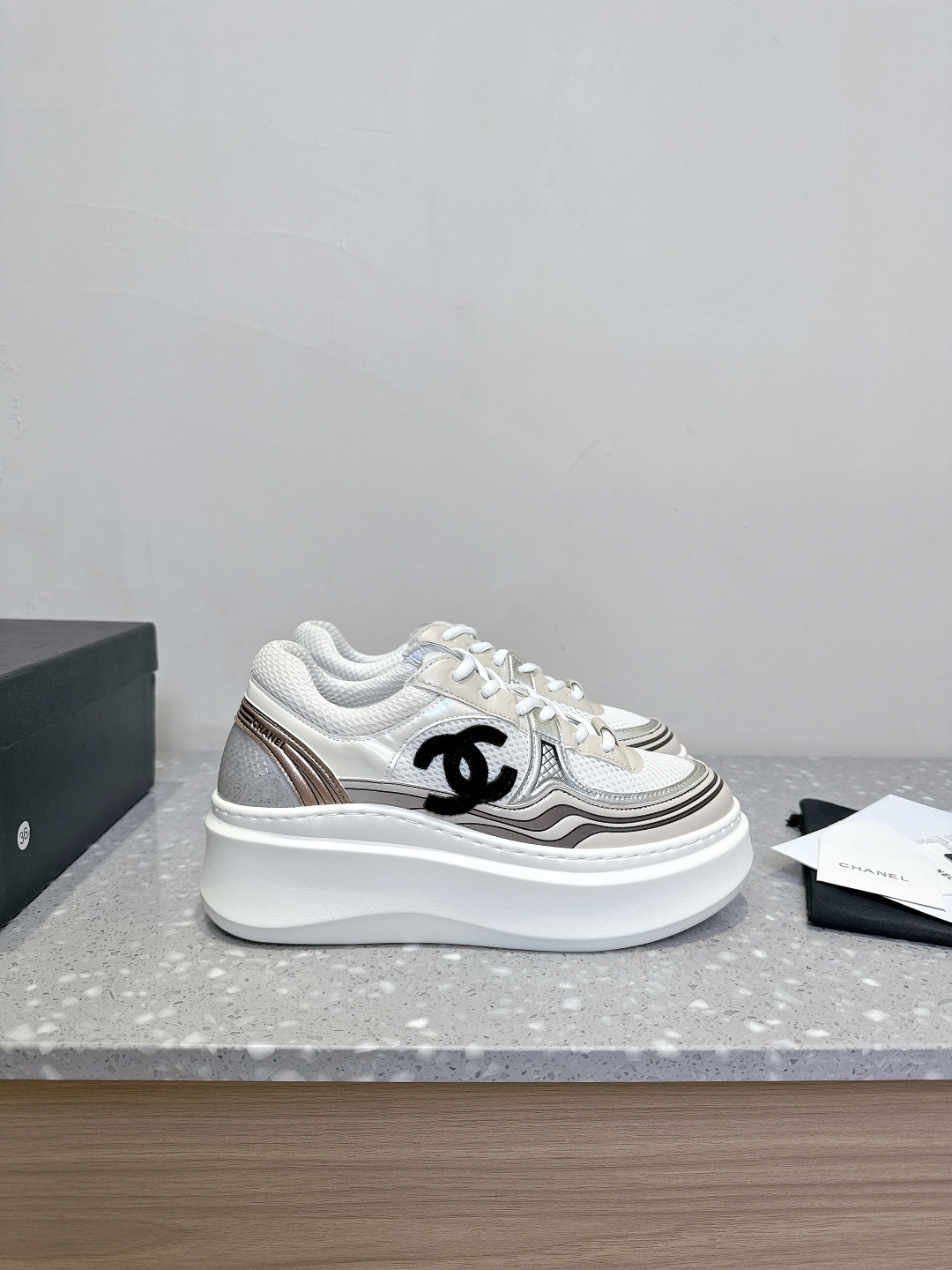这款鞋子是AAAAA 1:1 质量 (非常棒). 使用了和原版一模一样的材料. 商标部分也保持了和香奈儿/Chanel一样. 图片拍摄是实物鞋子拍摄, 您所收到的实物保证和我们图片一模一样.