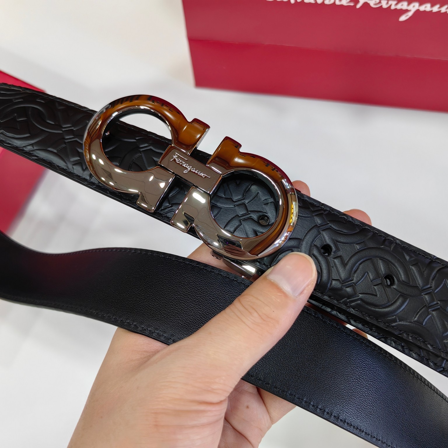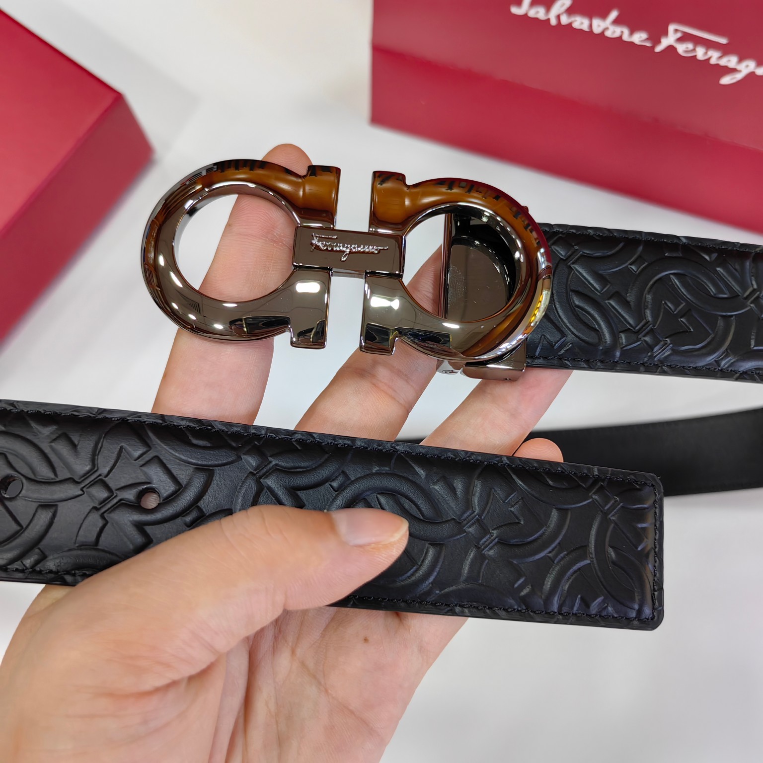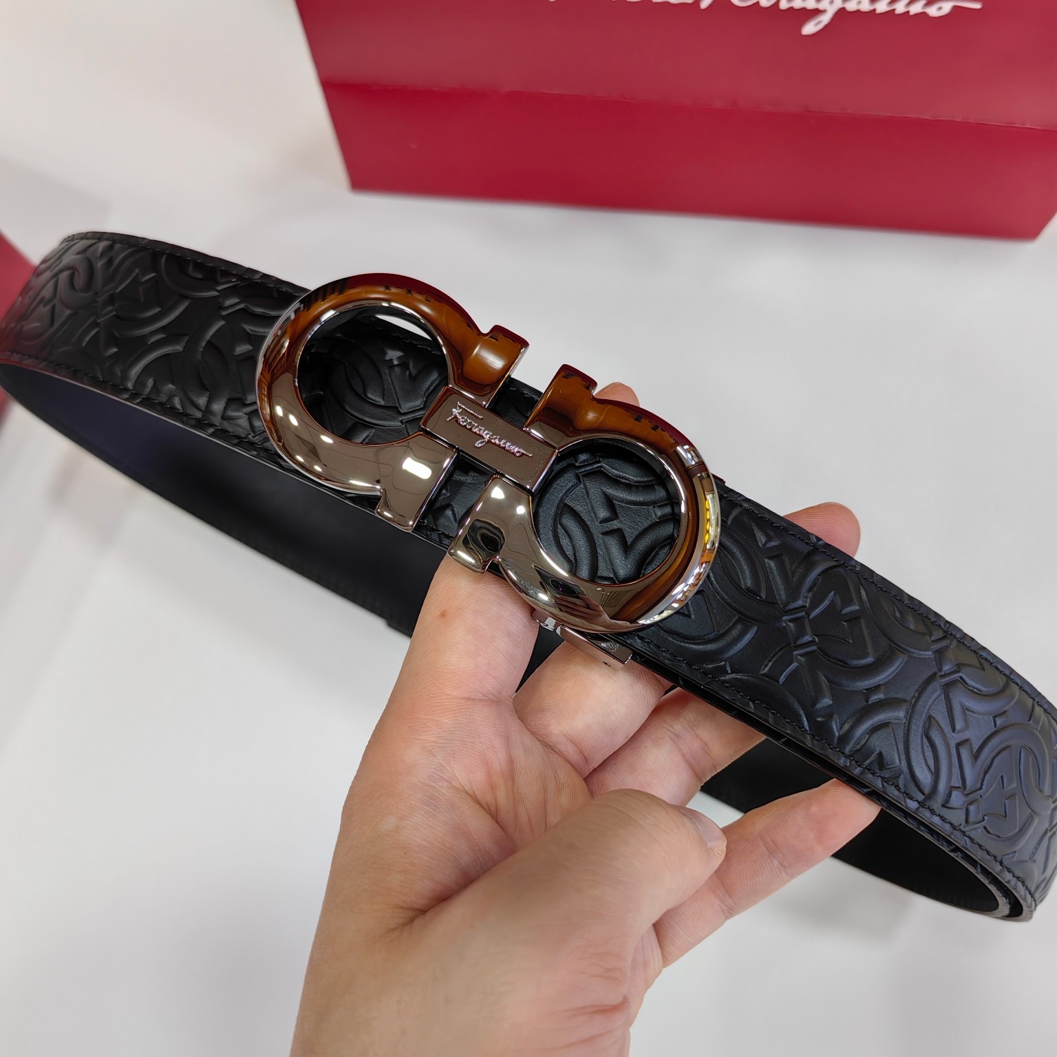 这款皮带是AAAAA 1:1 质量 (非常棒). 使用了和原版一模一样的材料. 商标部分也保持了和菲拉格慕/Salvatore Ferragamo一样. 图片拍摄是实物皮带拍摄, 您所收到的实物保证和我们图片一模一样.