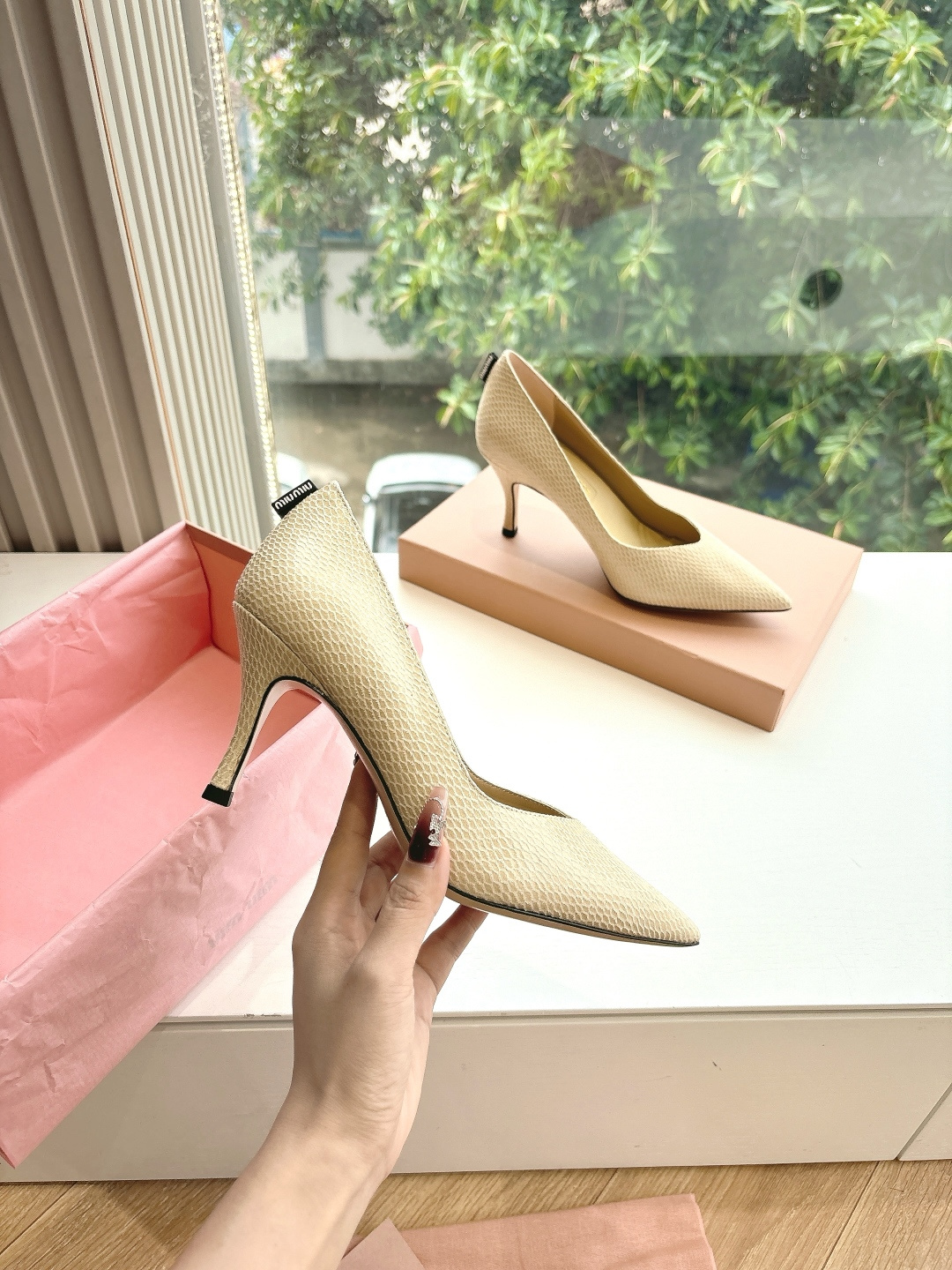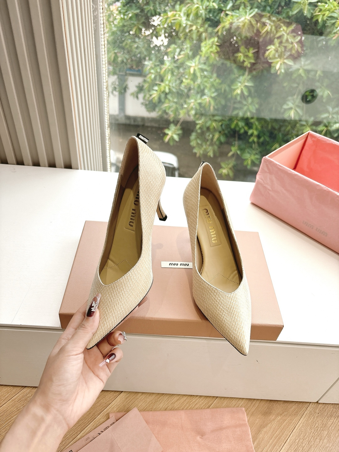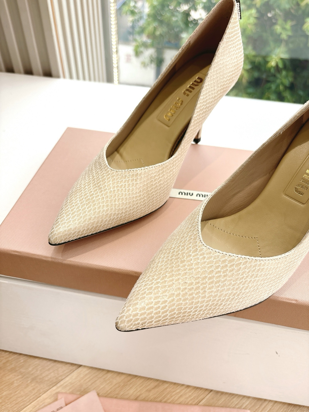 这款鞋子是AAAAA 1:1 质量 (非常棒). 使用了和原版一模一样的材料. 商标部分也保持了和缪缪/Miu Miu一样. 图片拍摄是实物鞋子拍摄, 您所收到的实物保证和我们图片一模一样.