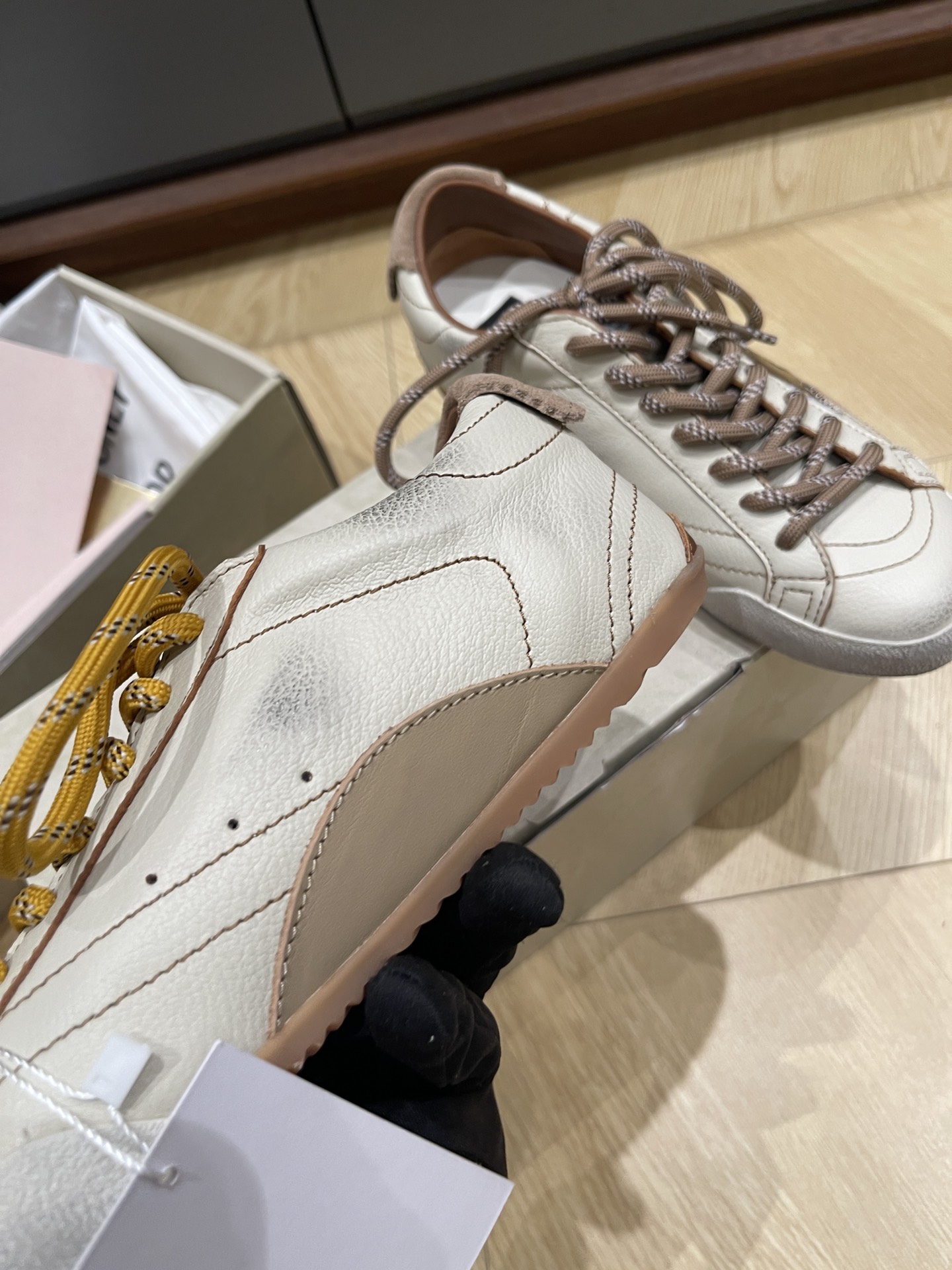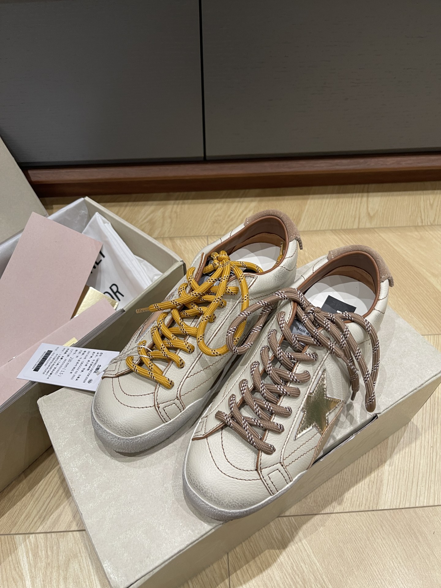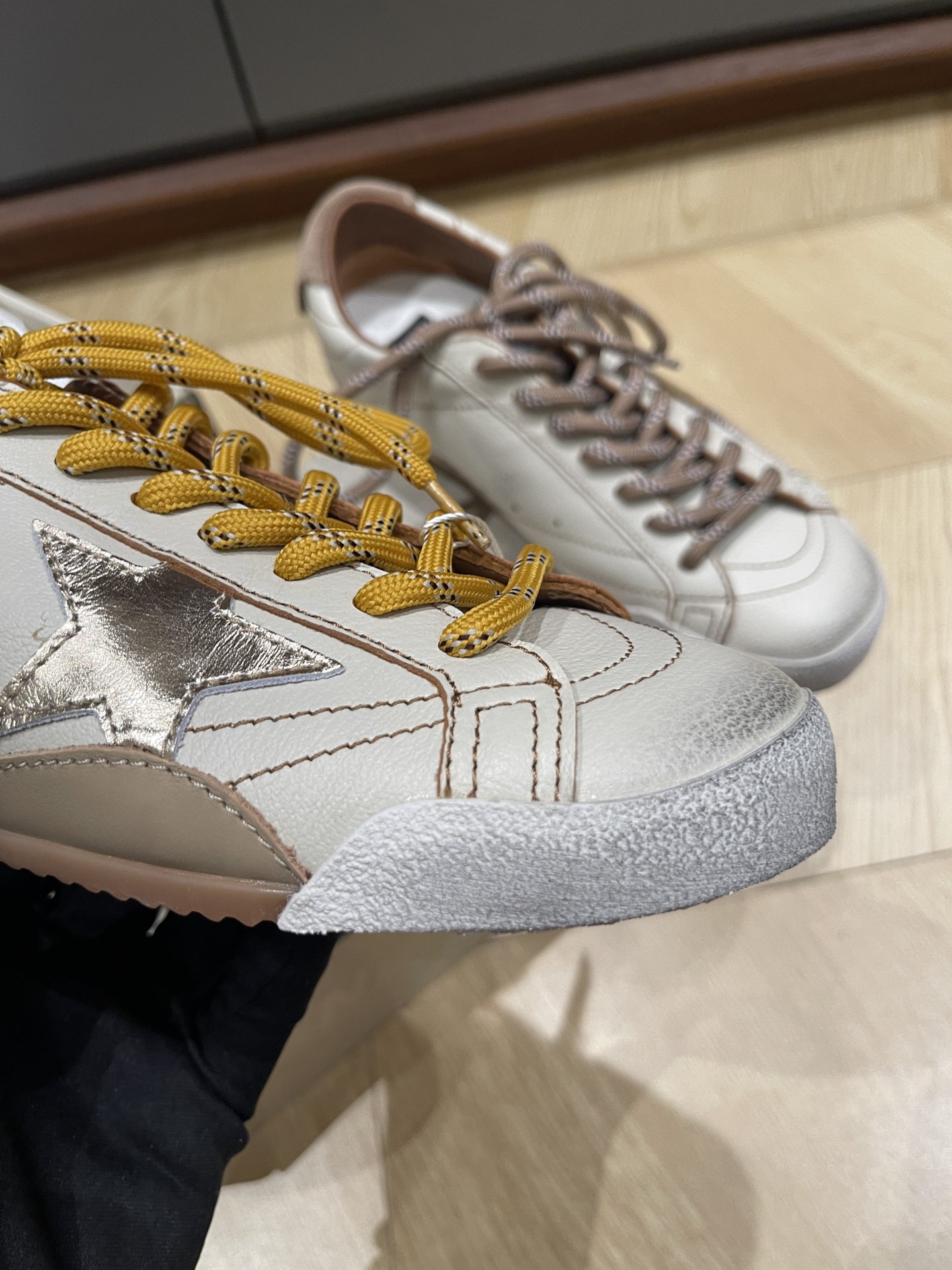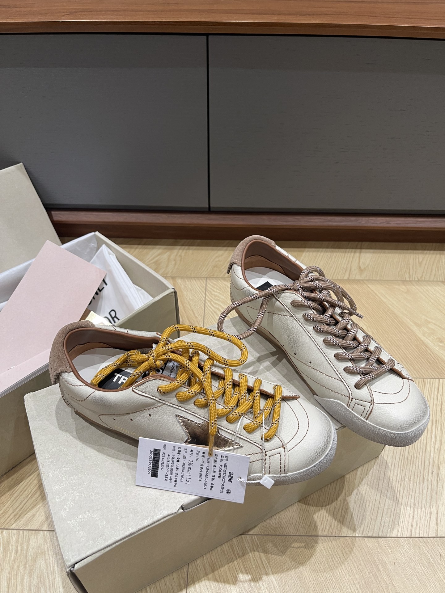 这款鞋子是AAAAA 1:1 质量 (非常棒). 使用了和原版一模一样的材料. 商标部分也保持了和Golden Goose一样. 图片拍摄是实物鞋子拍摄, 您所收到的实物保证和我们图片一模一样.