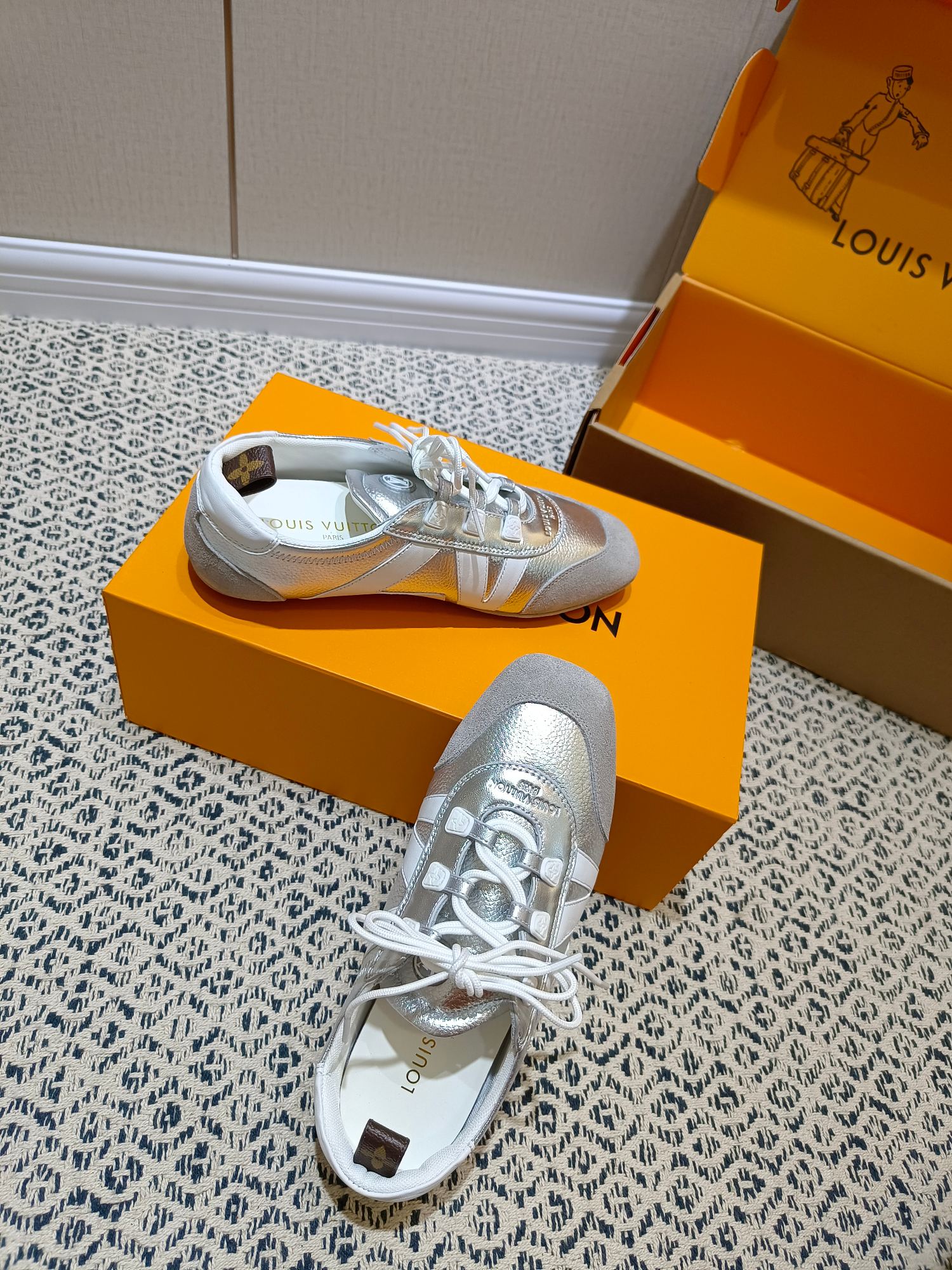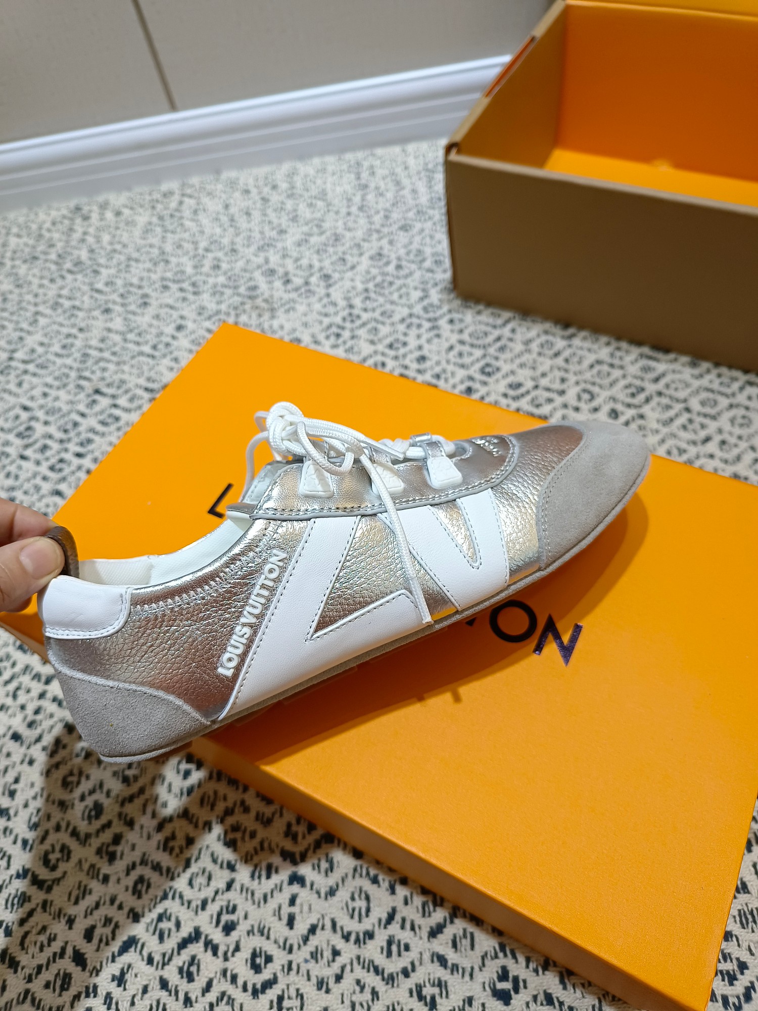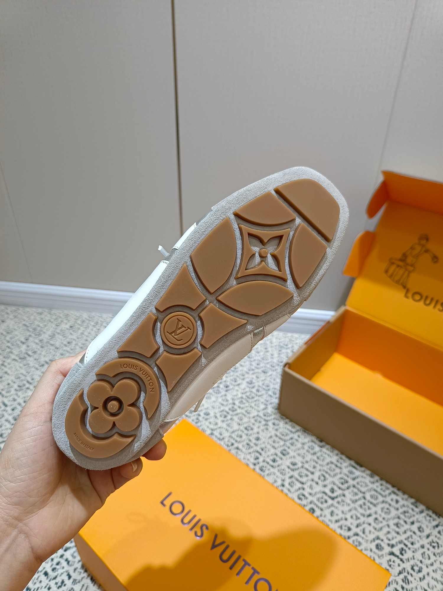 这款鞋子是AAAAA 1:1 质量 (非常棒). 使用了和原版一模一样的材料. 商标部分也保持了和路易威登/Louis Vuitton一样. 图片拍摄是实物鞋子拍摄, 您所收到的实物保证和我们图片一模一样.