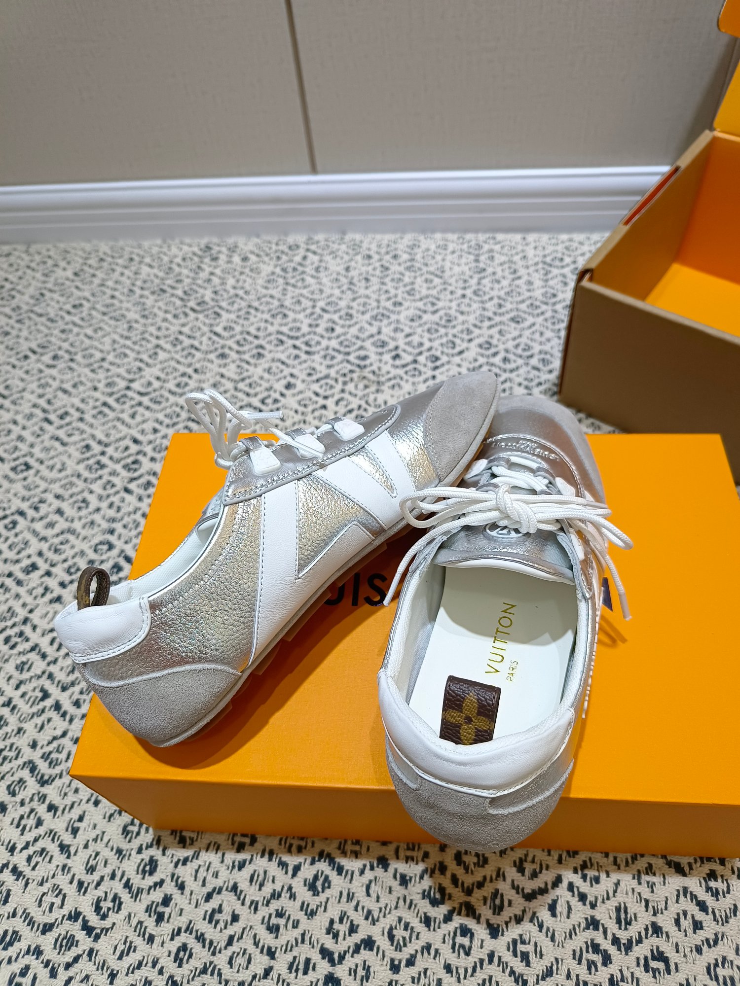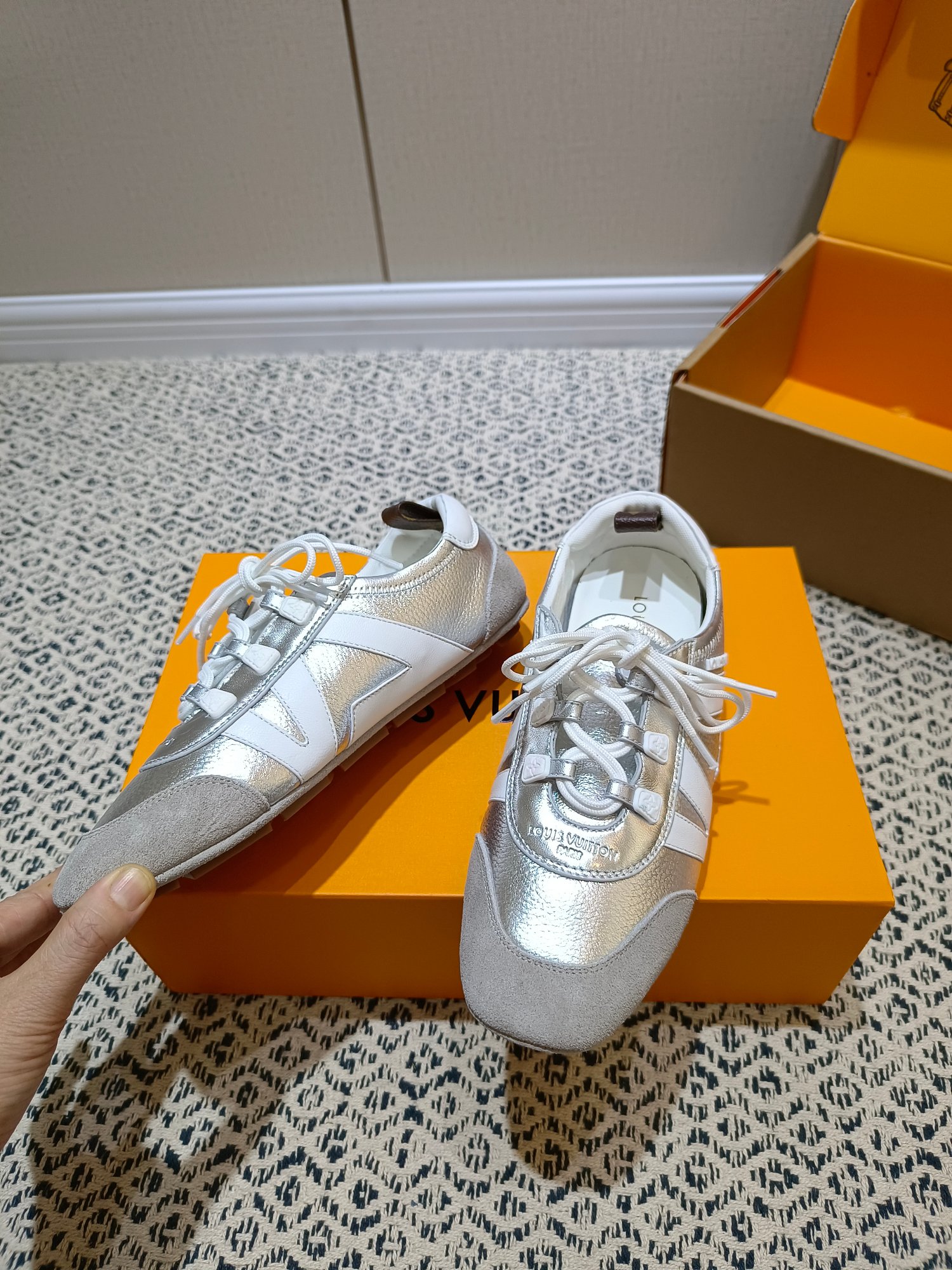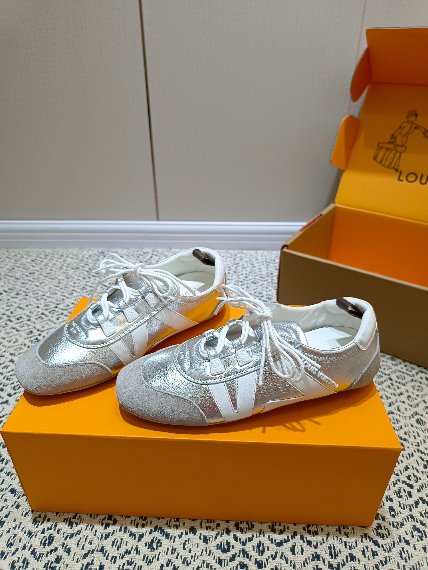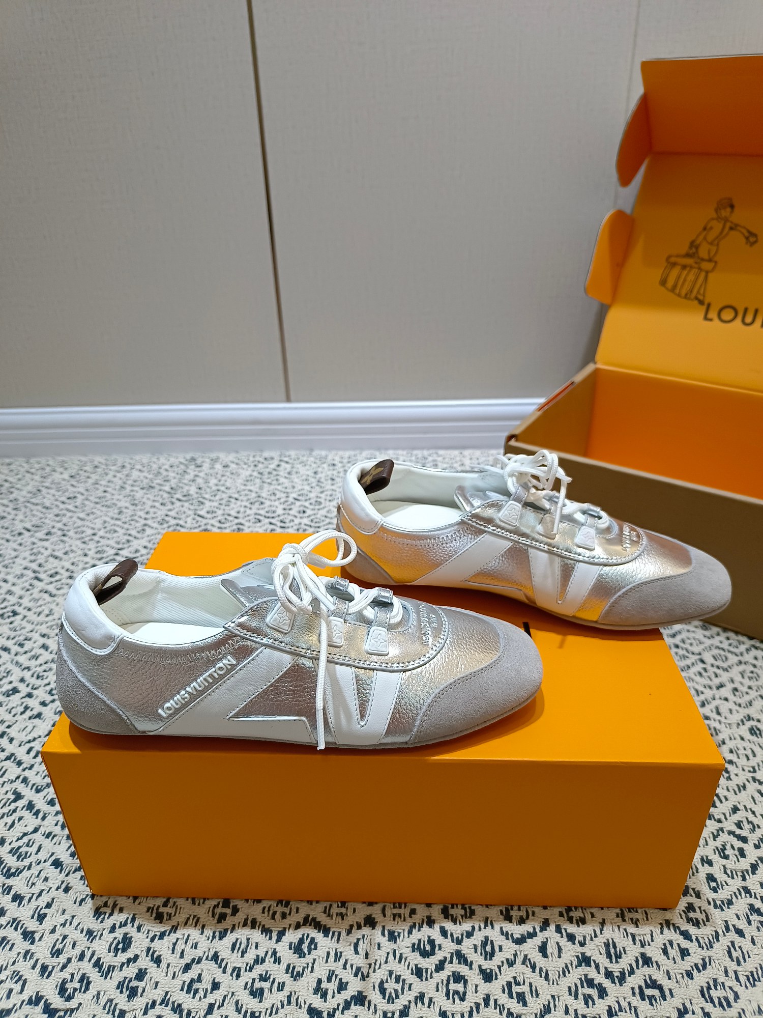 这款鞋子是AAAAA 1:1 质量 (非常棒). 使用了和原版一模一样的材料. 商标部分也保持了和路易威登/Louis Vuitton一样. 图片拍摄是实物鞋子拍摄, 您所收到的实物保证和我们图片一模一样.