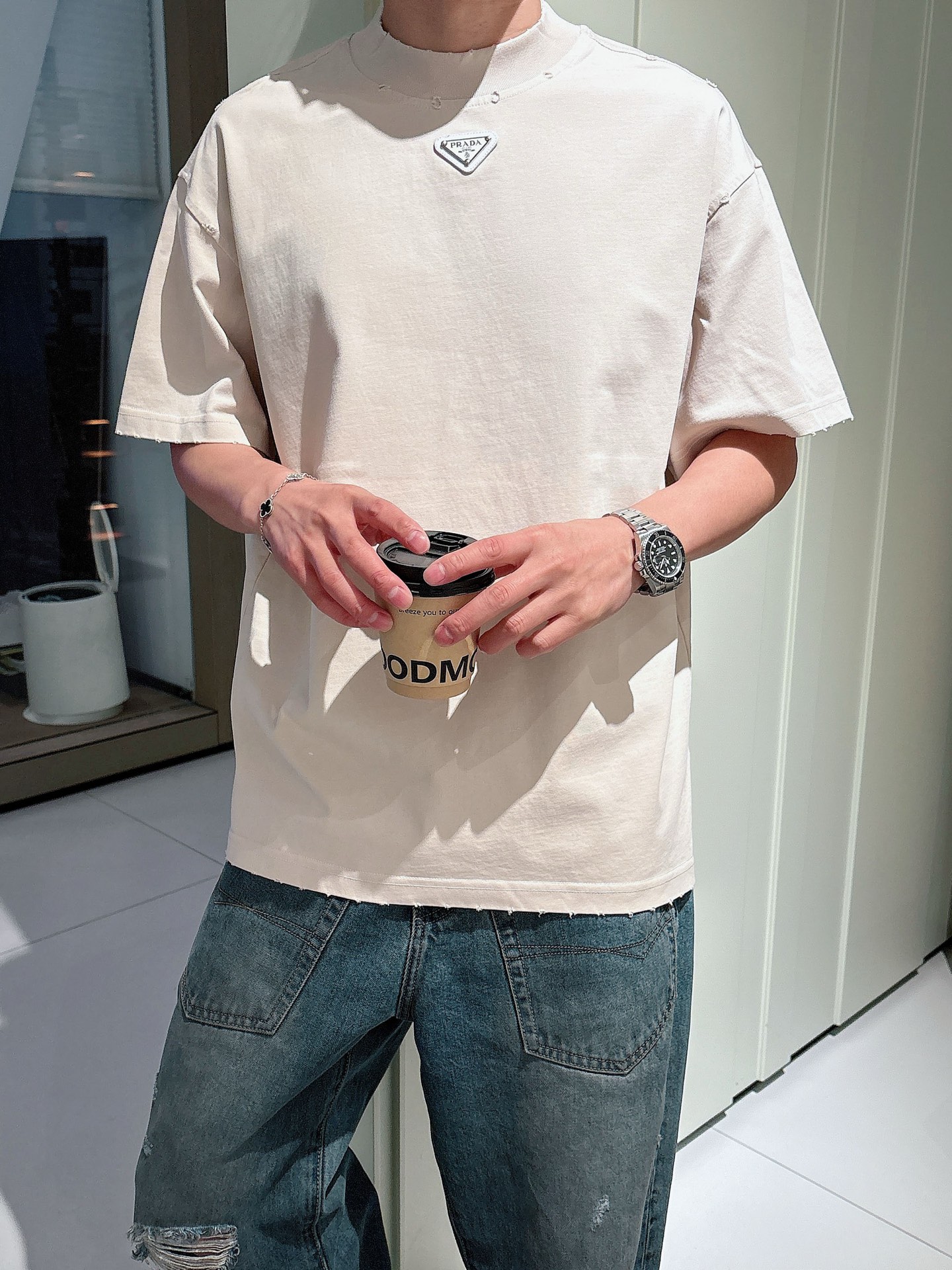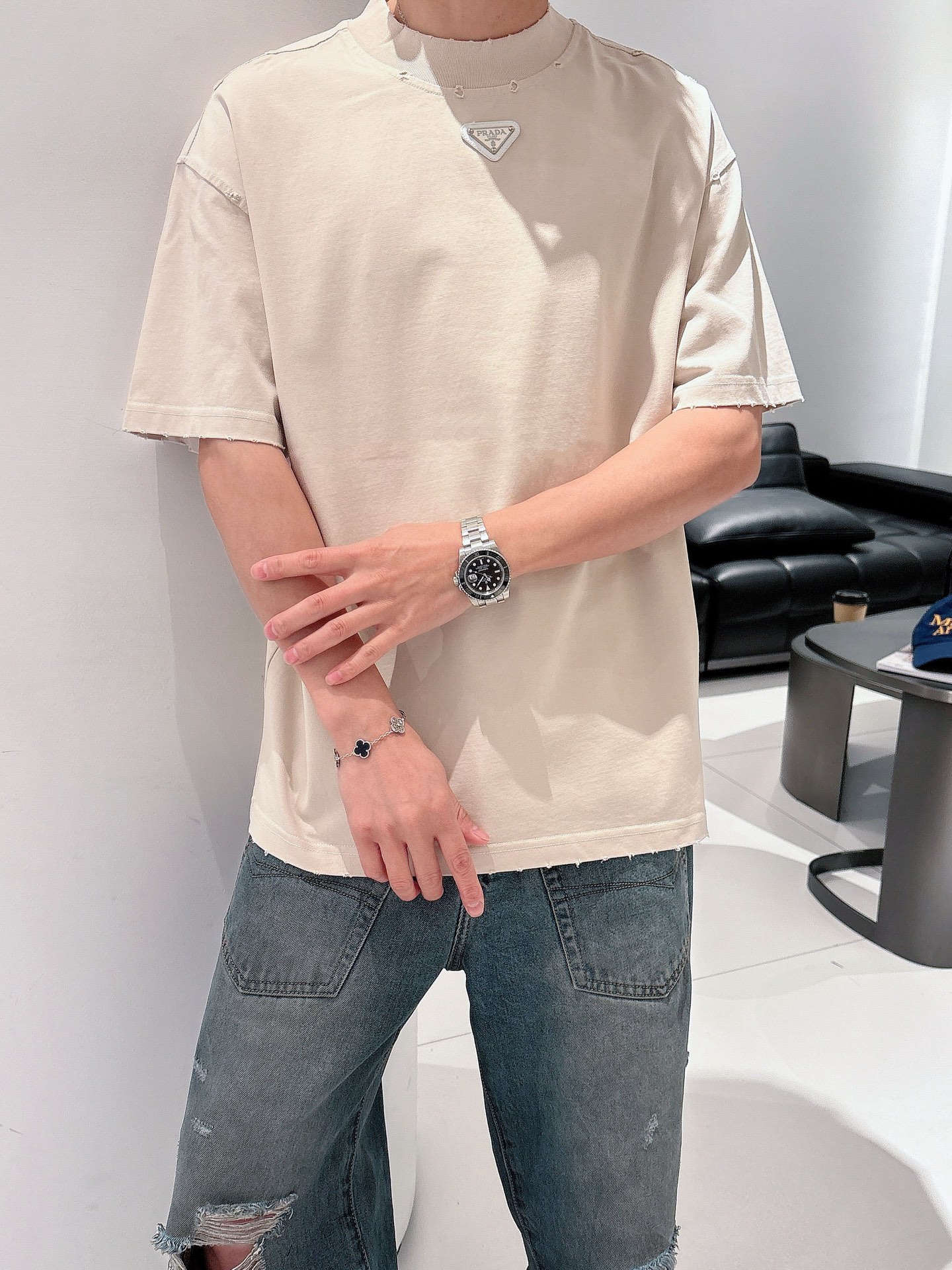 这款衣服是AAAAA 1:1 质量 (非常棒). 使用了和原版一模一样的材料. 商标部分也保持了和普拉达/Prada一样. 图片拍摄是实物衣服拍摄, 您所收到的实物保证和我们图片一模一样.