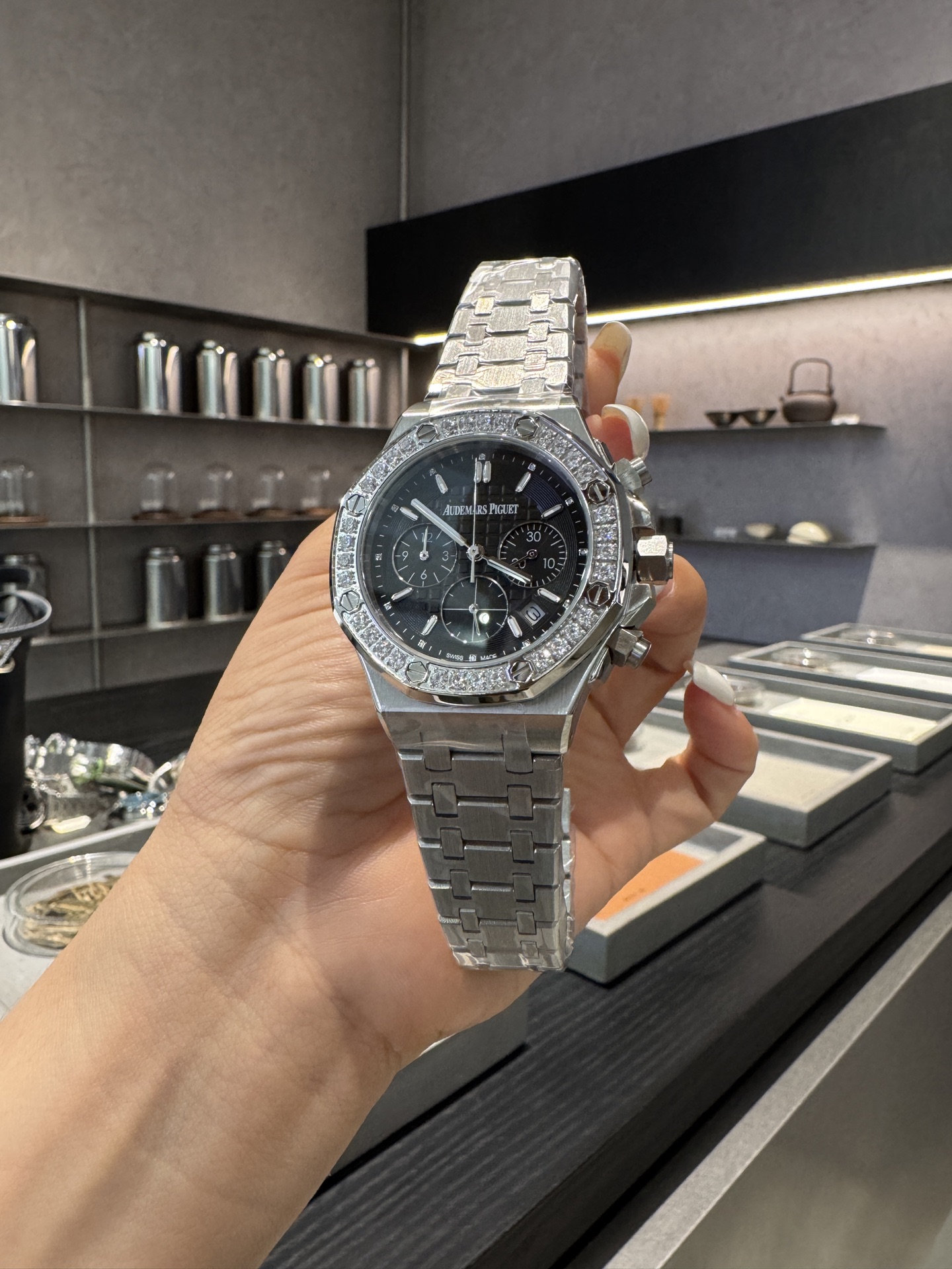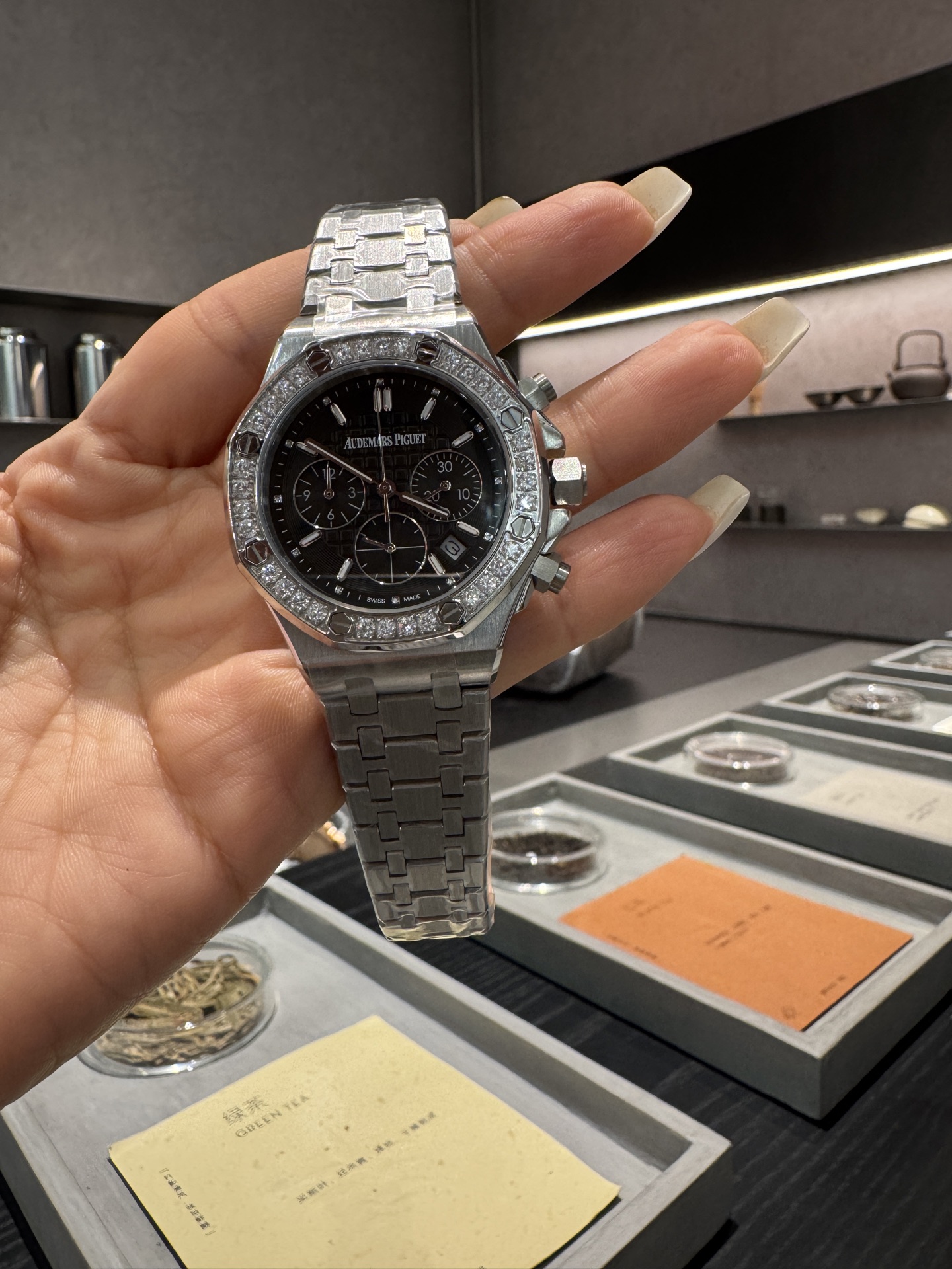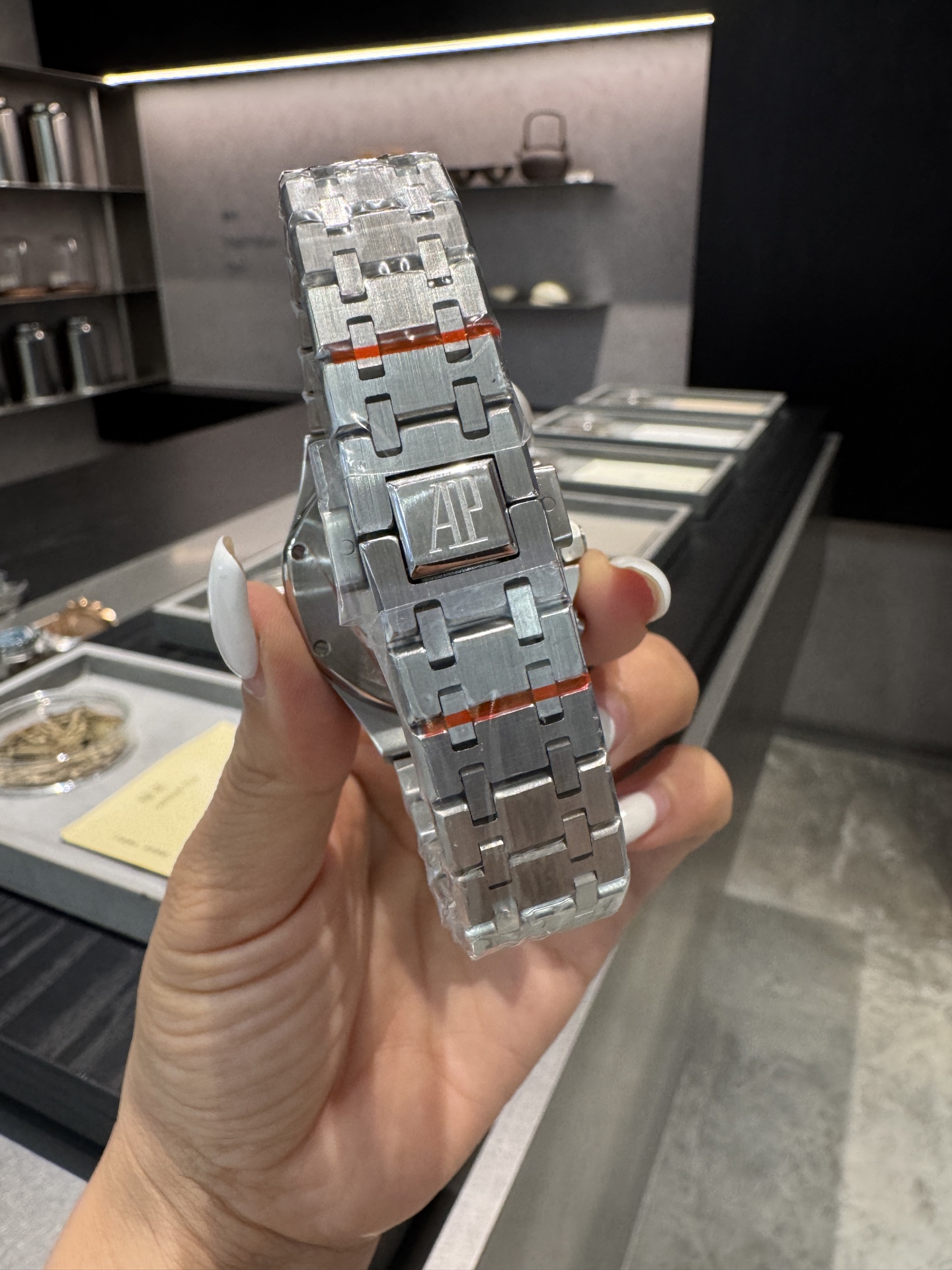 这款手表是AAAAA 1:1 质量 (非常棒). 使用了和原版一模一样的材料. 商标部分也保持了和爱彼/Audemars Piguet一样. 图片拍摄是实物手表拍摄, 您所收到的实物保证和我们图片一模一样.
