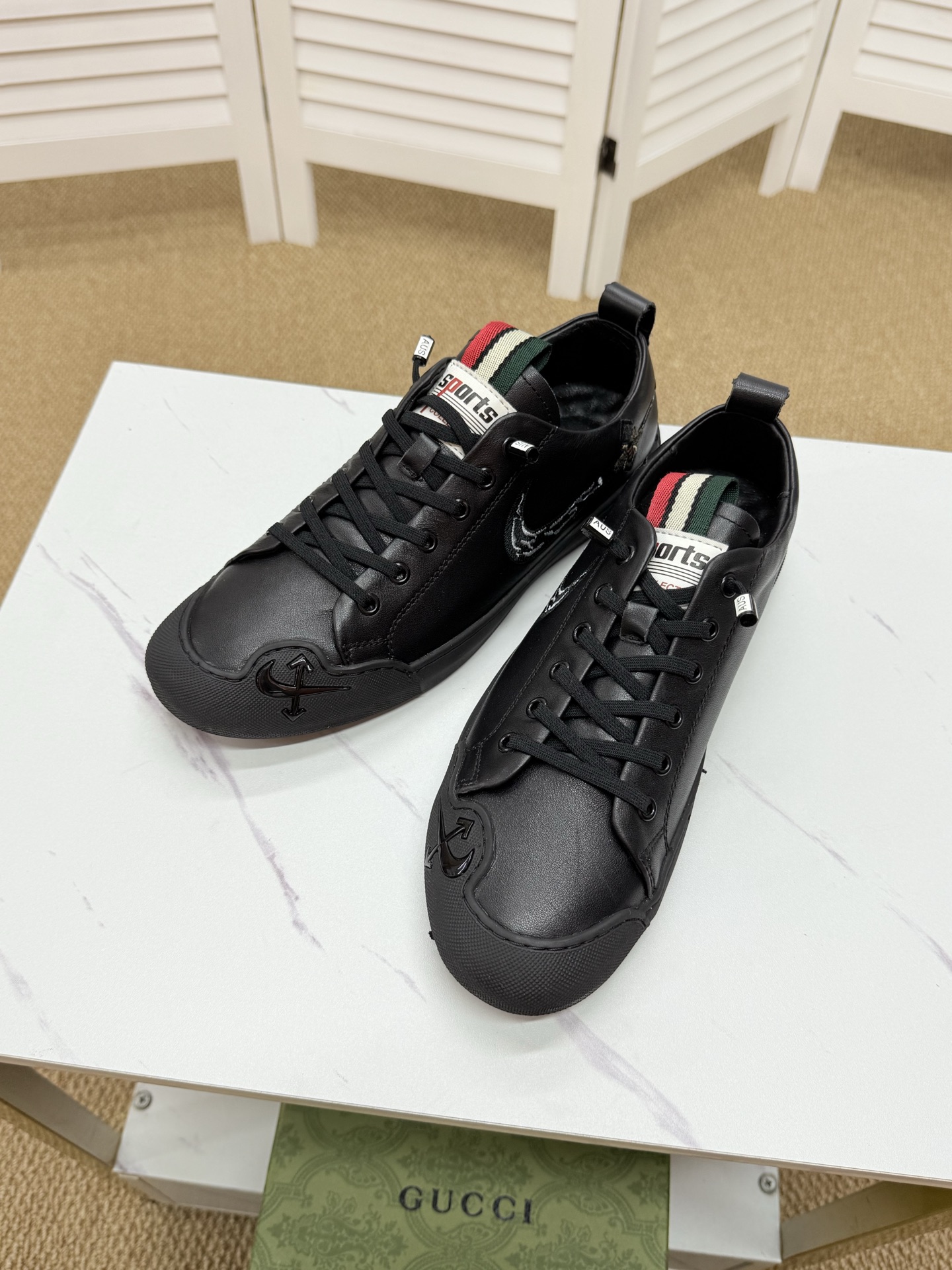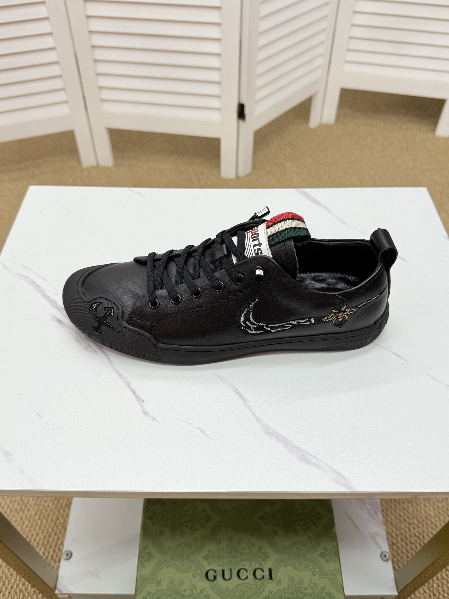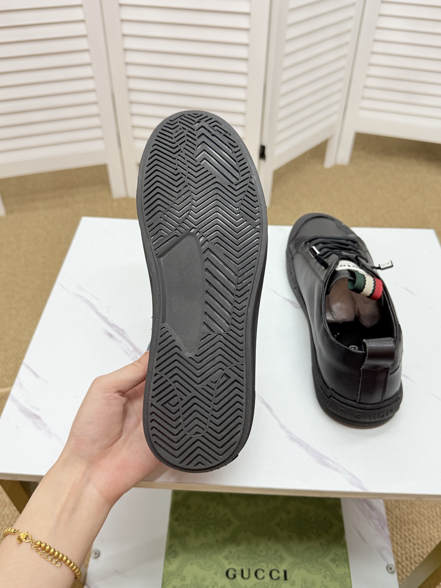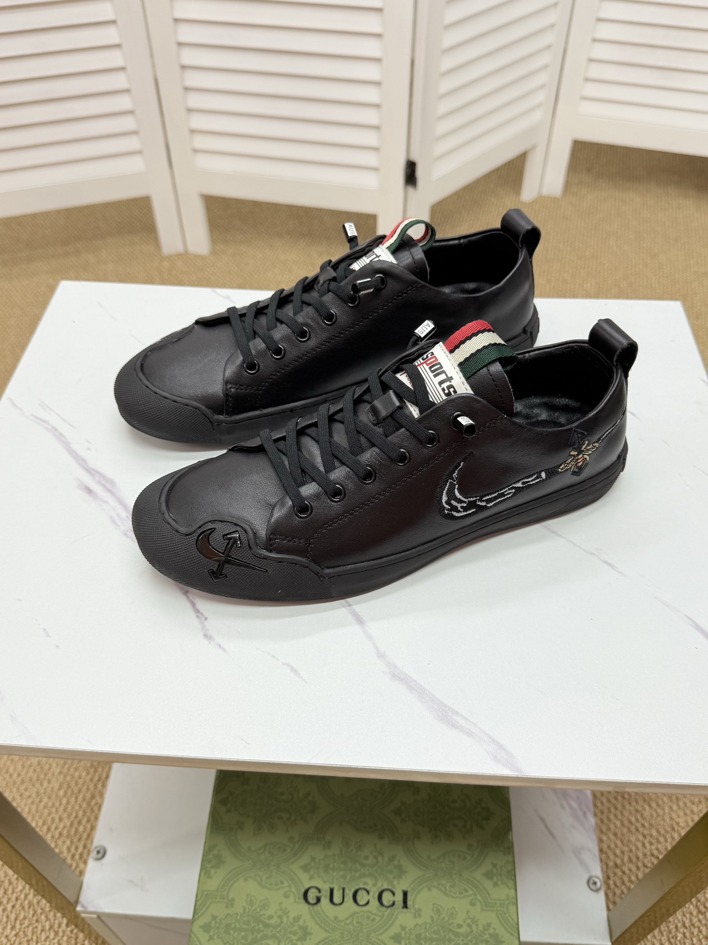 这款鞋子是AAAAA 1:1 质量 (非常棒). 使用了和原版一模一样的材料. 商标部分也保持了和古奇/Gucci一样. 图片拍摄是实物鞋子拍摄, 您所收到的实物保证和我们图片一模一样.