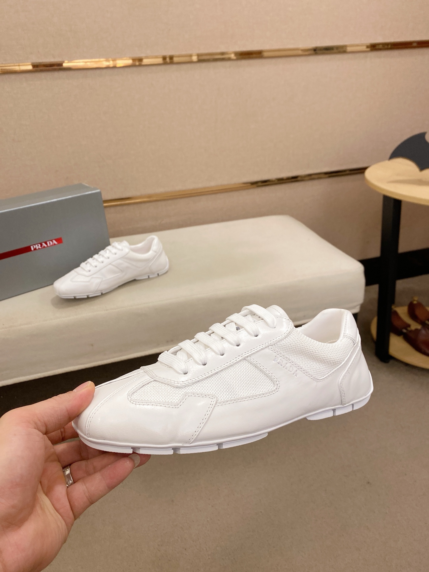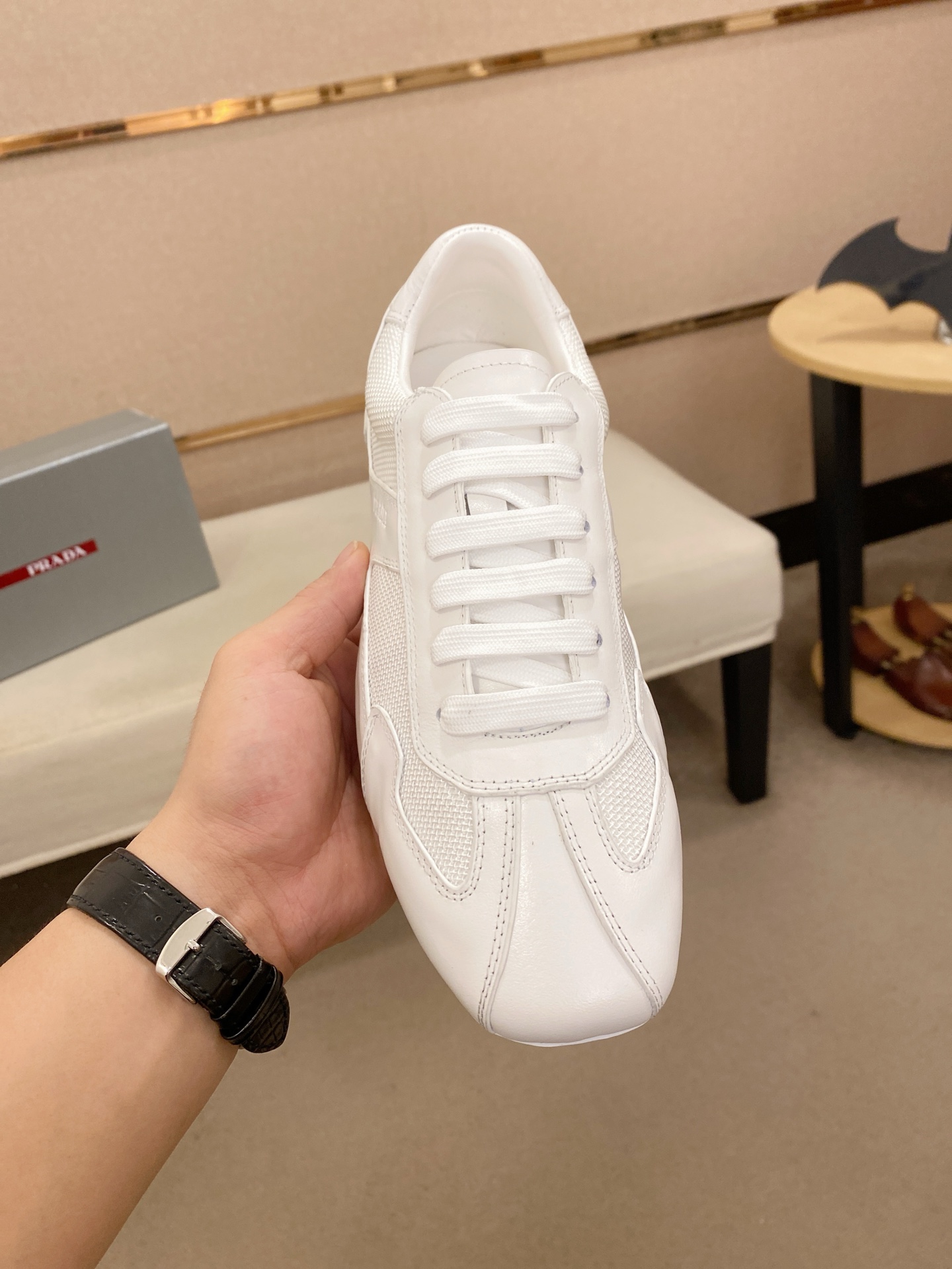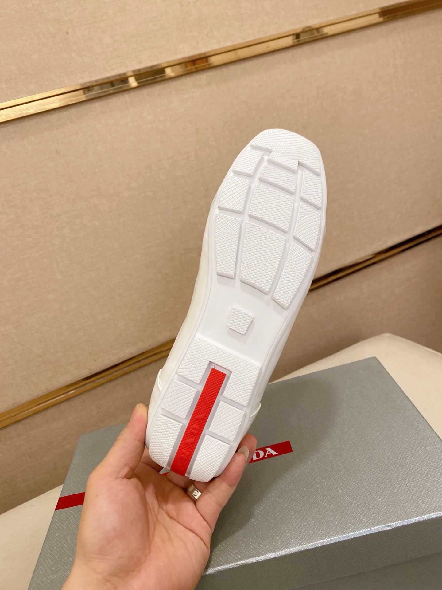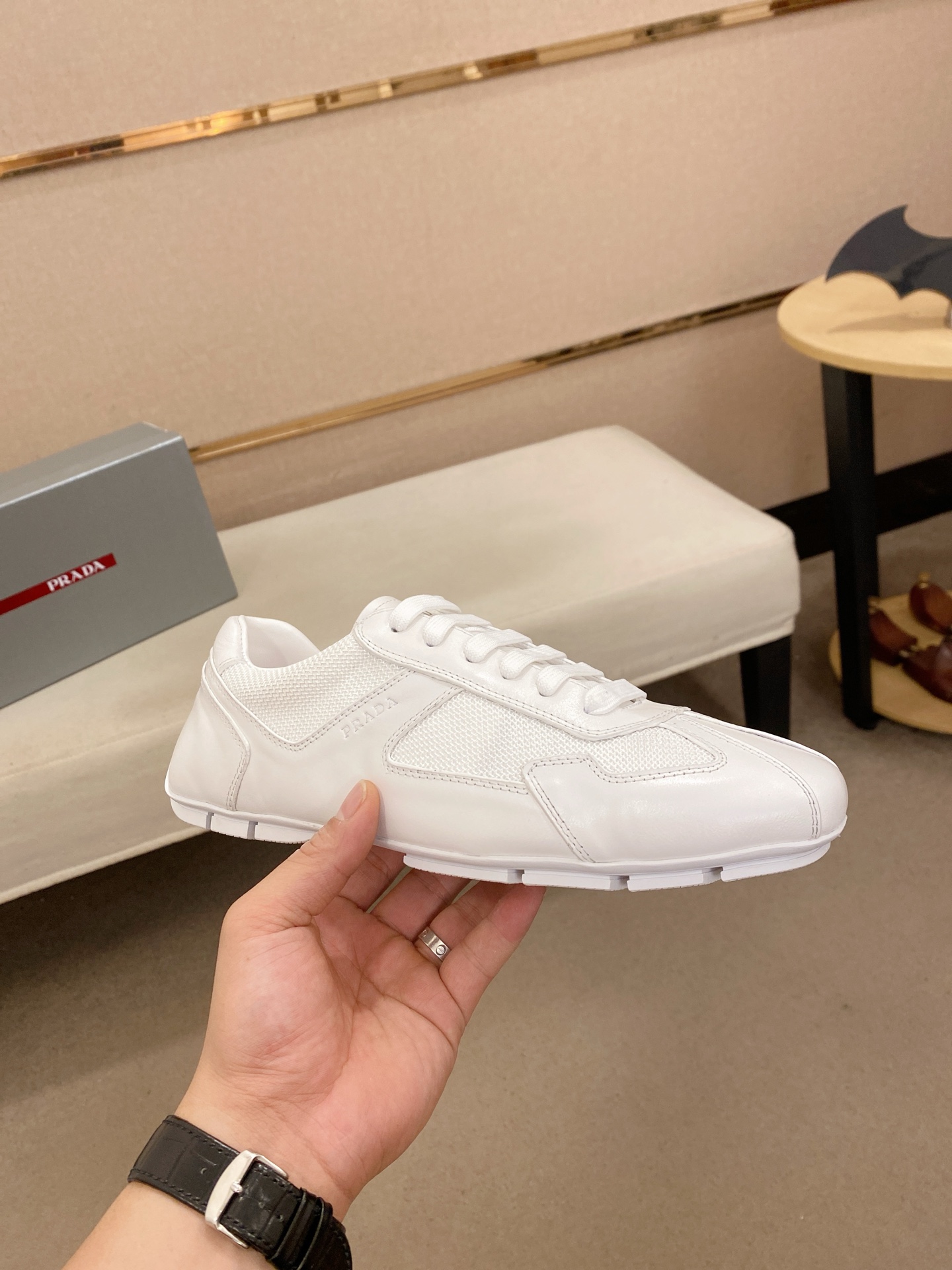 这款鞋子是AAAAA 1:1 质量 (非常棒). 使用了和原版一模一样的材料. 商标部分也保持了和普拉达/Prada一样. 图片拍摄是实物鞋子拍摄, 您所收到的实物保证和我们图片一模一样.