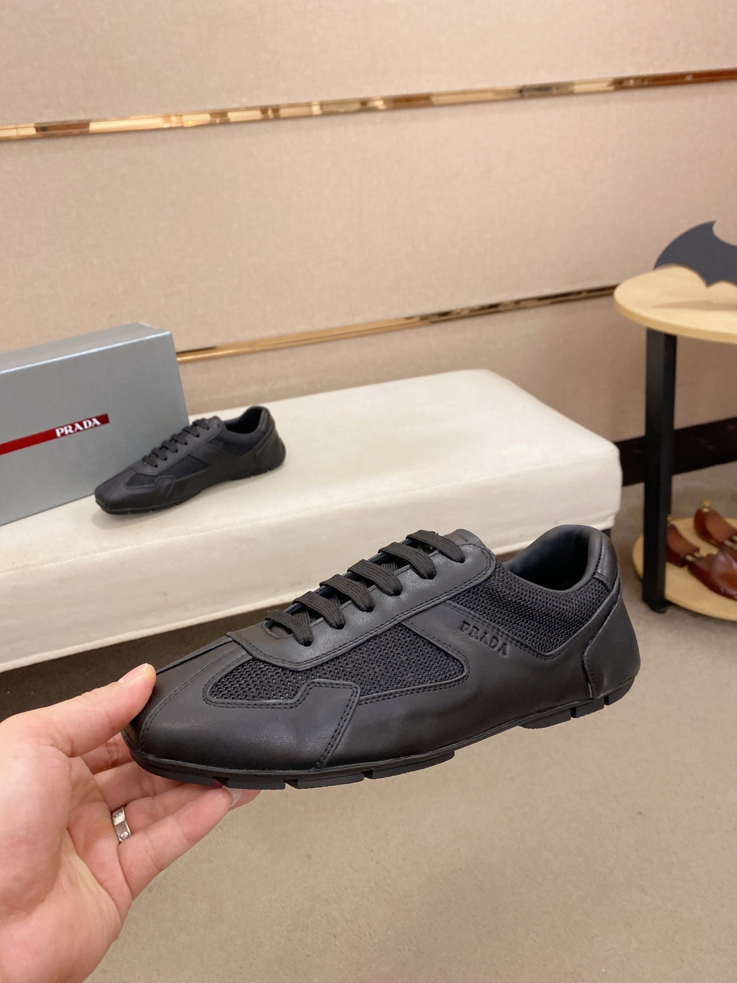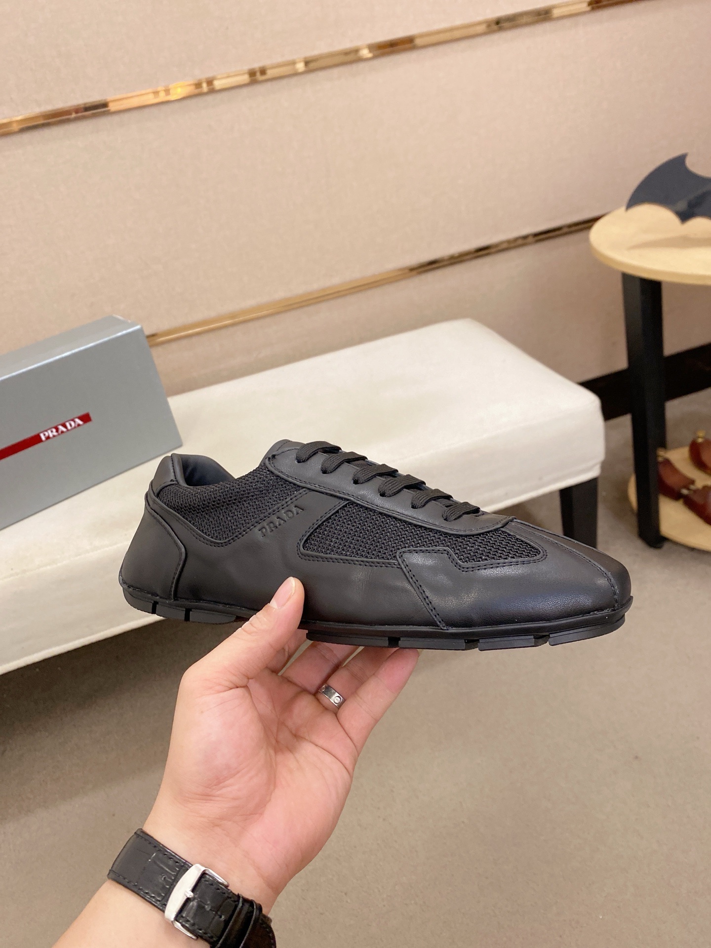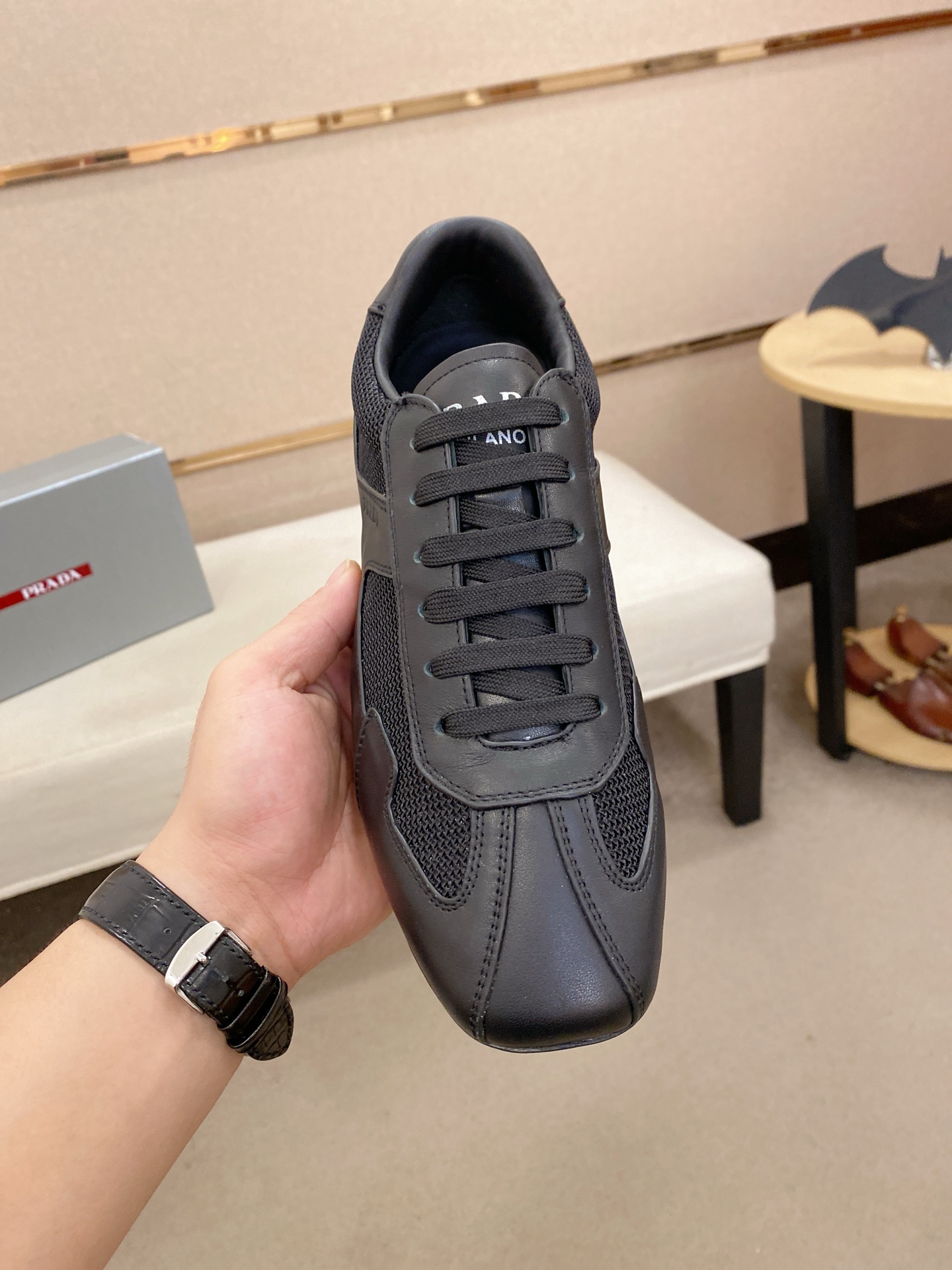 这款鞋子是AAAAA 1:1 质量 (非常棒). 使用了和原版一模一样的材料. 商标部分也保持了和普拉达/Prada一样. 图片拍摄是实物鞋子拍摄, 您所收到的实物保证和我们图片一模一样.