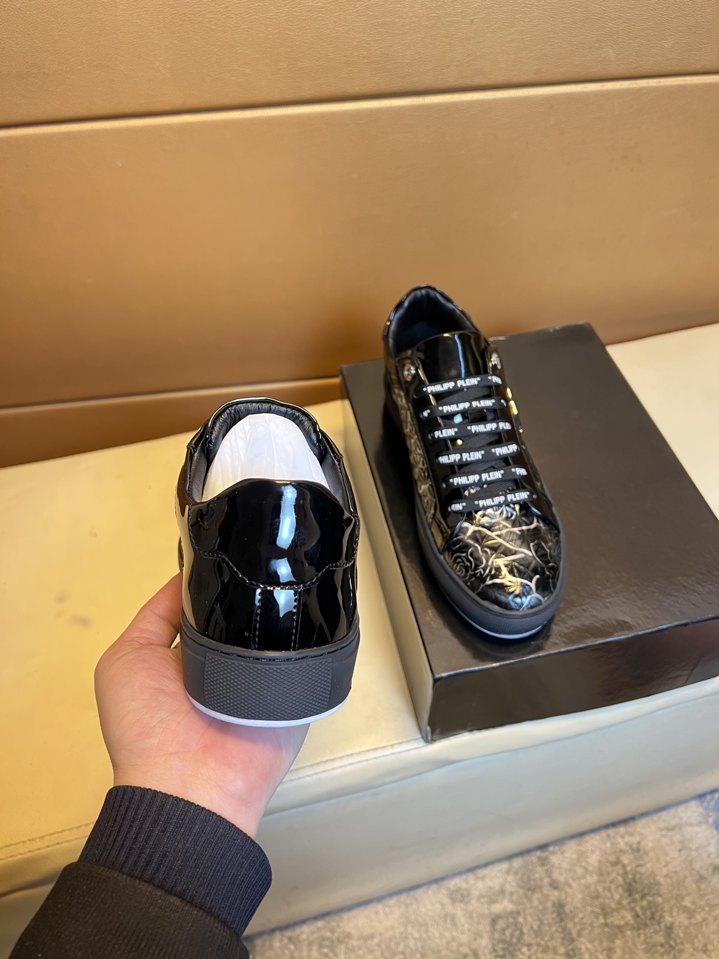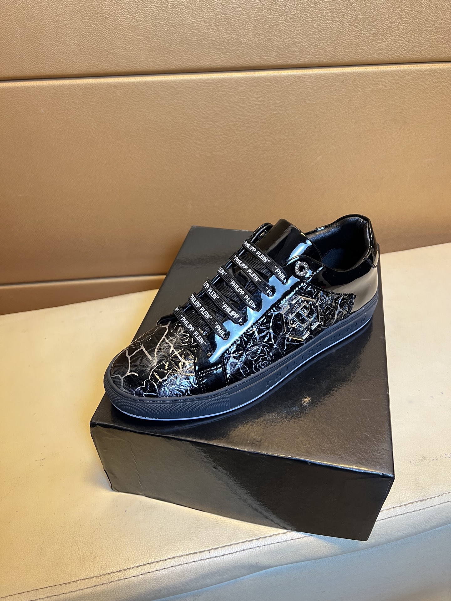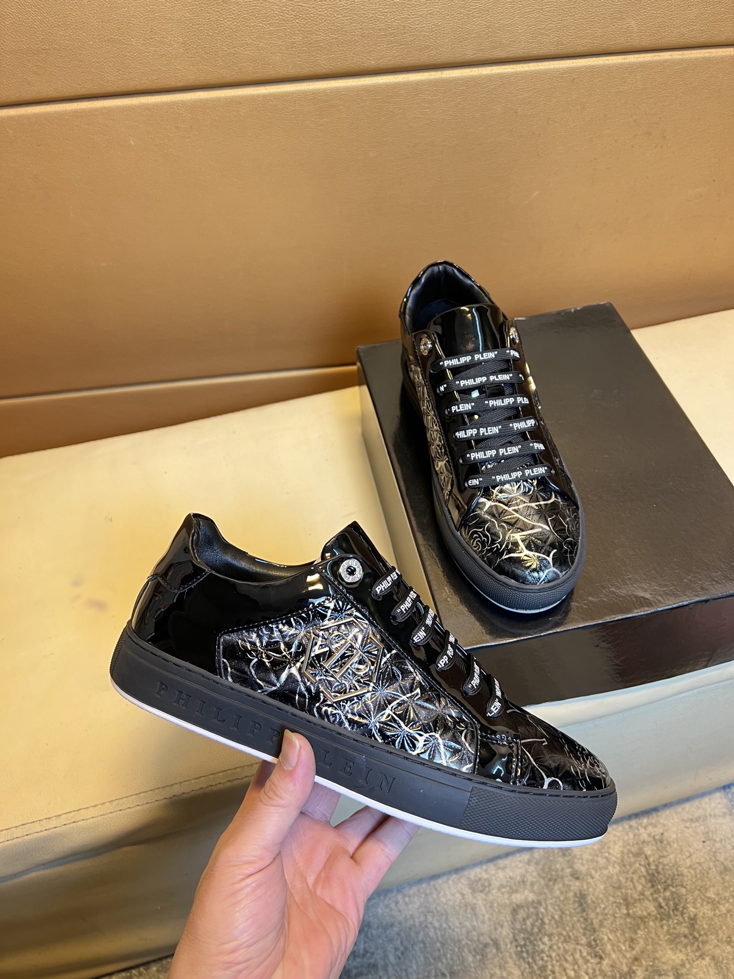 这款鞋子是AAAAA 1:1 质量 (非常棒). 使用了和原版一模一样的材料. 商标部分也保持了和菲利普·普林/Philipp Plein一样. 图片拍摄是实物鞋子拍摄, 您所收到的实物保证和我们图片一模一样.