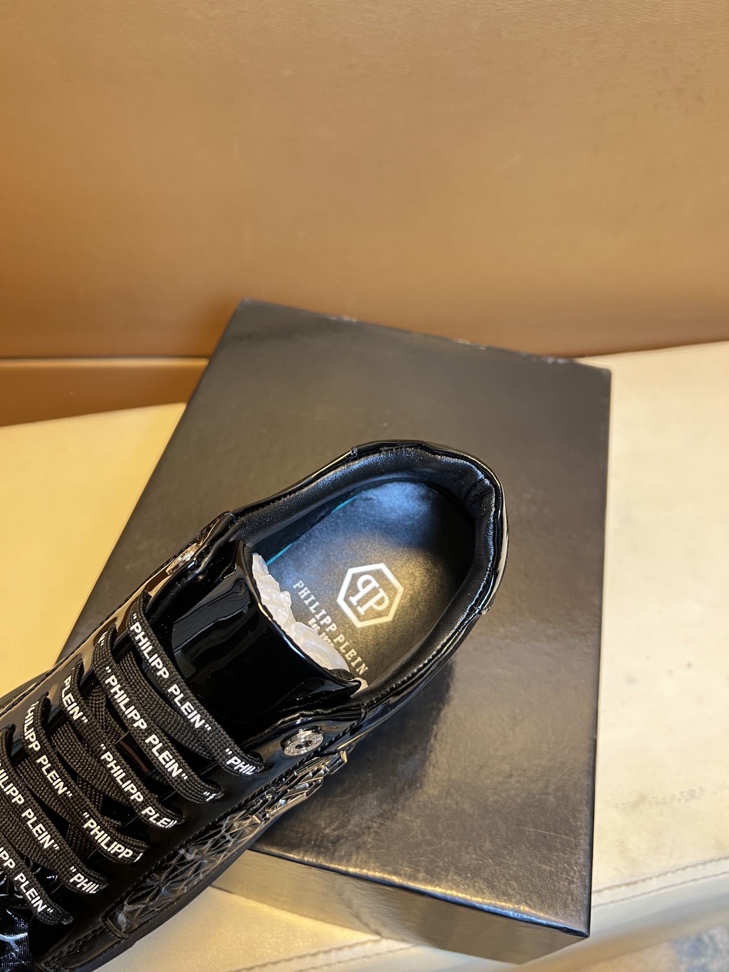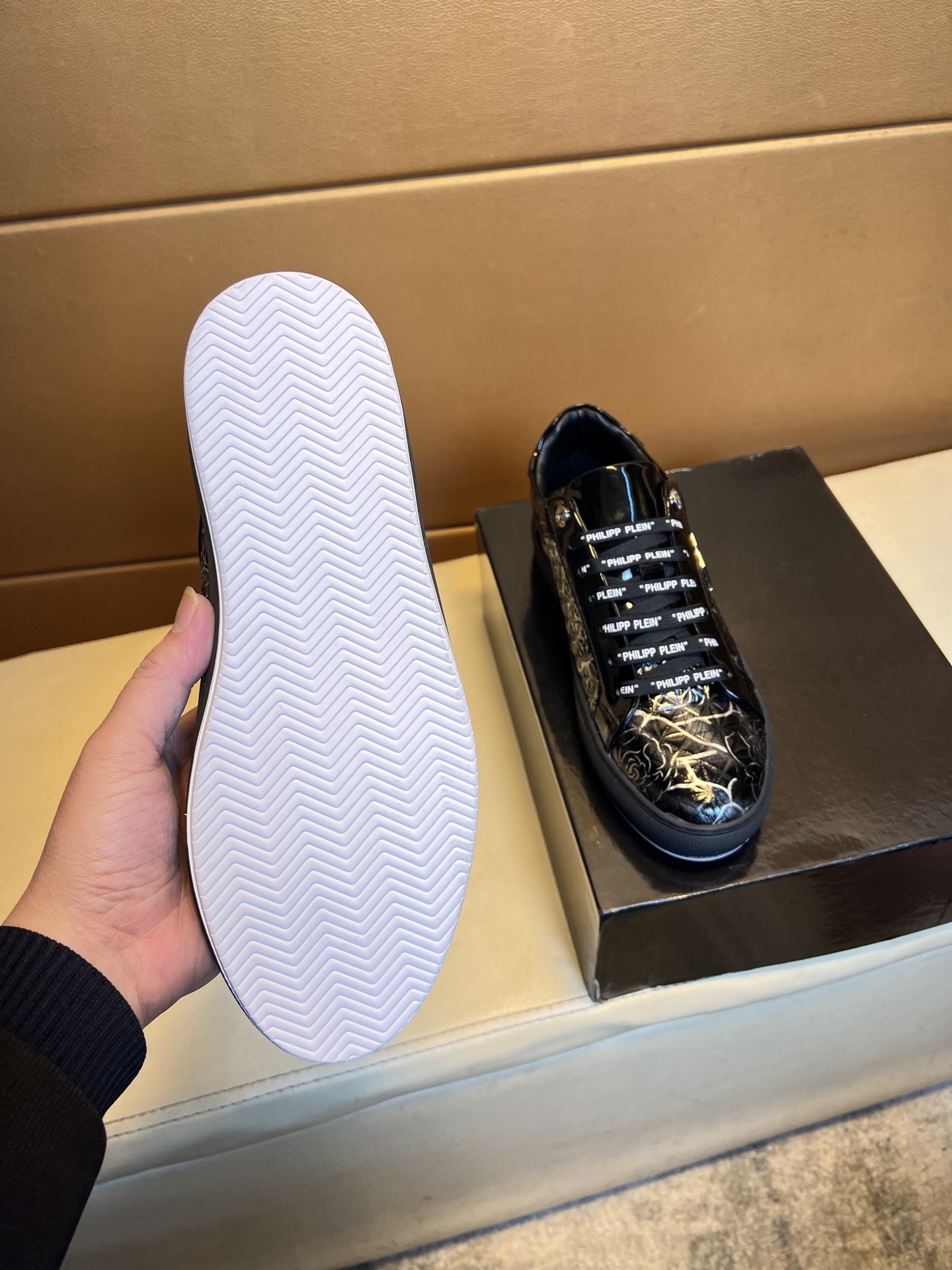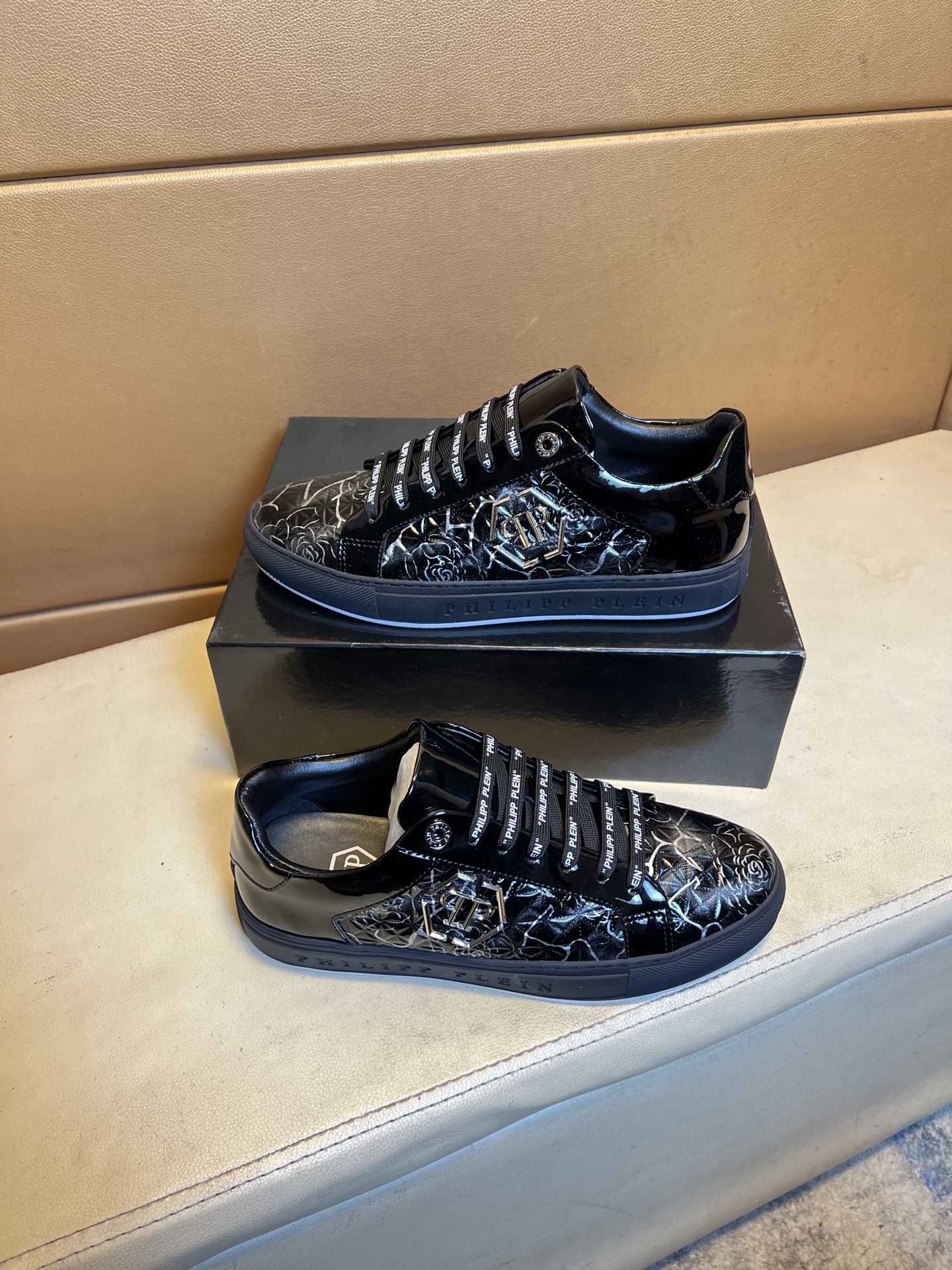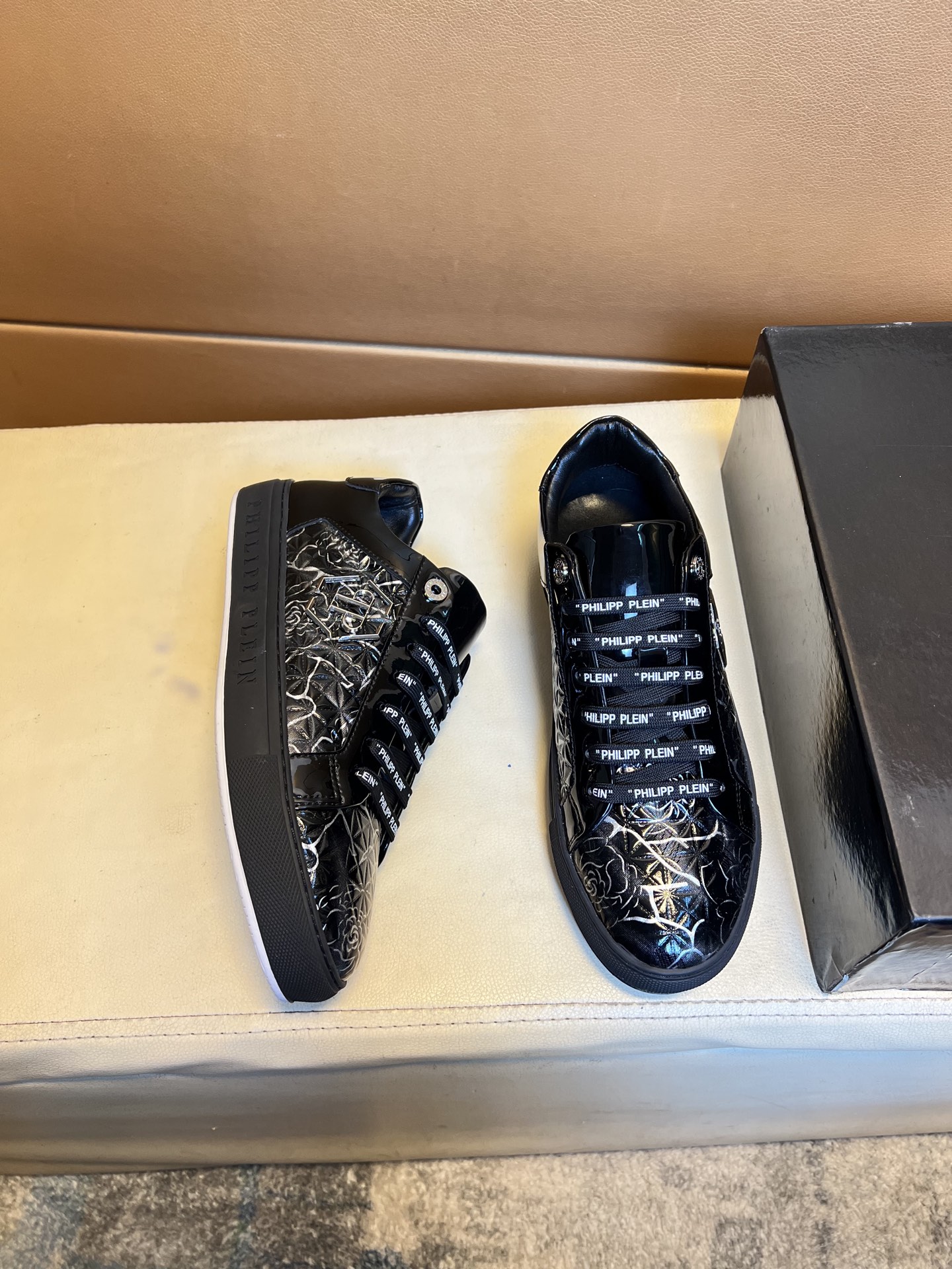 这款鞋子是AAAAA 1:1 质量 (非常棒). 使用了和原版一模一样的材料. 商标部分也保持了和菲利普·普林/Philipp Plein一样. 图片拍摄是实物鞋子拍摄, 您所收到的实物保证和我们图片一模一样.