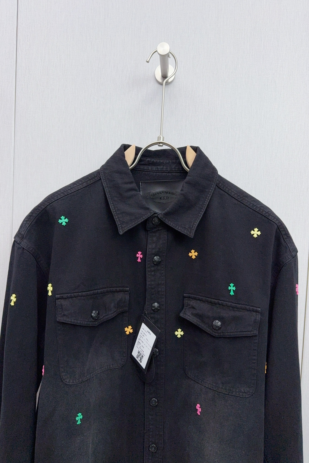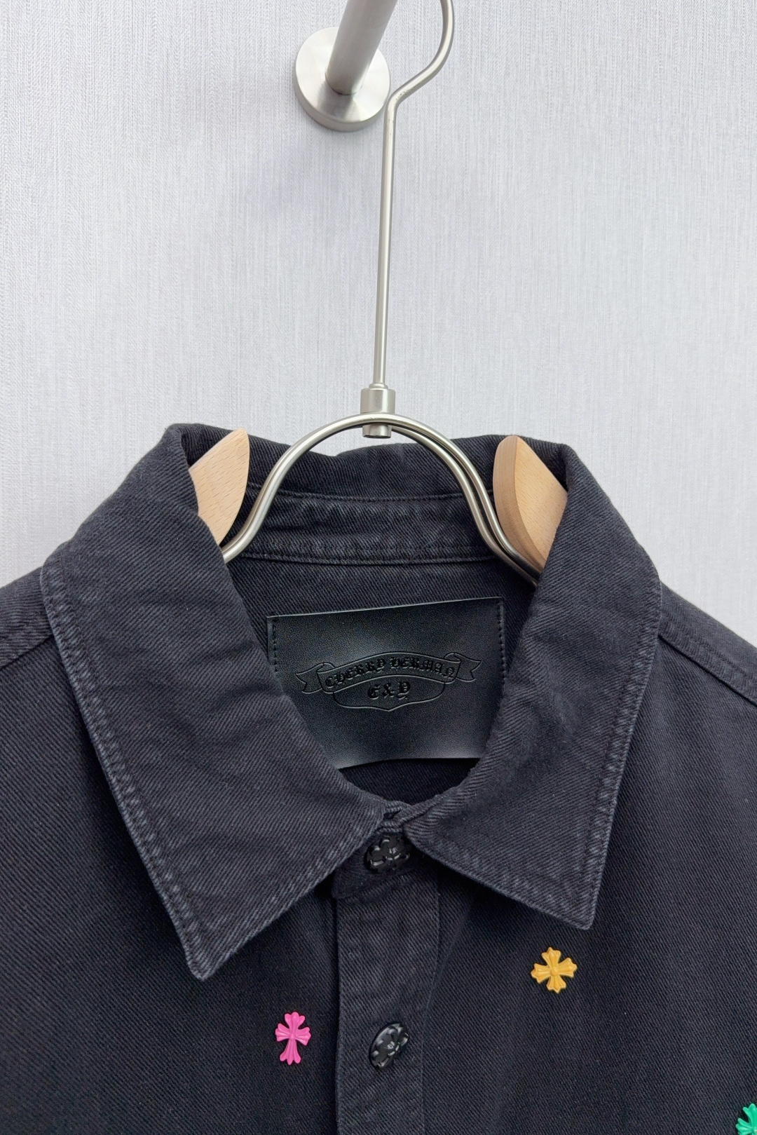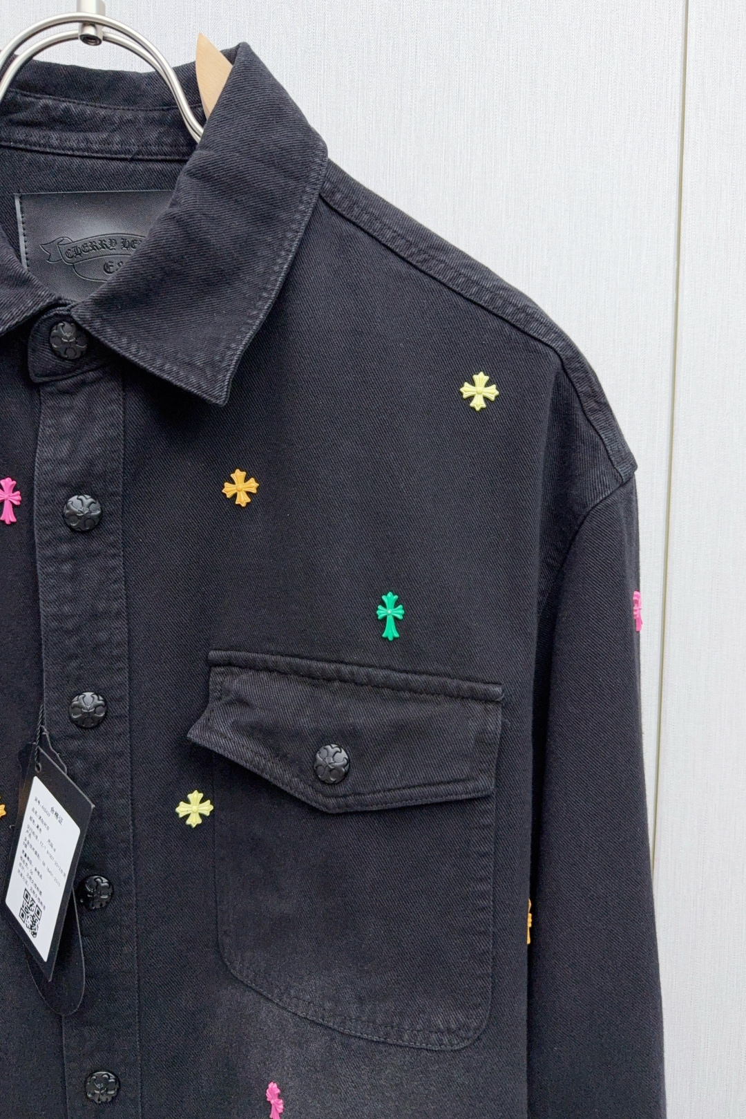 这款衣服是AAAAA 1:1 质量 (非常棒). 使用了和原版一模一样的材料. 商标部分也保持了和克罗心/Chrome Hearts一样. 图片拍摄是实物衣服拍摄, 您所收到的实物保证和我们图片一模一样.