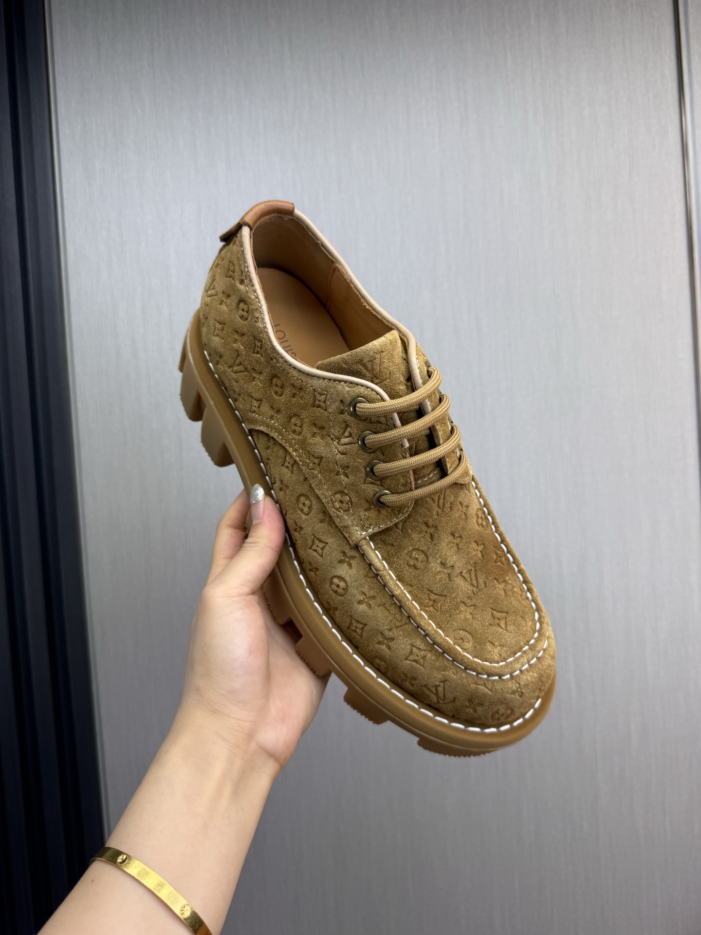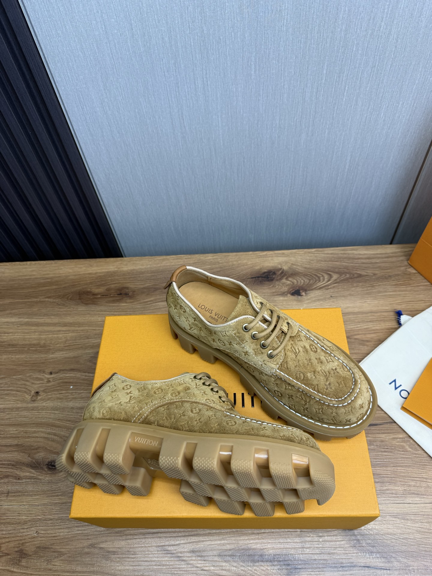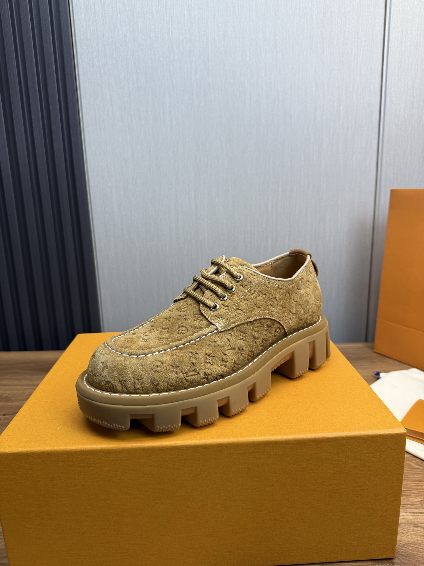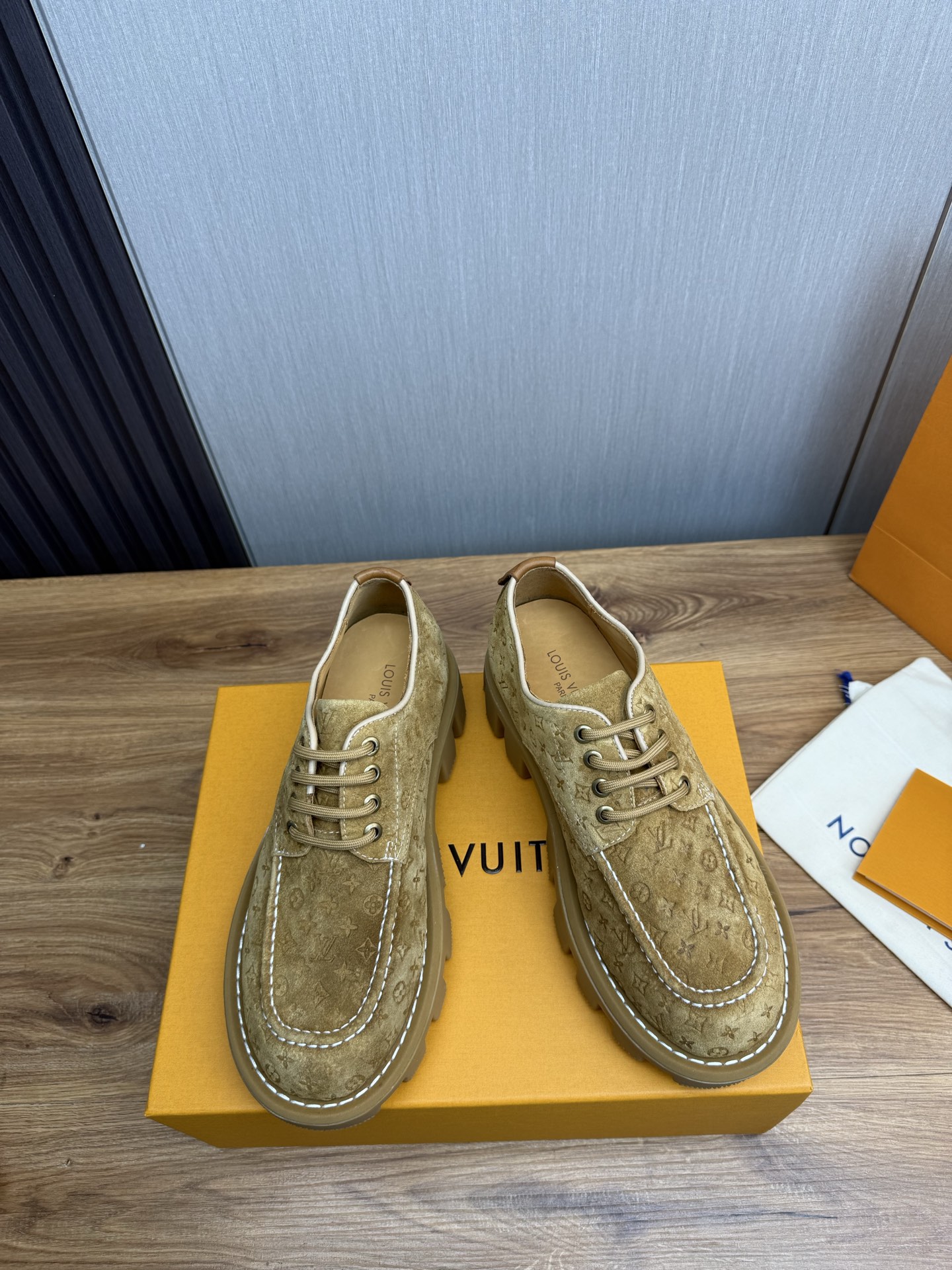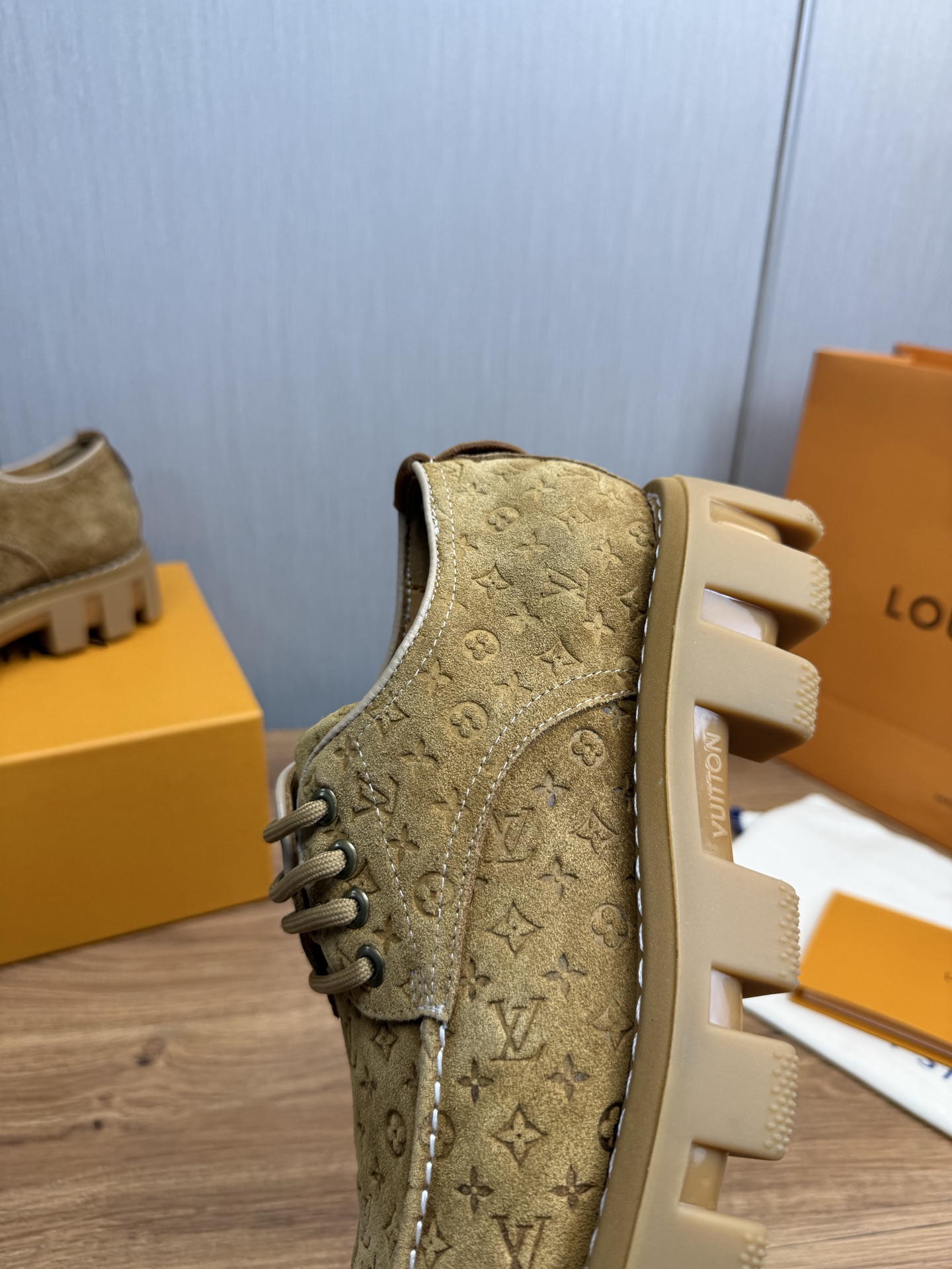 这款鞋子是AAAAA 1:1 质量 (非常棒). 使用了和原版一模一样的材料. 商标部分也保持了和路易威登/Louis Vuitton一样. 图片拍摄是实物鞋子拍摄, 您所收到的实物保证和我们图片一模一样.