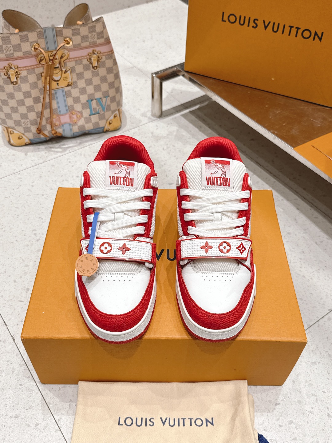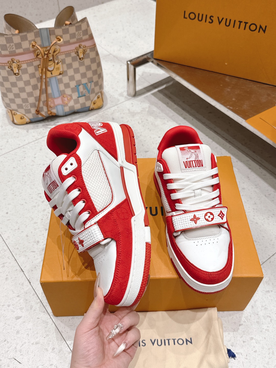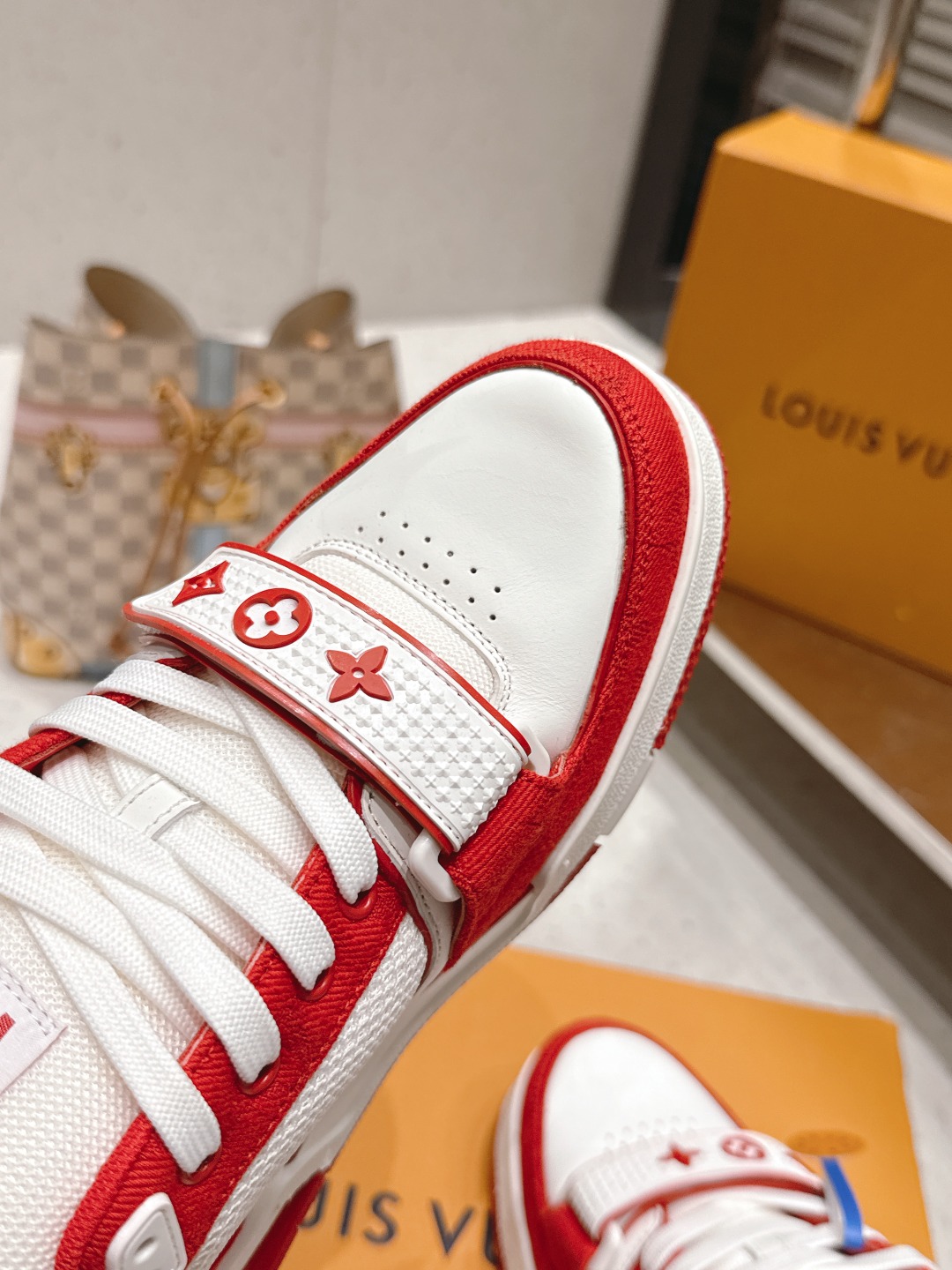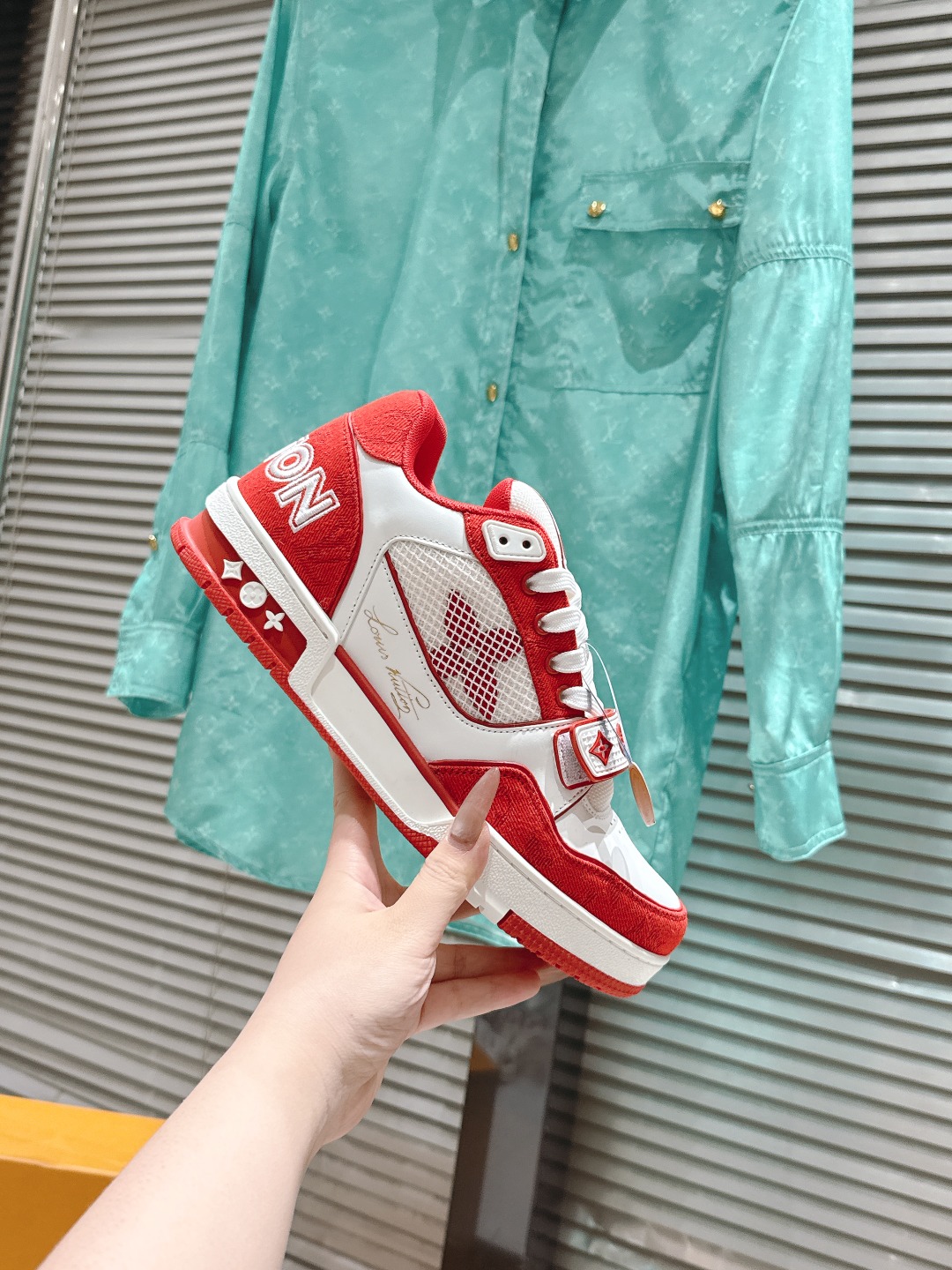 这款鞋子是AAAAA 1:1 质量 (非常棒). 使用了和原版一模一样的材料. 商标部分也保持了和路易威登/Louis Vuitton一样. 图片拍摄是实物鞋子拍摄, 您所收到的实物保证和我们图片一模一样.