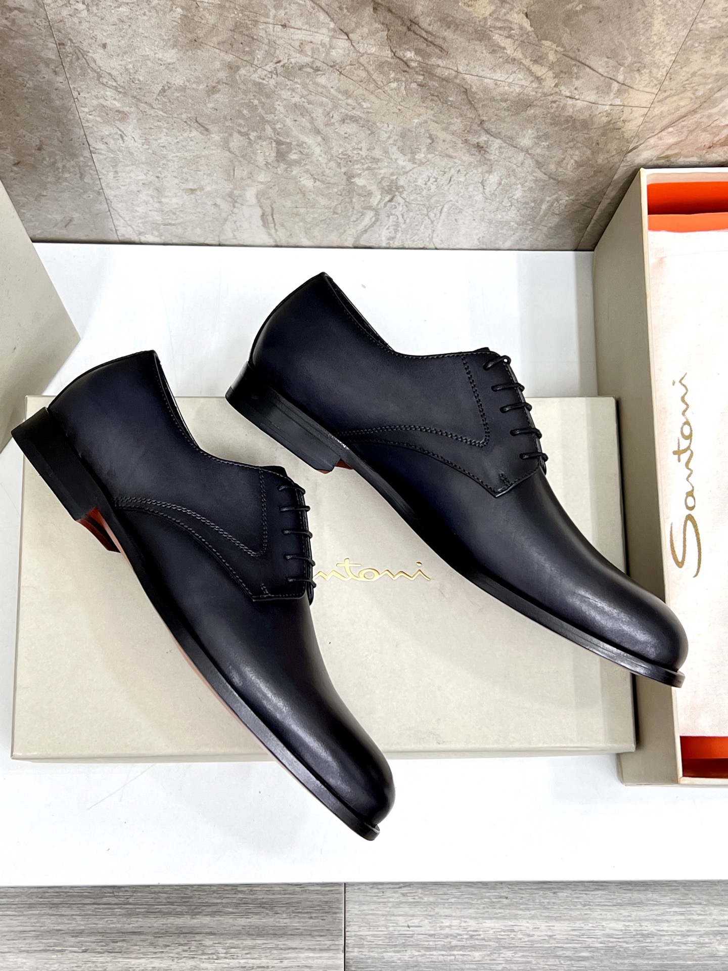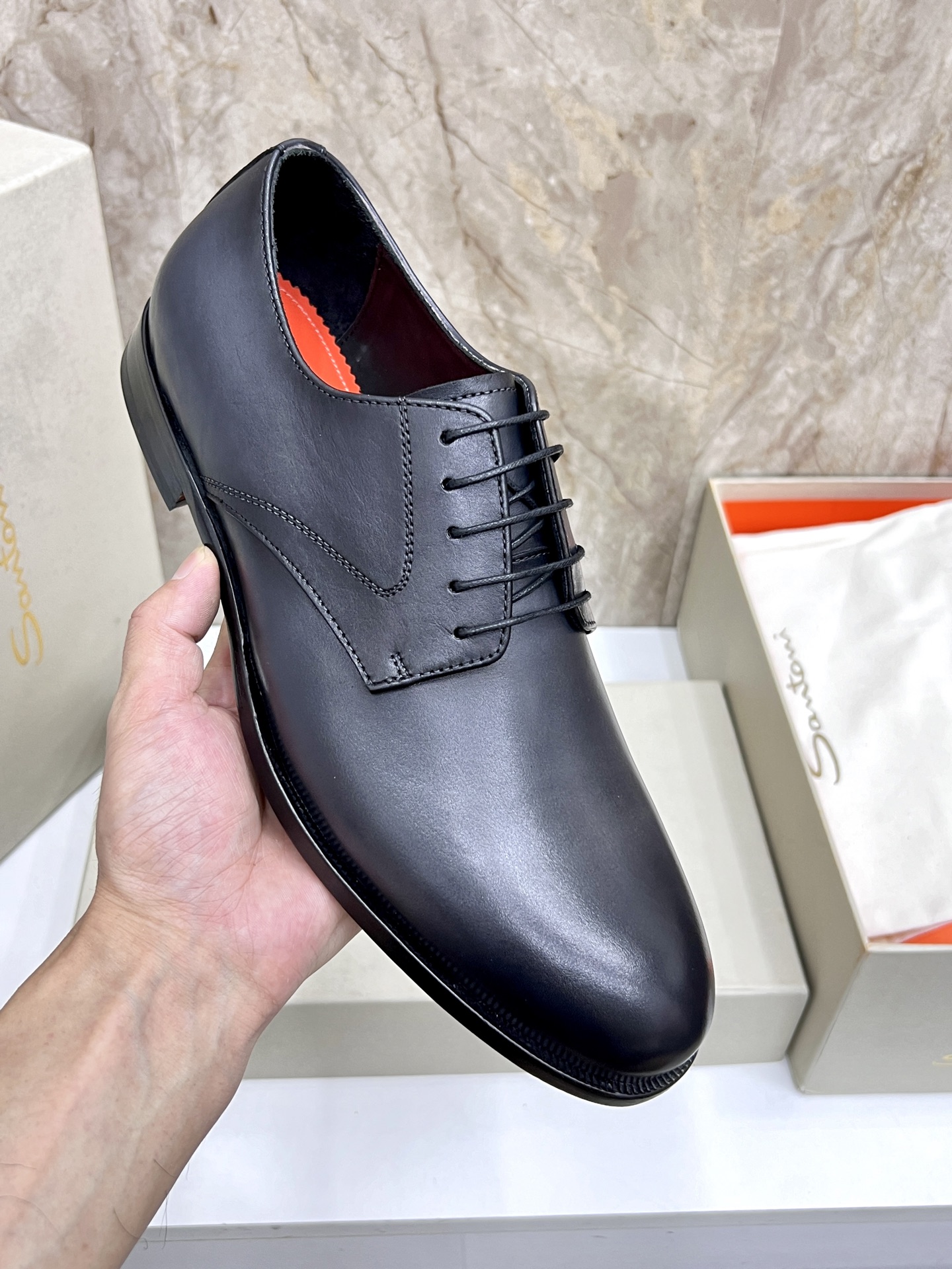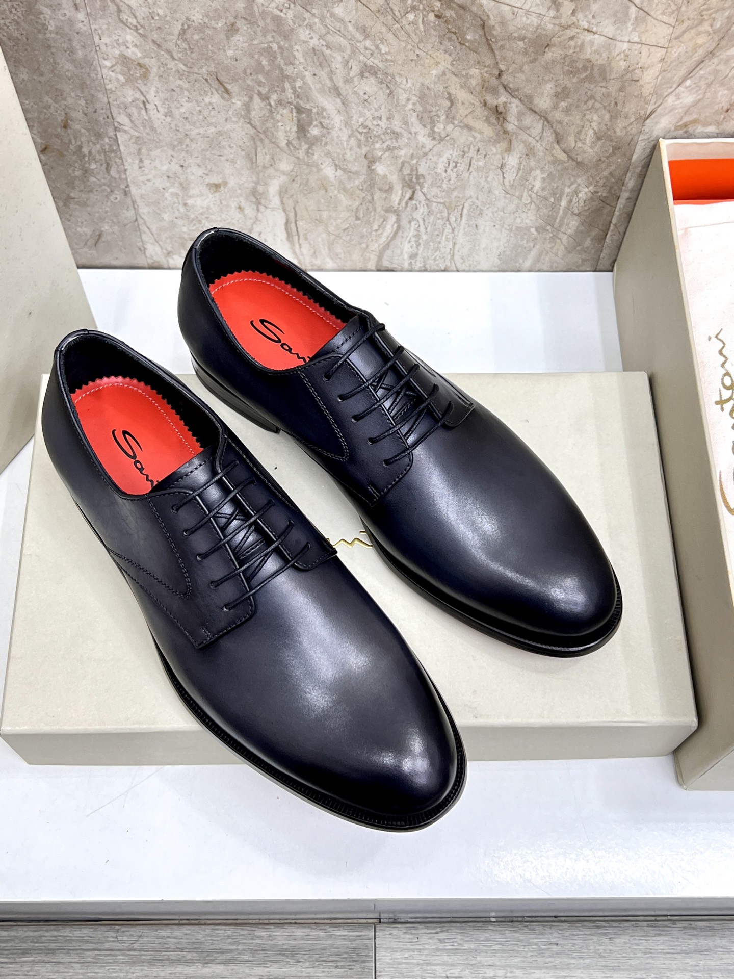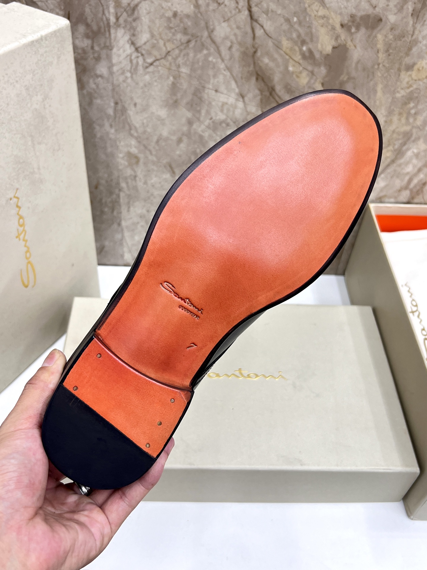 这款鞋子是AAAAA 1:1 质量 (非常棒). 使用了和原版一模一样的材料. 商标部分也保持了和Santoni一样. 图片拍摄是实物鞋子拍摄, 您所收到的实物保证和我们图片一模一样.